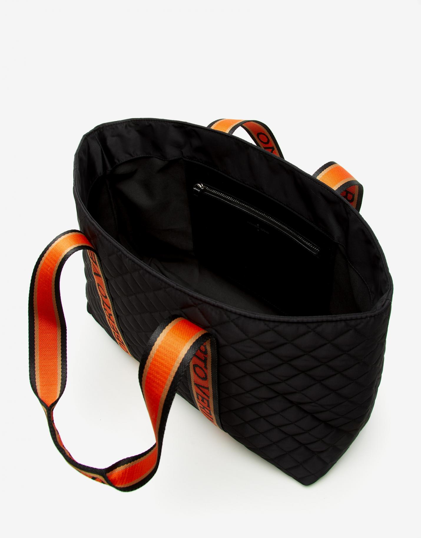 Bolso shopper de construcción soft fabricado en nailon acolchado color negro. Asa de mano con cinta personalizada que continúa en el cuerpo del bolso. Interior forrado y compartimentado. Acabados metálicos plateados. Medidas aproxi…