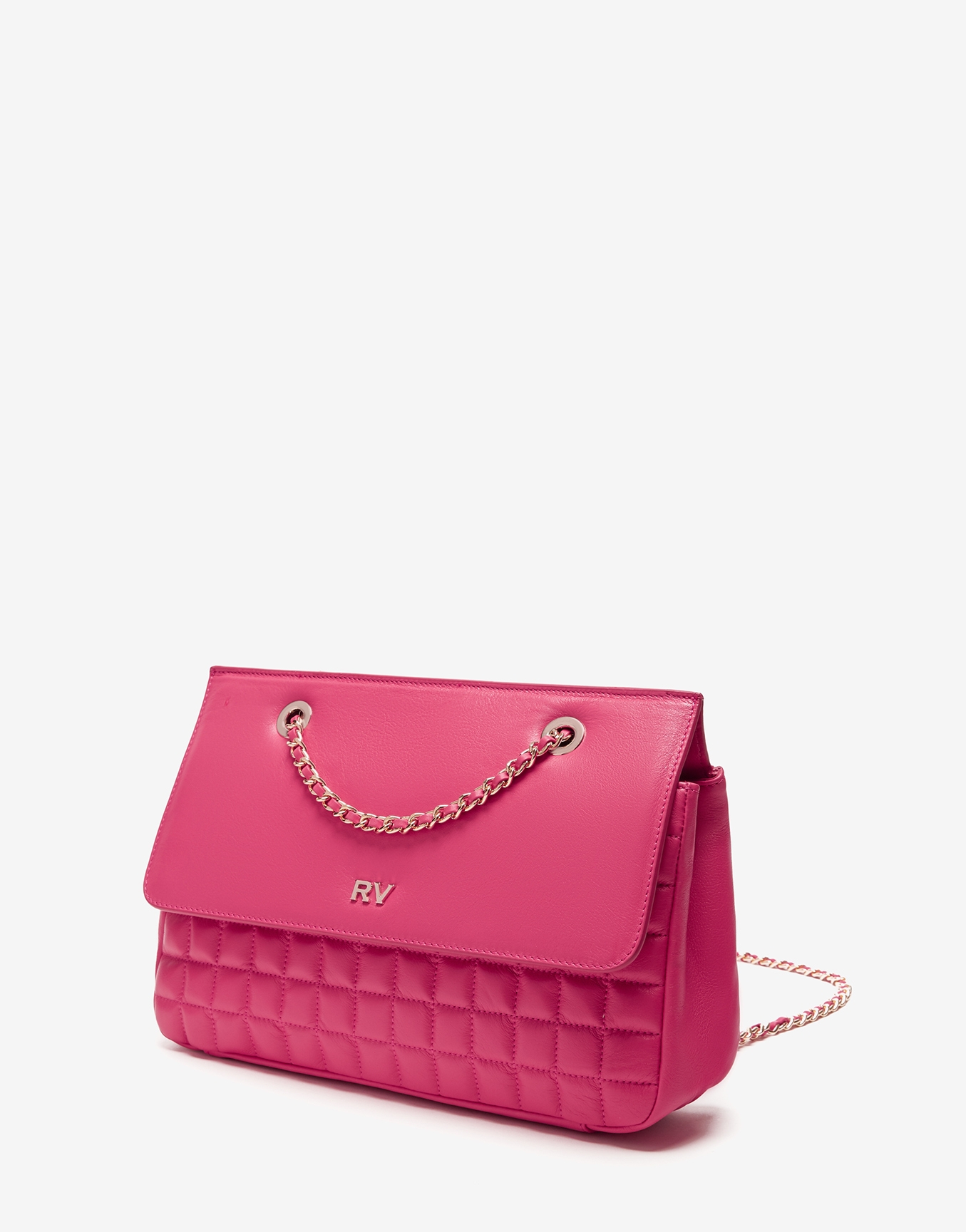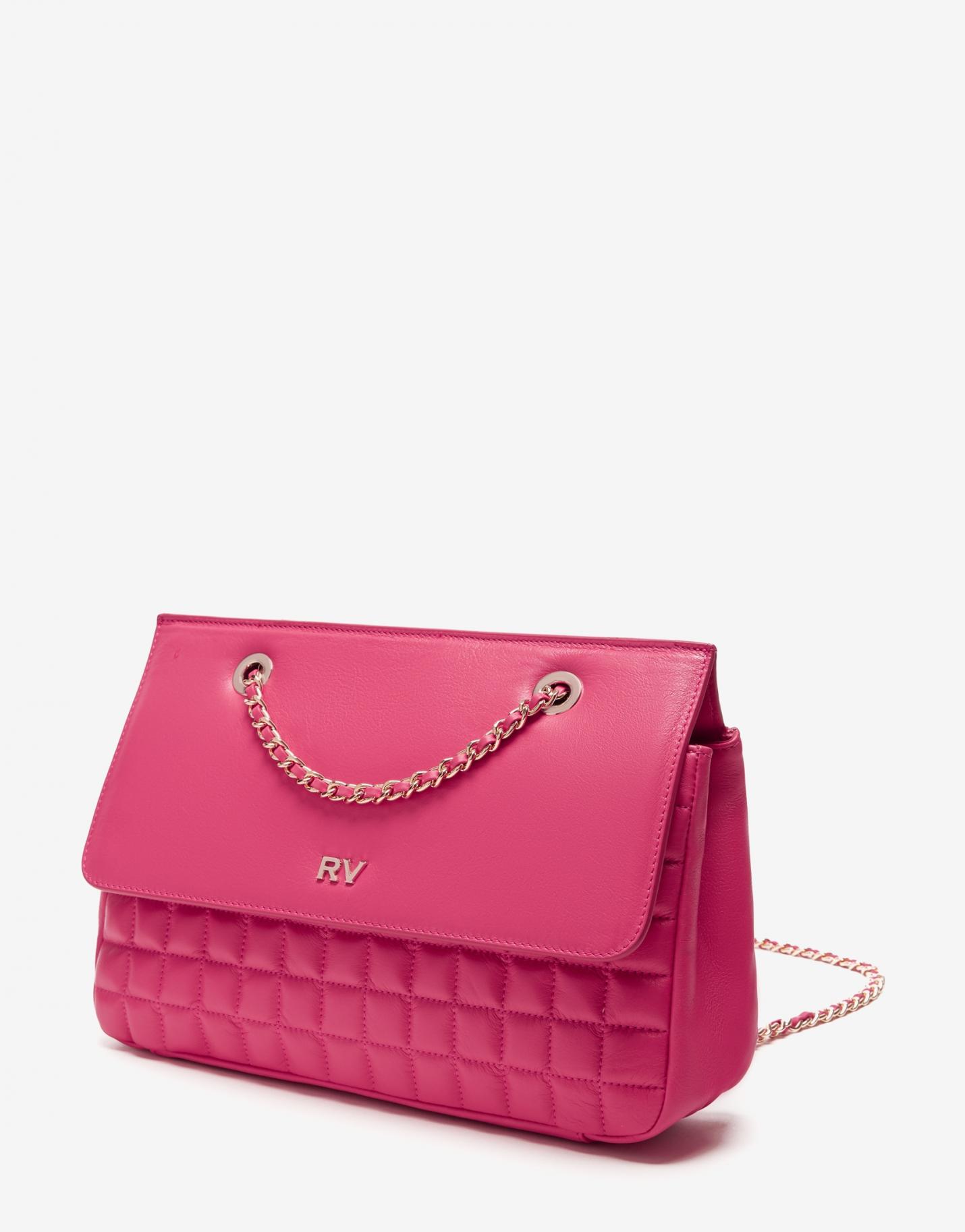 Bolso shoulder grande fabricado en piel rosa acolchada en panel delantero y trasero y piel lisa en tapeta. Bolsillo en la parte de atrás, logo RV metálico en tapeta delantera, asa de cadena en oro ch…