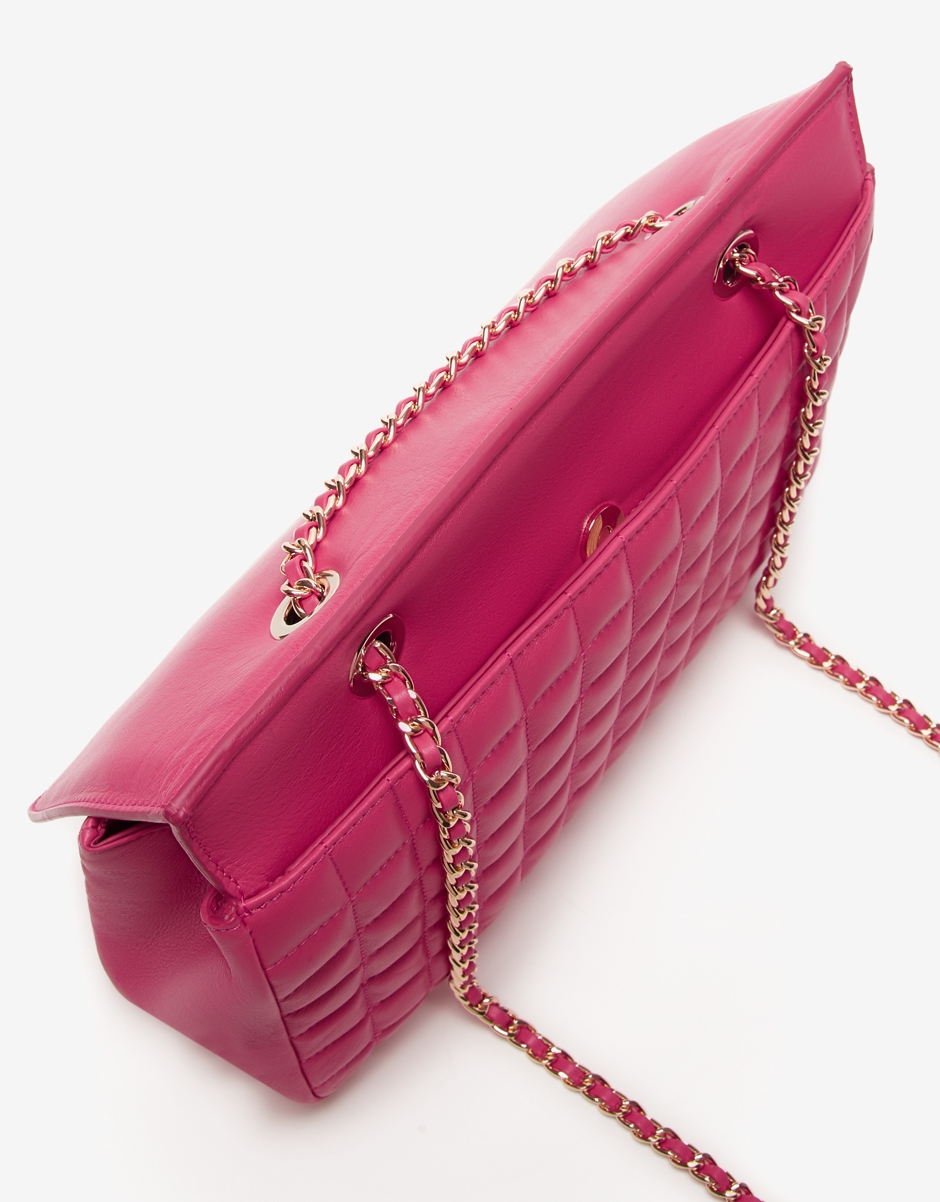 Bolso shoulder grande fabricado en piel rosa acolchada en panel delantero y trasero y piel lisa en tapeta. Bolsillo en la parte de atrás, logo RV metálico en tapeta delantera, asa de cadena en oro chiaro combinada con piel entrelazada negra de 124 cm y cierre con broche metálico. Interior forrado y compartimentado. Medidas aproximadas: 30 x 19,5 x 9,5 cm.