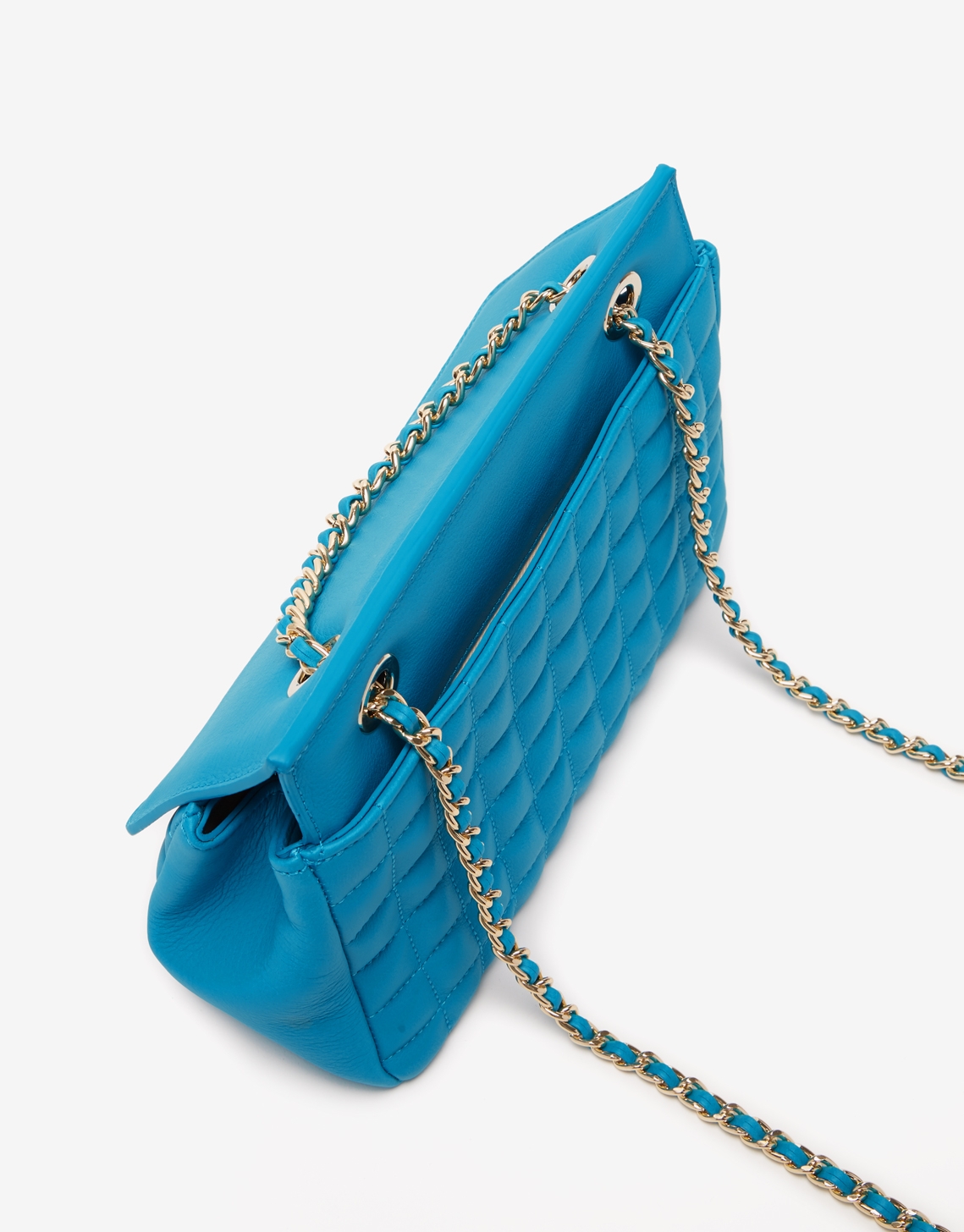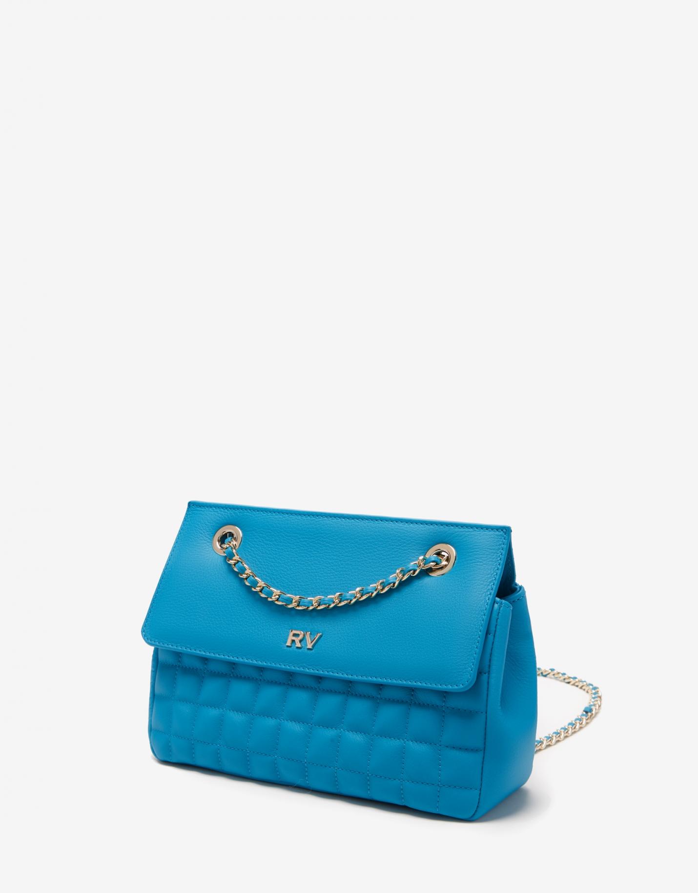 Bolso shoulder fabricado en piel azul con tapeta lisa y logo metálico RV, panel delantero con piel acolchada y panel trasero con guantera. Asa de cadena en oro chiaro combinada con piel entrelazada de 128 cm y cierre con broche metálico. Logo metálico en tapeta. Medidas aproximadas: 24 x 17 x 8 cm.