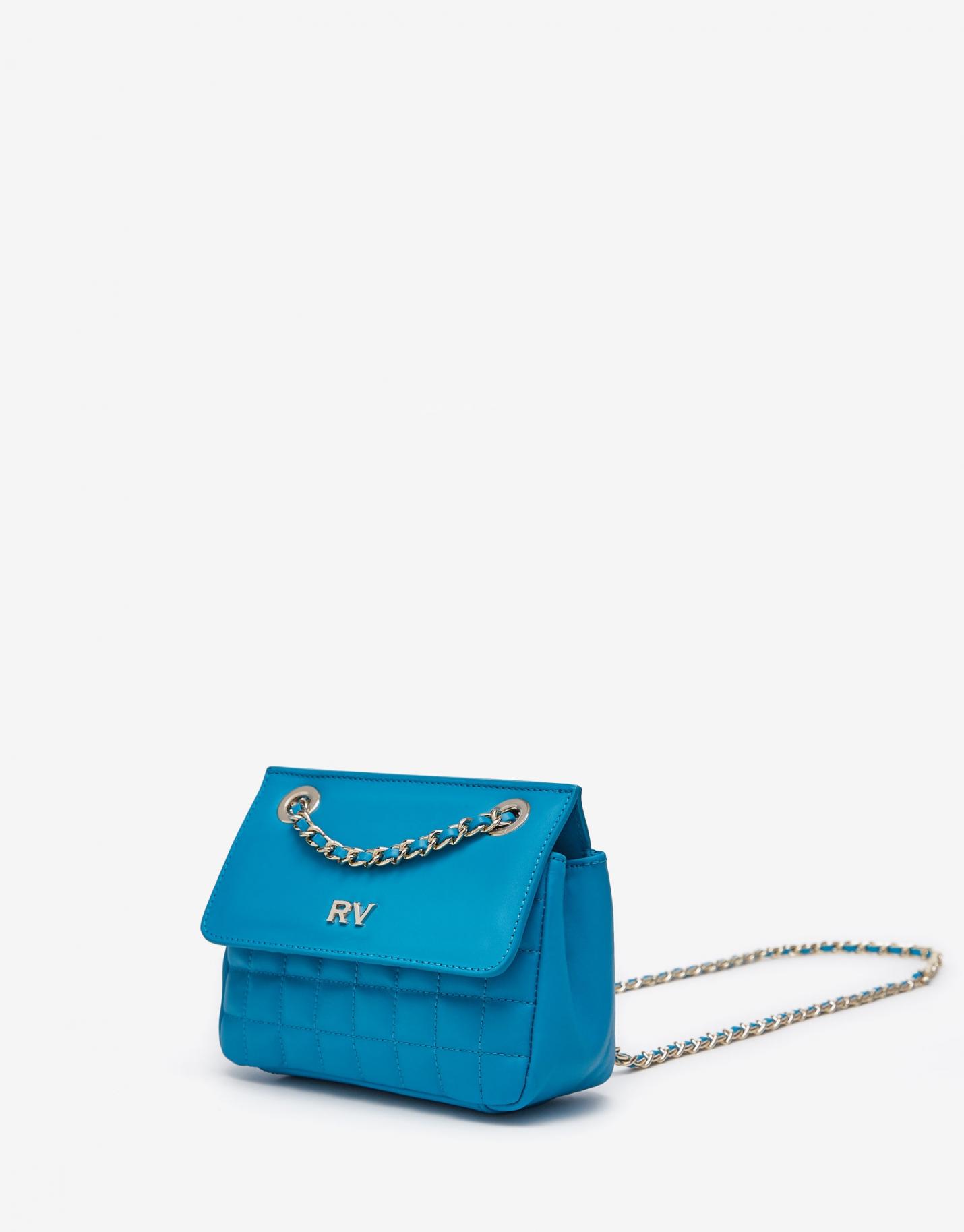 Bolso mini shoulder fabricado en piel azul tuerquesa con tapeta lisa y logo metálico RV, panel delantero con piel acolchada y panel trasero con guanter…