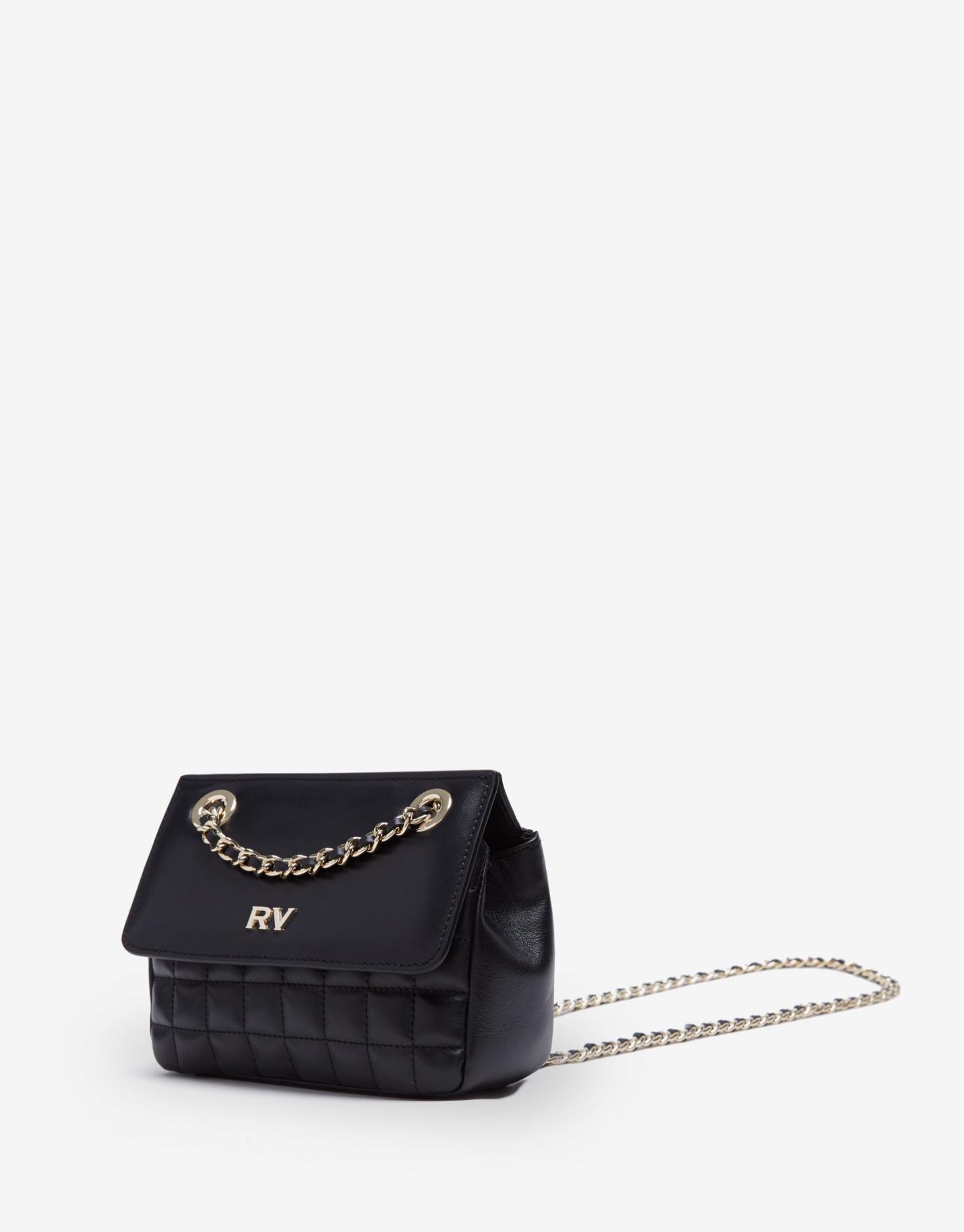 Bolso mini shoulder fabricado en piel negra con tapeta lisa y logo metálico RV, panel delantero con piel acolchada y panel trasero con guantera. Asa de cadena en oro chiaro combinada con piel entrelazada de 128 cm y cierre con broche metálico. Logo metálico en tapeta. Medidas aproximadas: 17 x 14 x 7 cm.