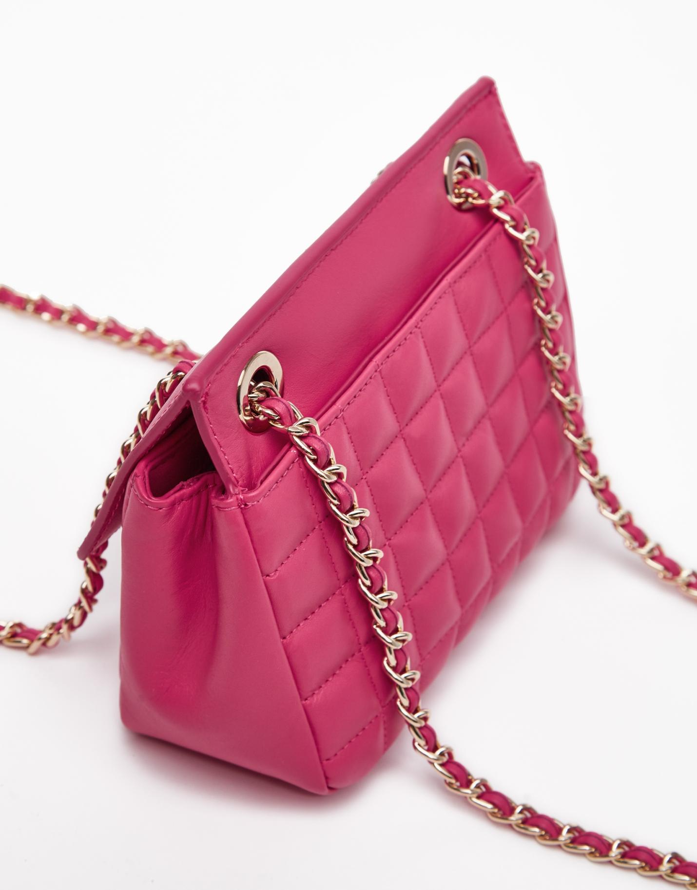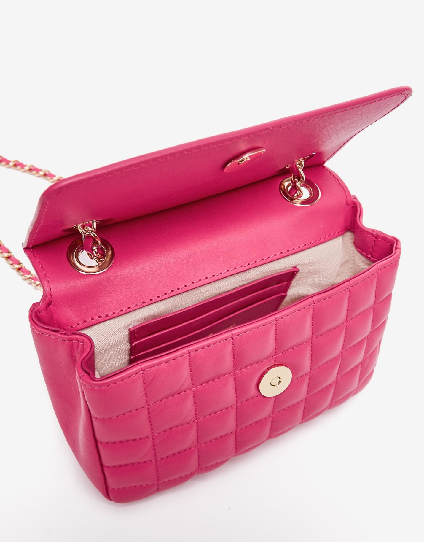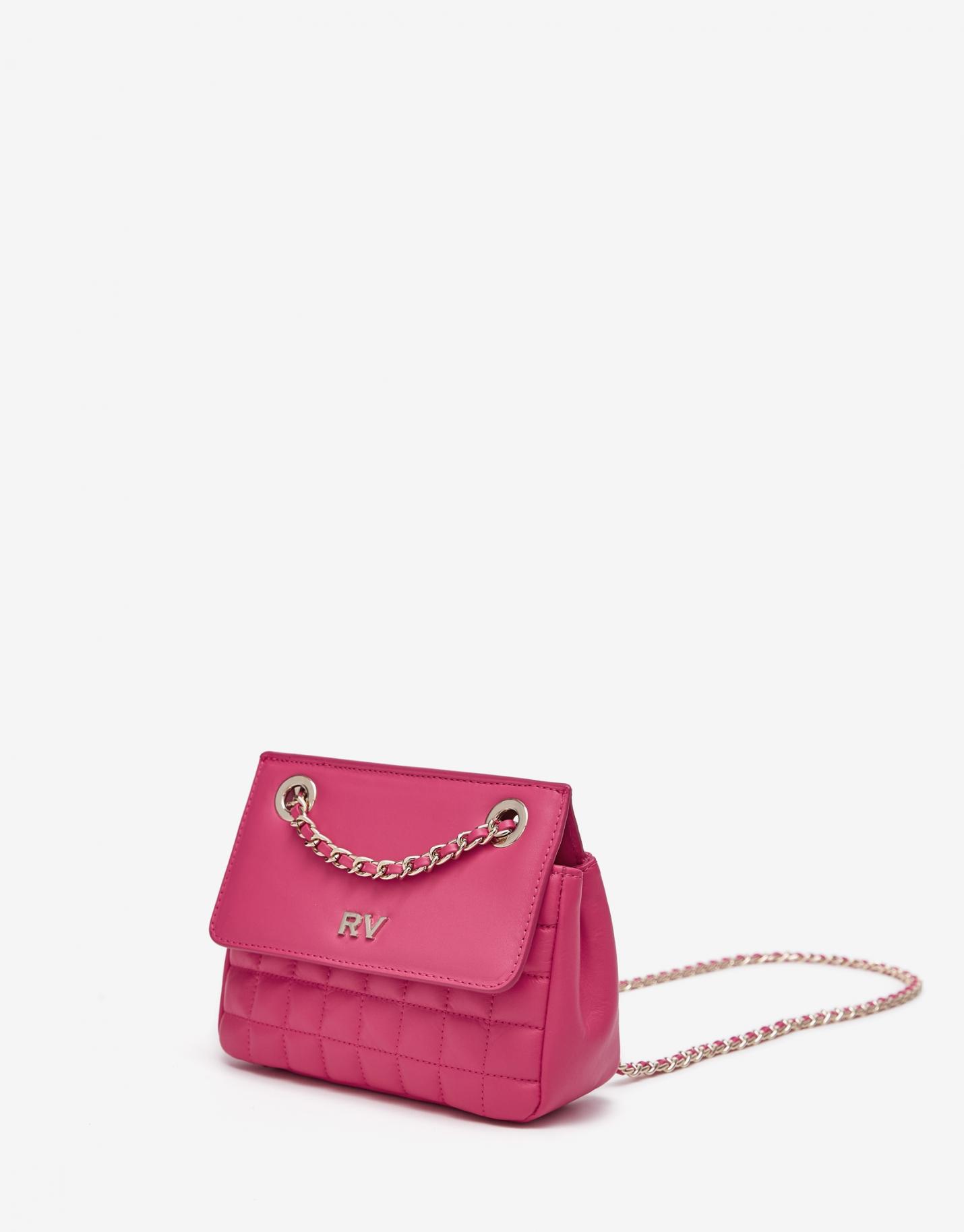 Bolso mini shoulder fabricado en piel rosa con tapeta lisa y logo metálico RV, panel delantero con piel acolchada y panel trasero con guantera. Asa de cadena en oro chiaro combinada con piel entrelazada de 128 cm y cierre con broche metálico. Logo metálico en tapeta. Medidas aproximadas: 17 x 14 x 7 cm.