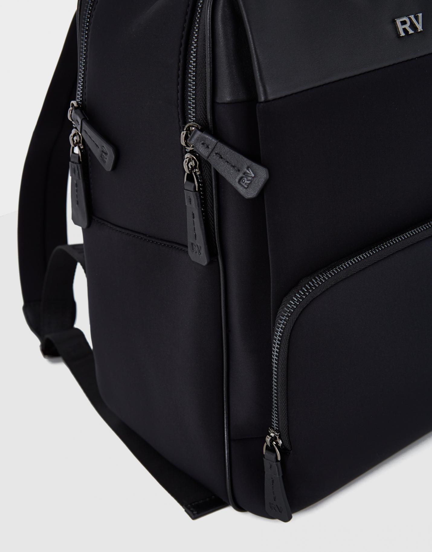 Mochila masculina fabricada en neopreno y piel color negro con dos compartimentos superiores cerrados con cremallera y un bolsillo de cremallera en el frontal. Interior forrado y compartimentado para ordenador portátil. Asa superior de mano en piel y asas de mochila acolchadas y regulables con nastro personalizado. Logo metálico RV en frontal. Medidas aproximadas: 30,5 x 38 x 25 cm. Largo máximo asas espalda: 83 cm. Altura asa de mano: 5 cm.