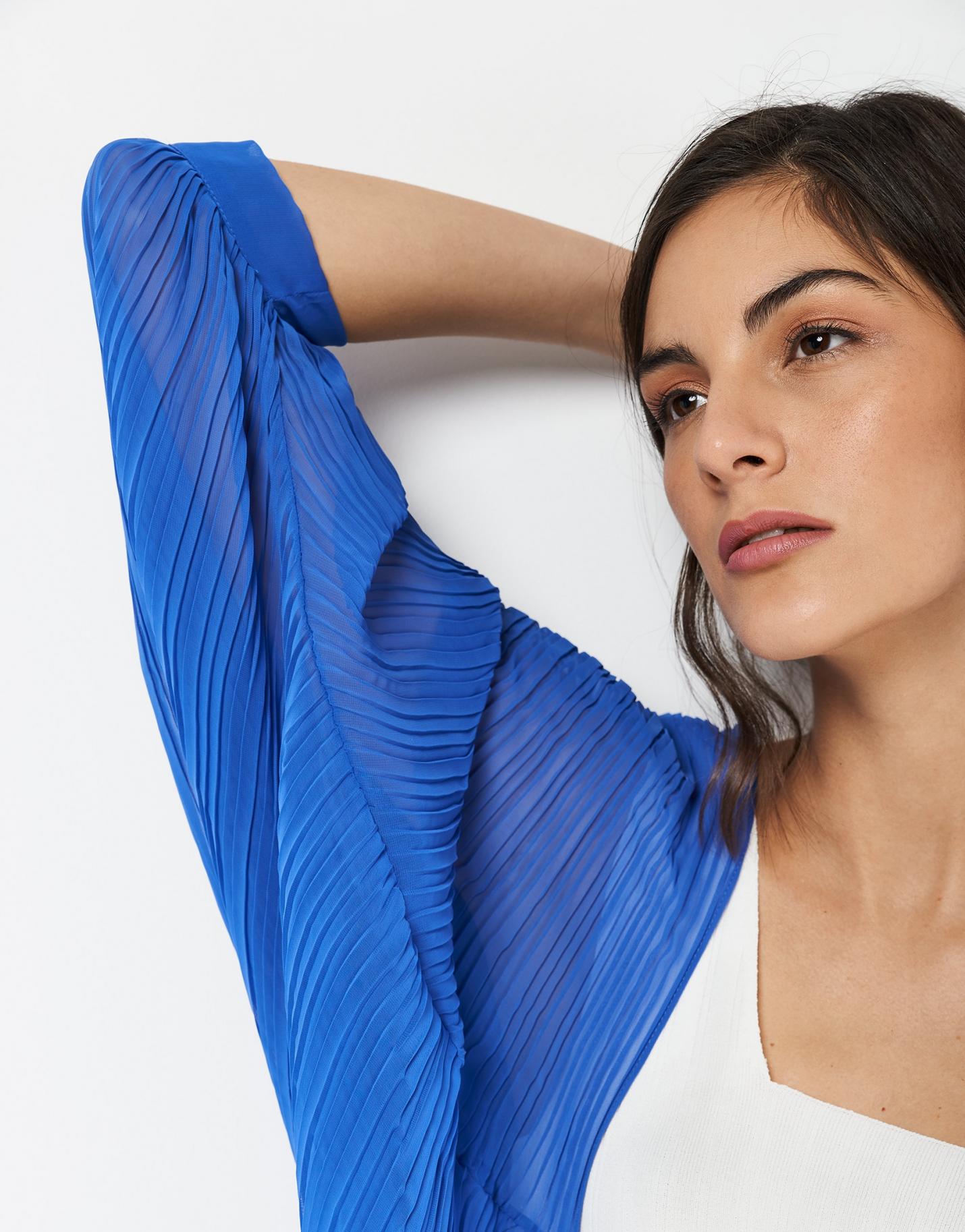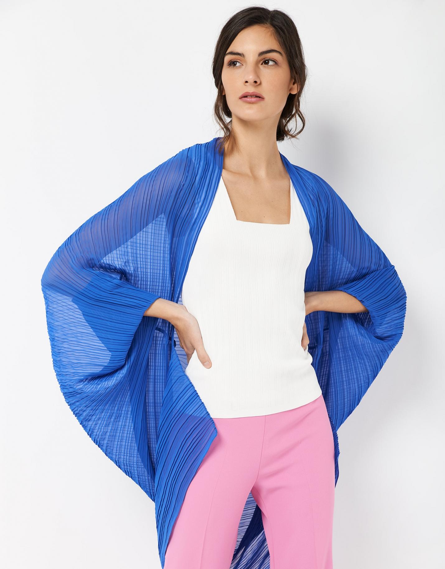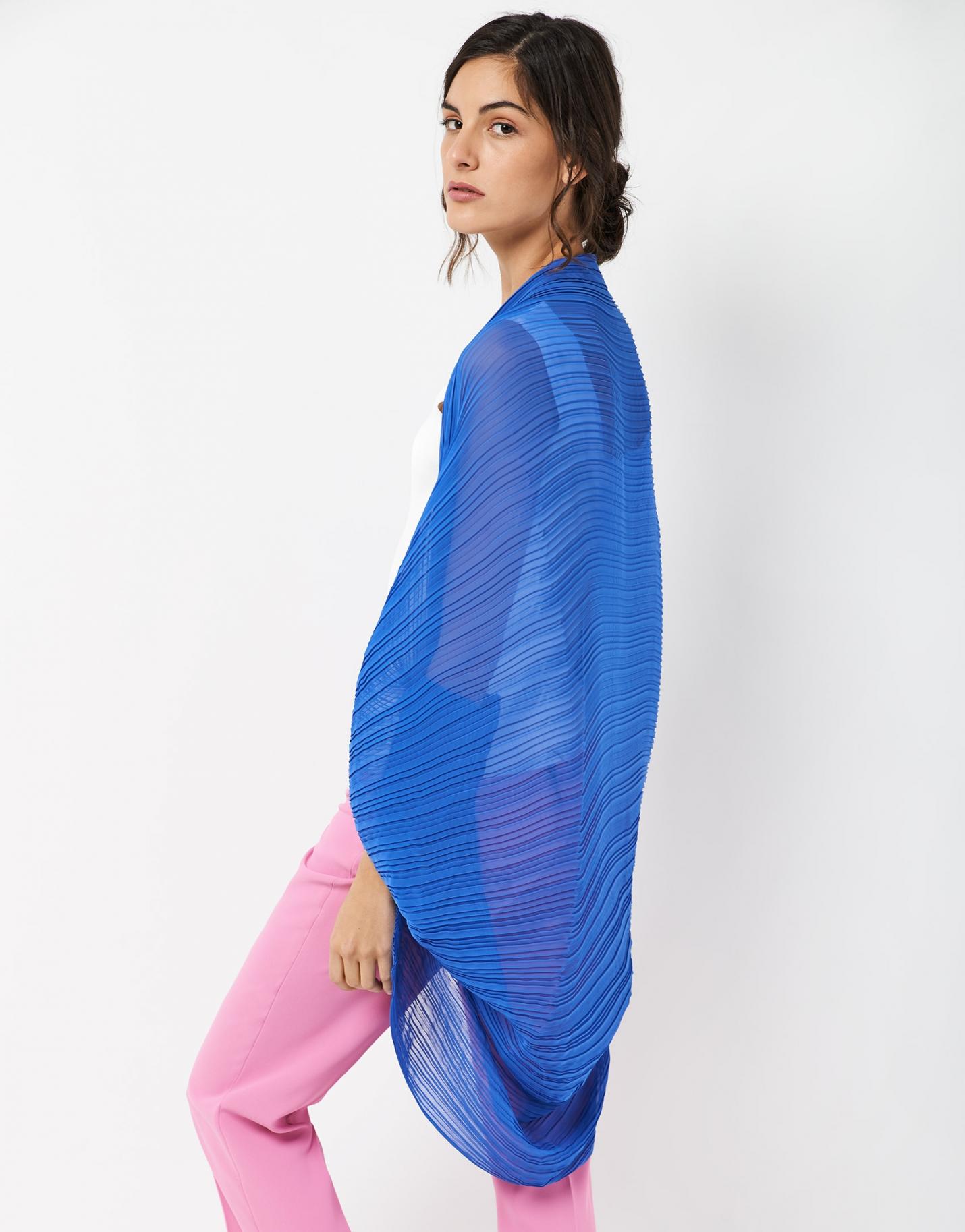Chal con mangas confeccionado en tejido plisado color azul. Corte más largo por la espalda y manga con puño en el bajo.