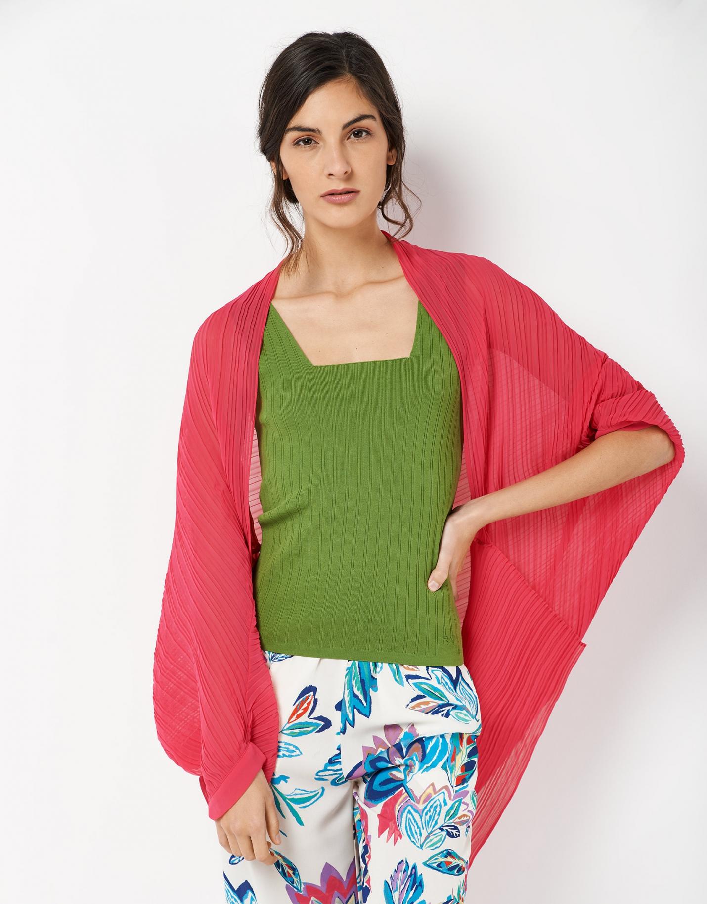 Chal con mangas confeccionado en tejido plisado color coral. Corte más largo por la espalda y manga con puño en el bajo. …