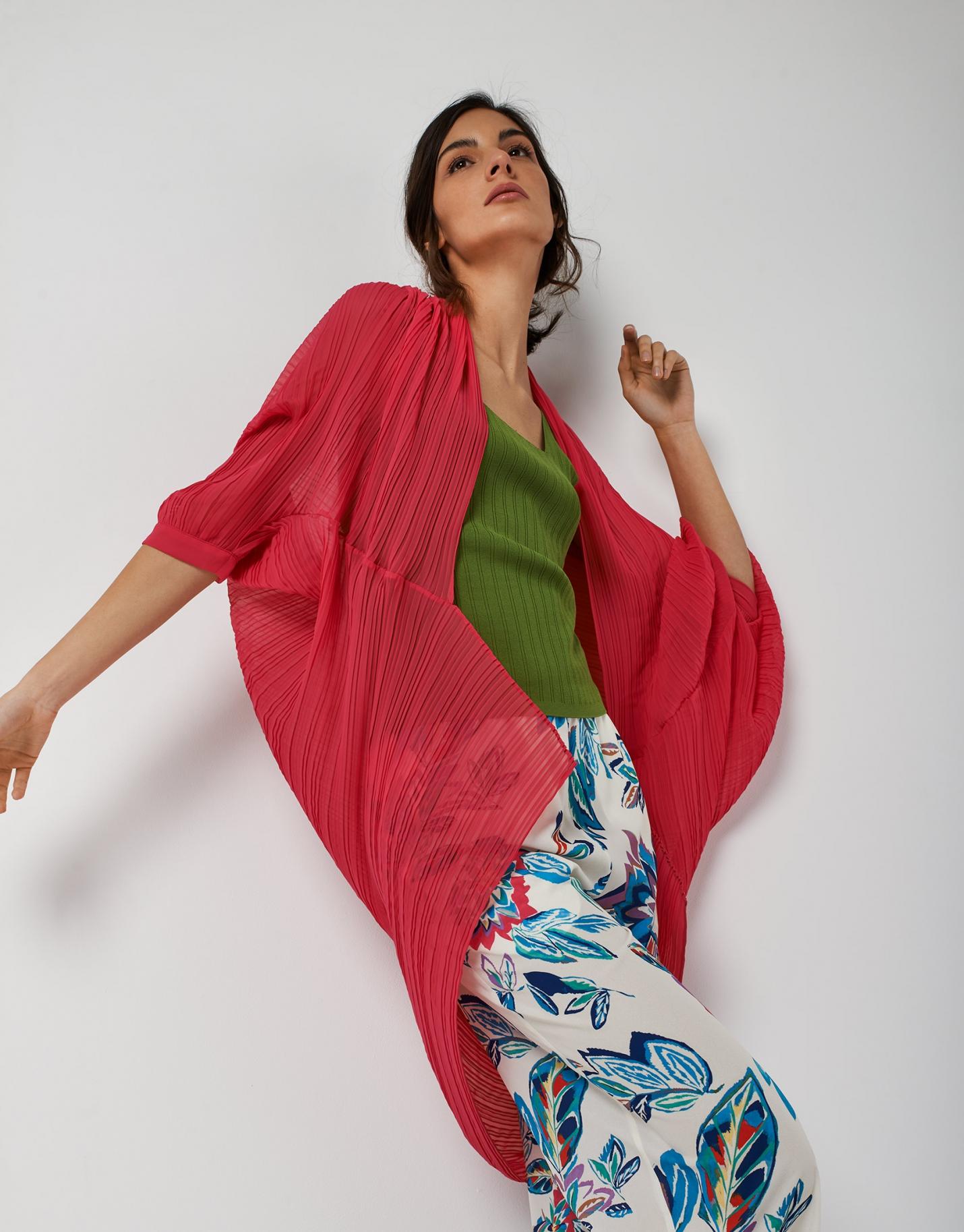 Chal con mangas confeccionado en tejido plisado color coral. Corte más largo por la espalda y manga con puño en el bajo.