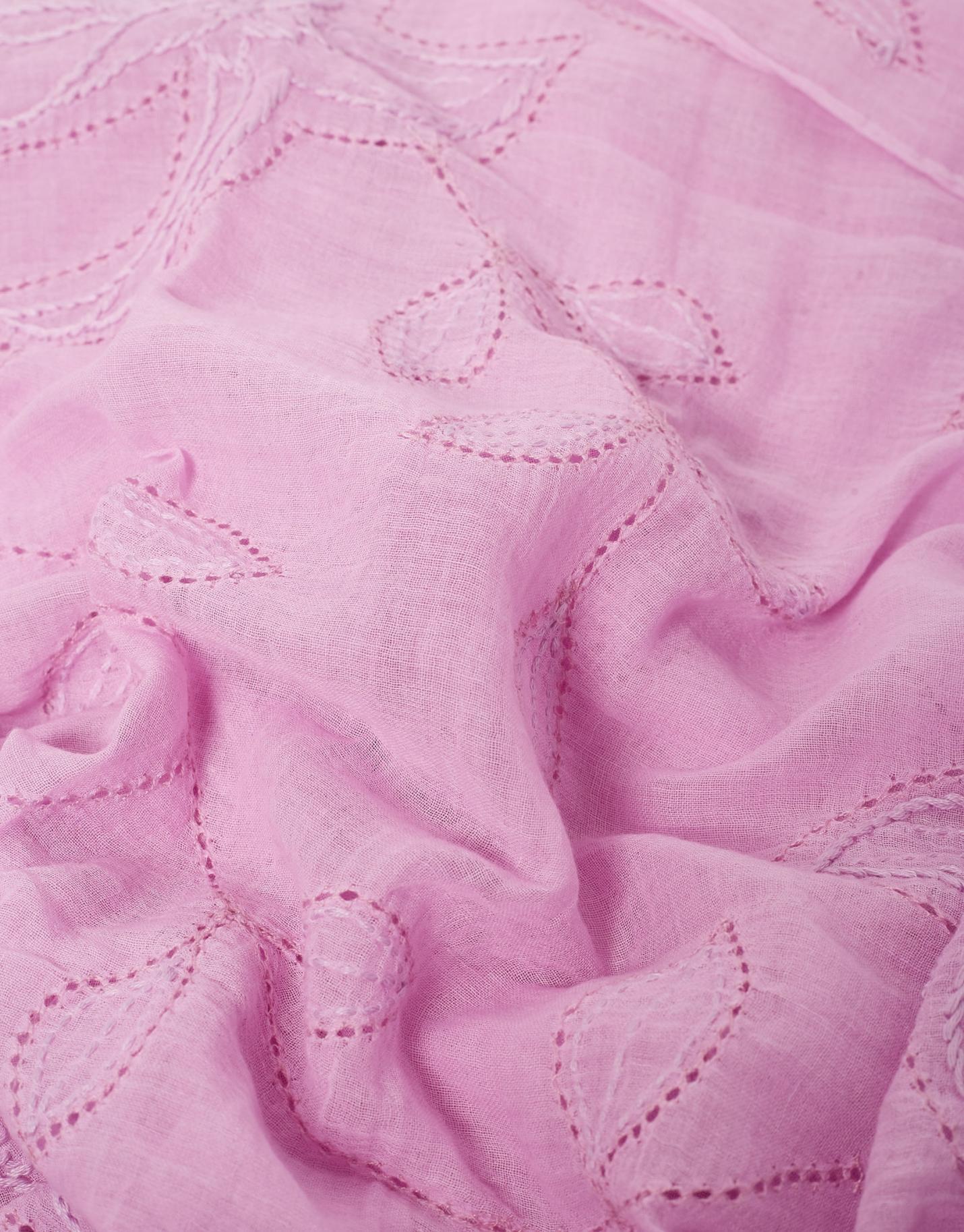 Fular confeccionado en un tejido de algodón color lila con bordado floral a tono. Remate ligeramente desflecado. Medidas: 70×180 cm