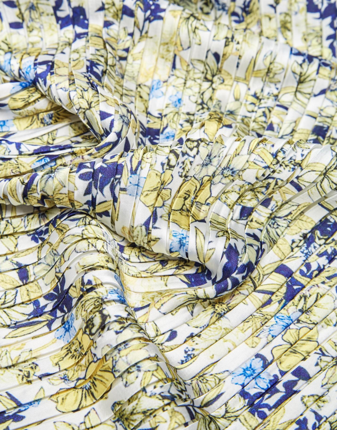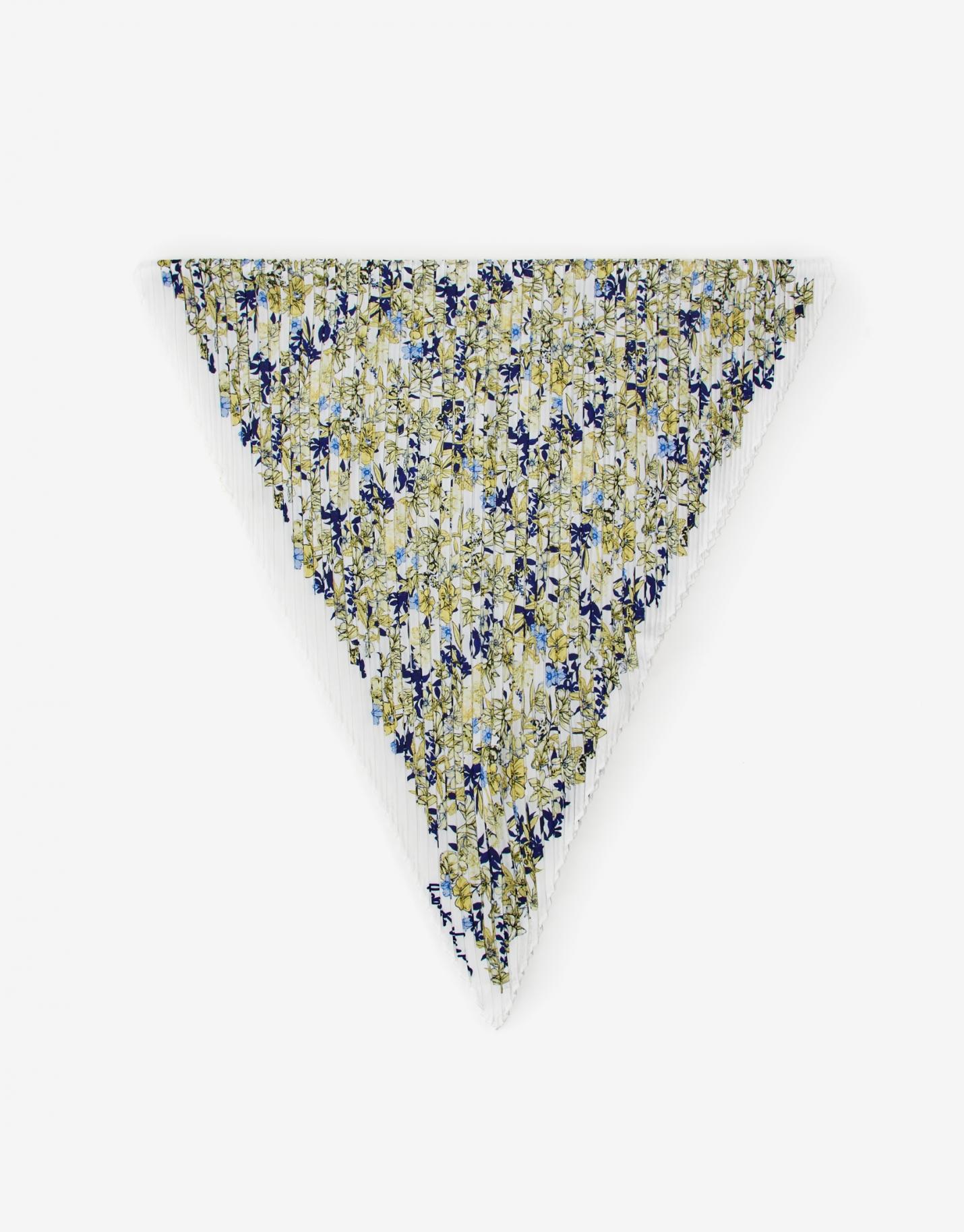 Pañuelo cuadrado confeccionado en un tejido de acabado plisado color blanco con estampado floral en tonos amarillos. Medidas: 88×88 cm