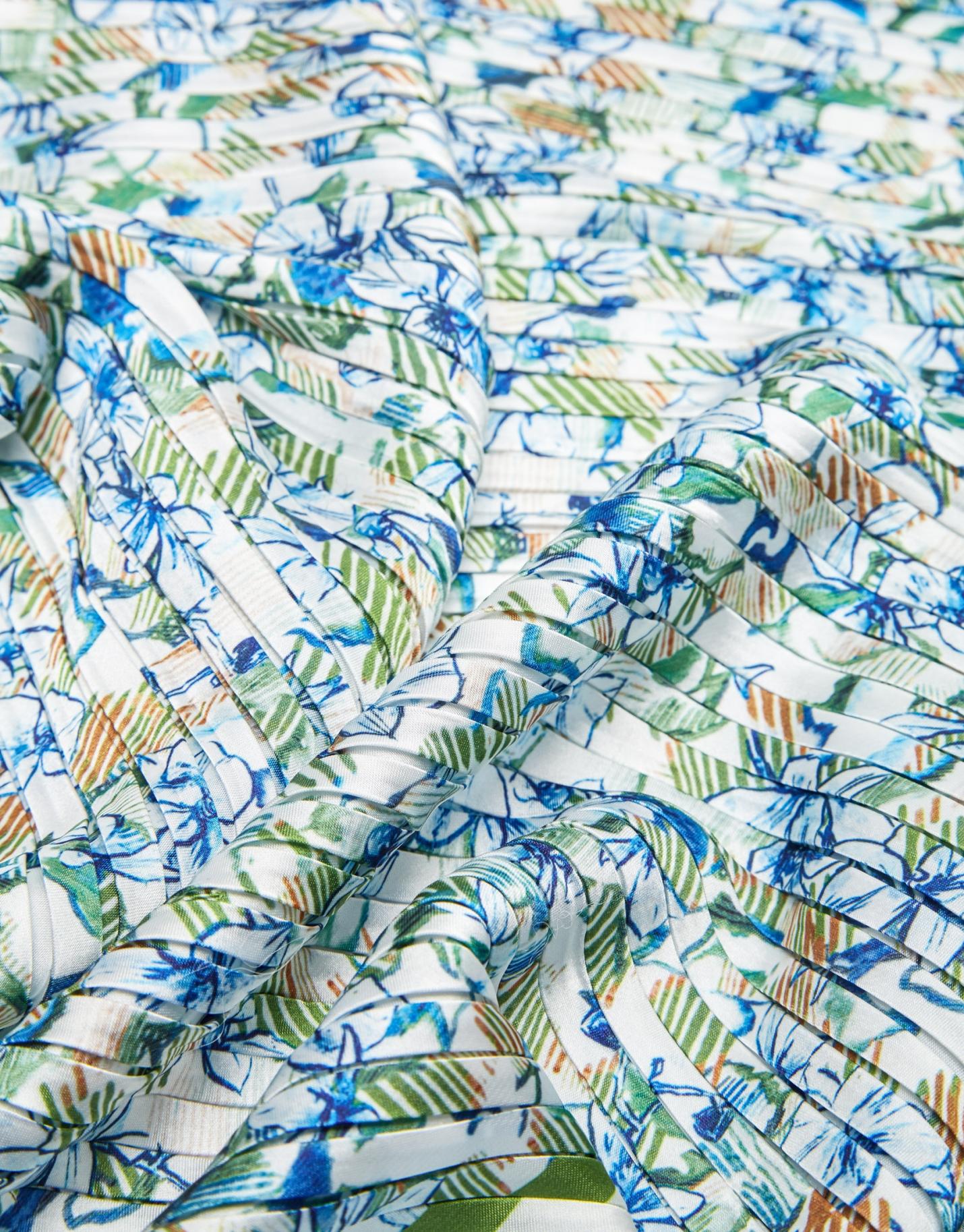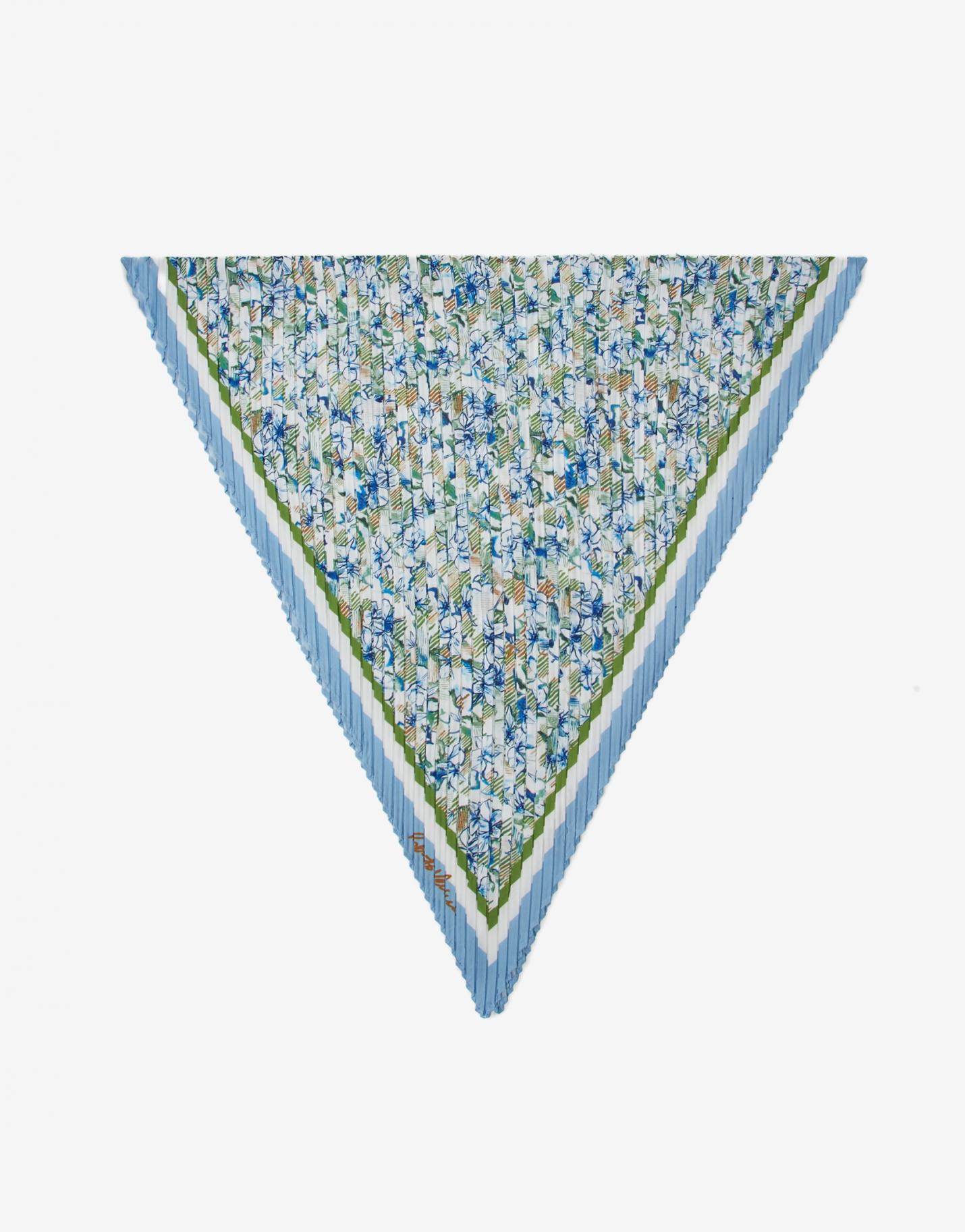Pañuelo cuadrado confeccionado en un tejido de acabado plisado color blanco con estampado floral en tonos azules. Medidas: 88×88 cm