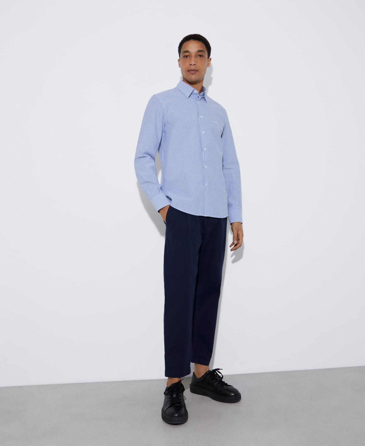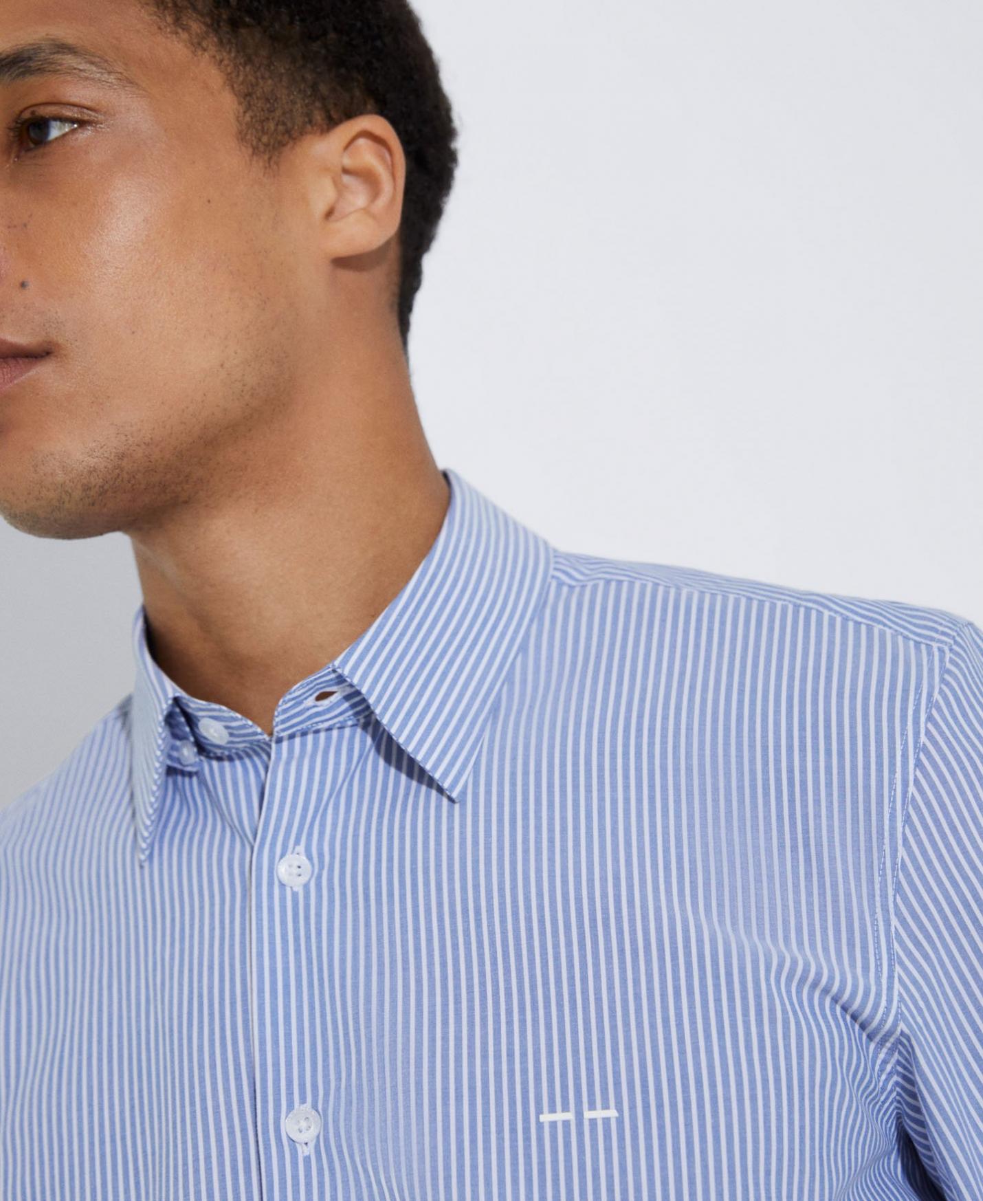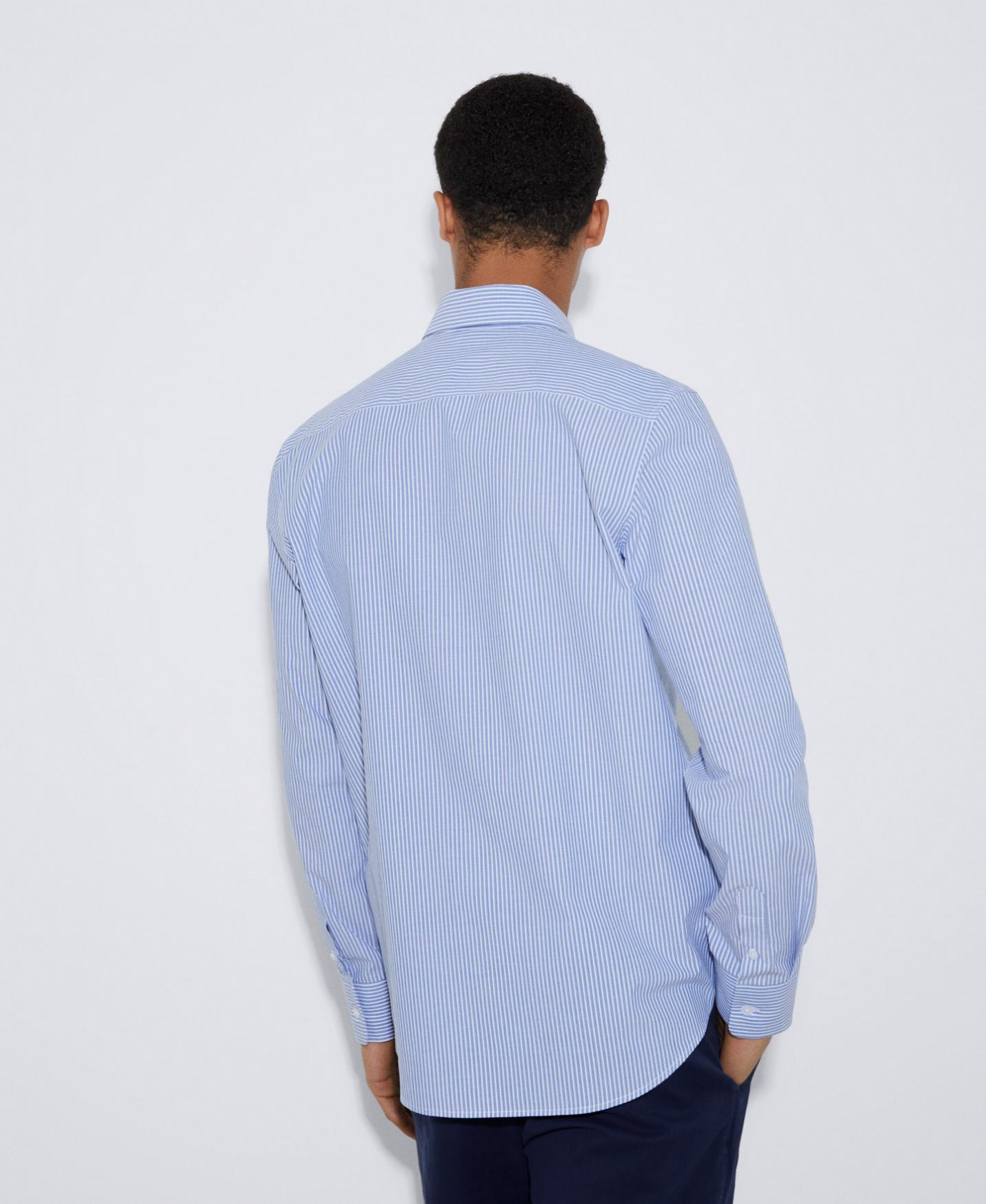 Camisa de rayas en 100% lino. Tiene cuello solapa con botón bajo cuello, cierre de botonadura central y manga larga rematada en puño con botones.