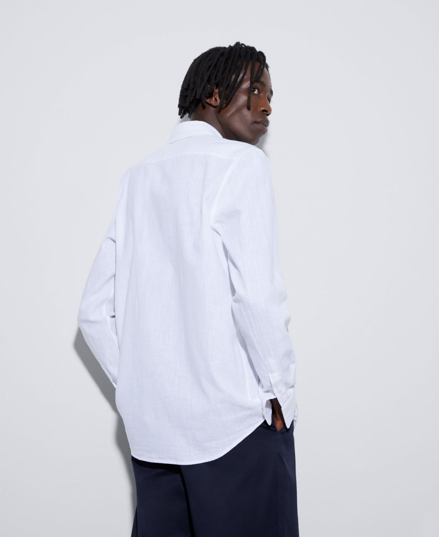 Camisa estampada en algodón orgánico y lino. Tiene cuello solapa, cierre de botonadura central y manga larga rematada en puño con botones.