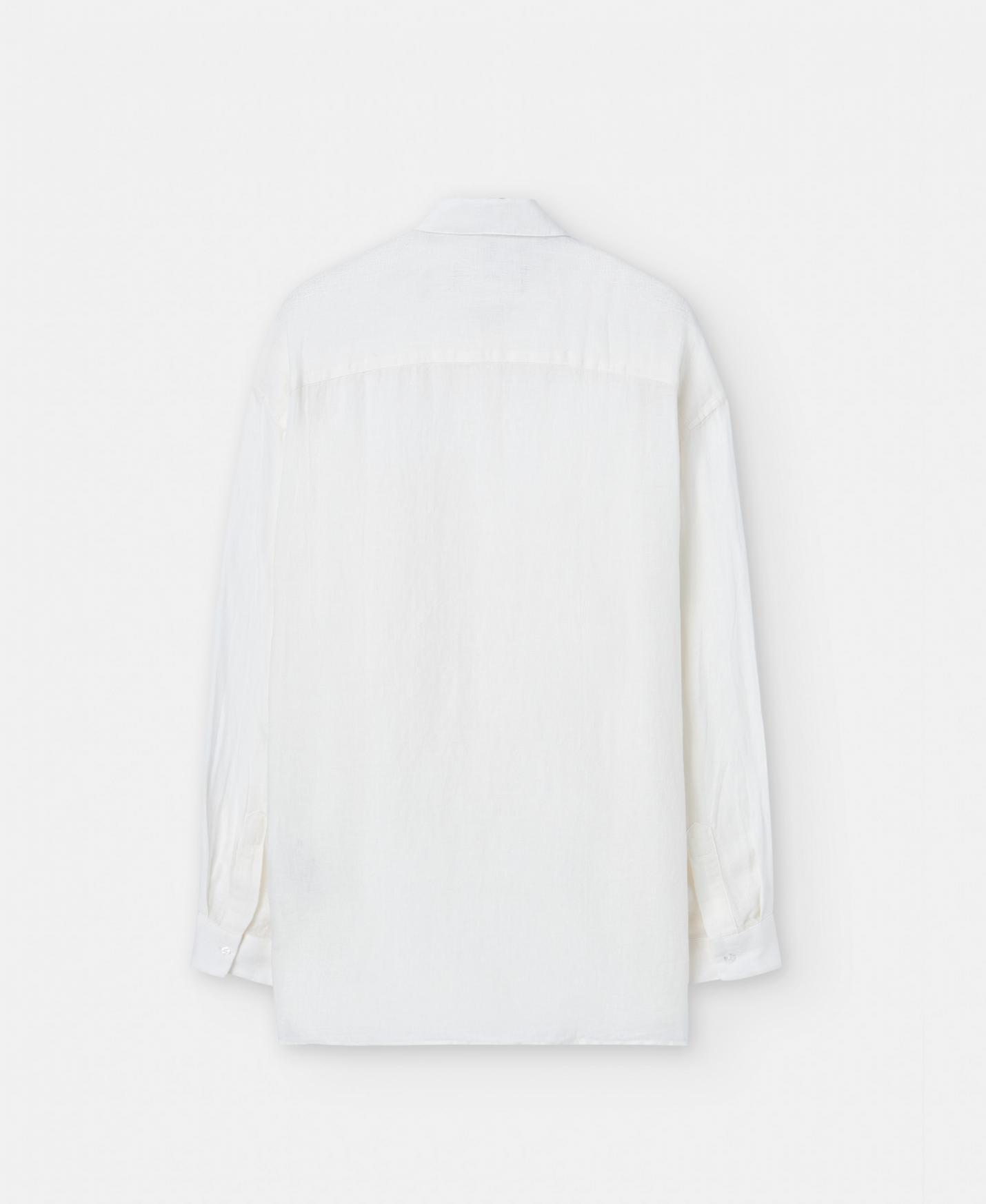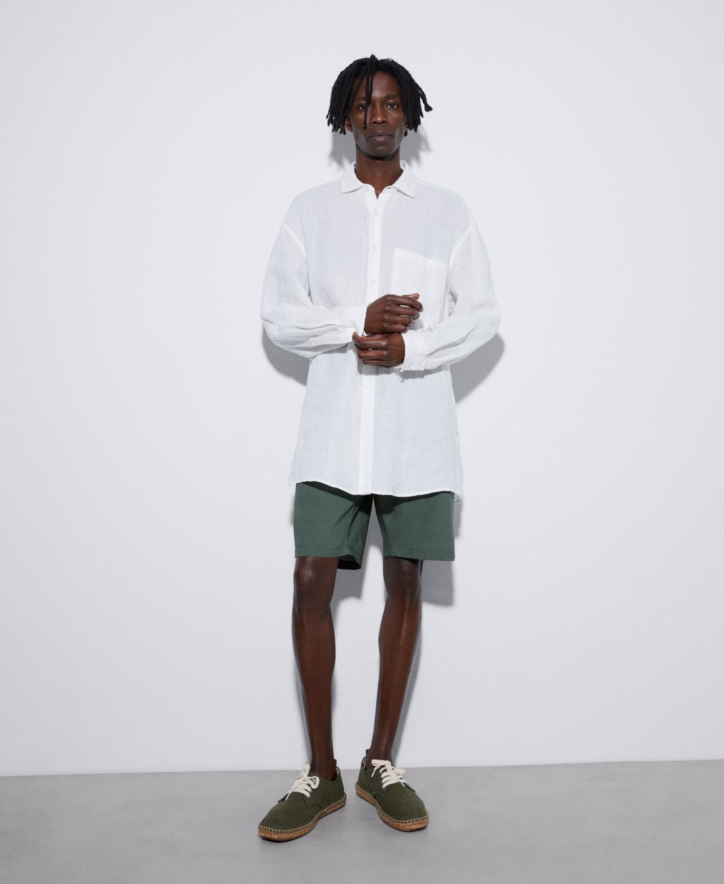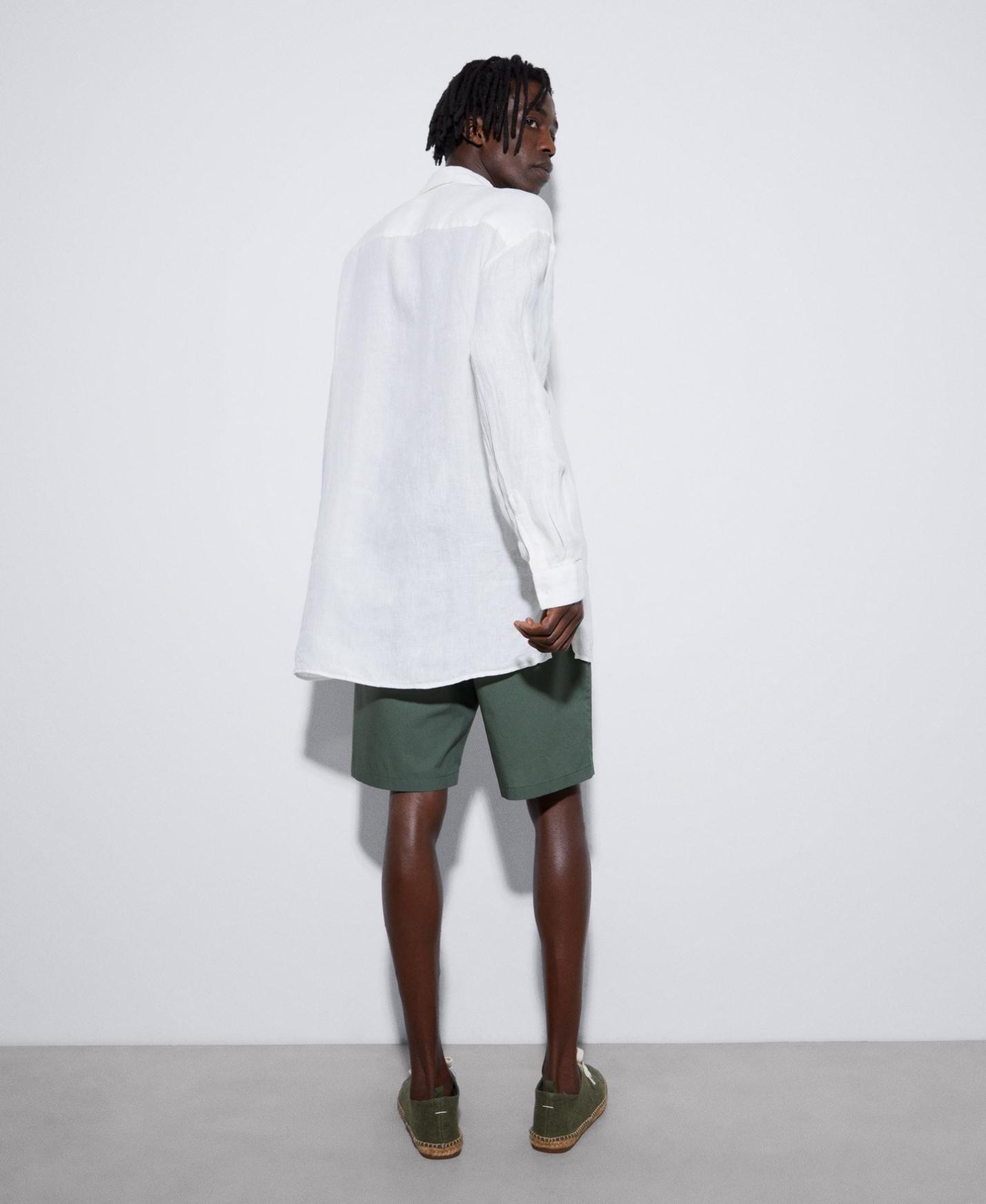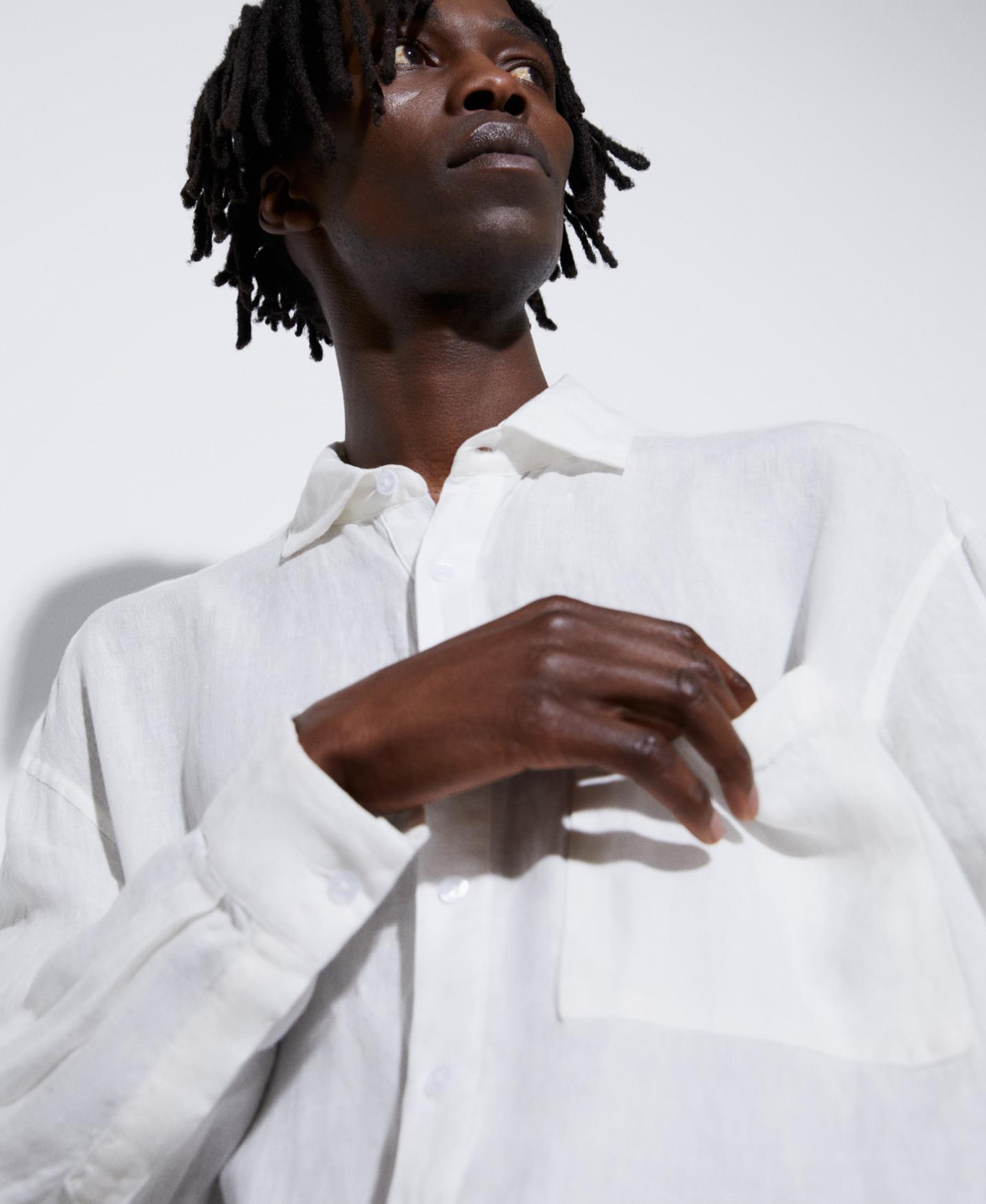 Camisa oversize en lino. Con mangas largas y bolsillo parche en el pecho. Cuello de puntas rectas y sardinetas del puño logotipadas.