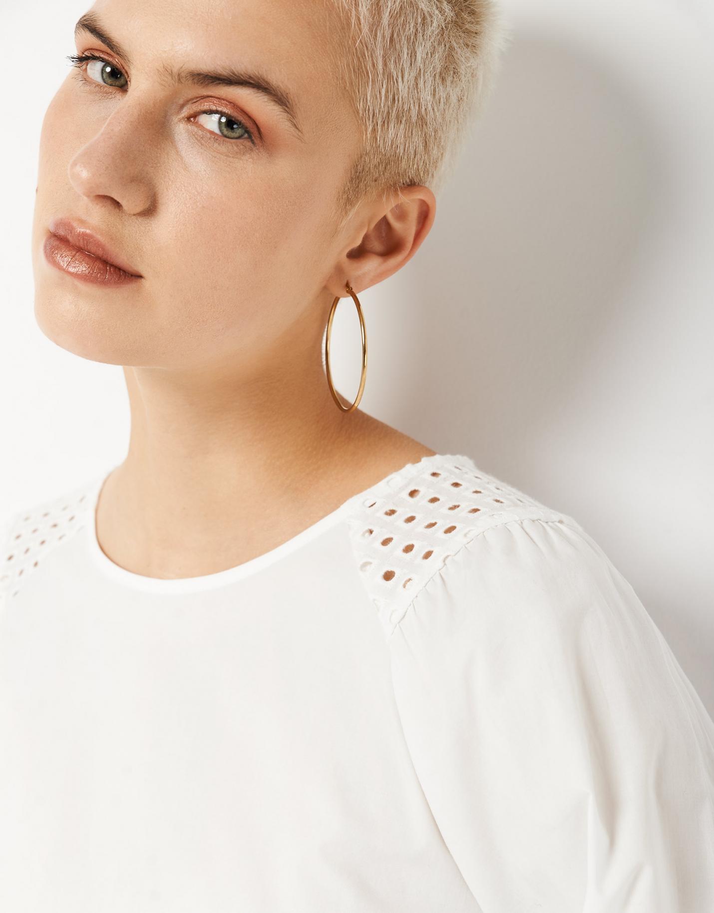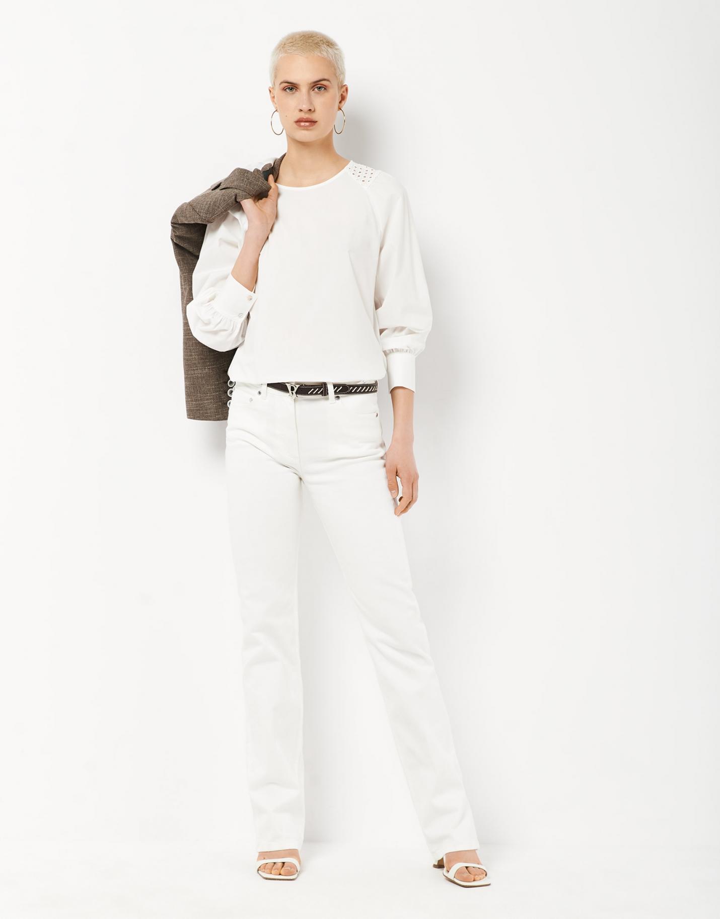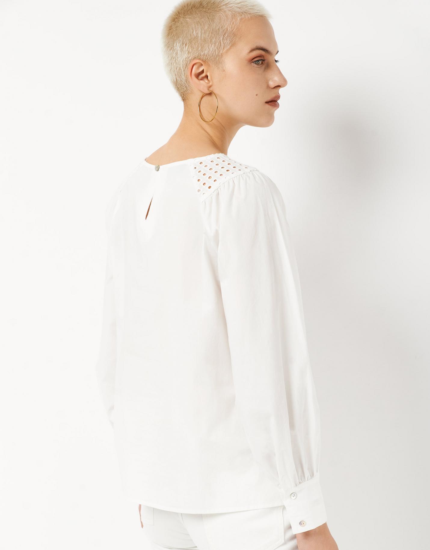 Blusa de manga larga confeccionada en un algodón blanco con canesú bordado en hombros. Escote redondo con cierre de lágrima con botón y manga larga abullonada con puño.