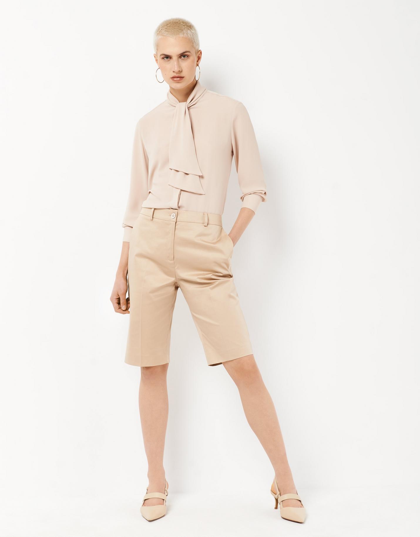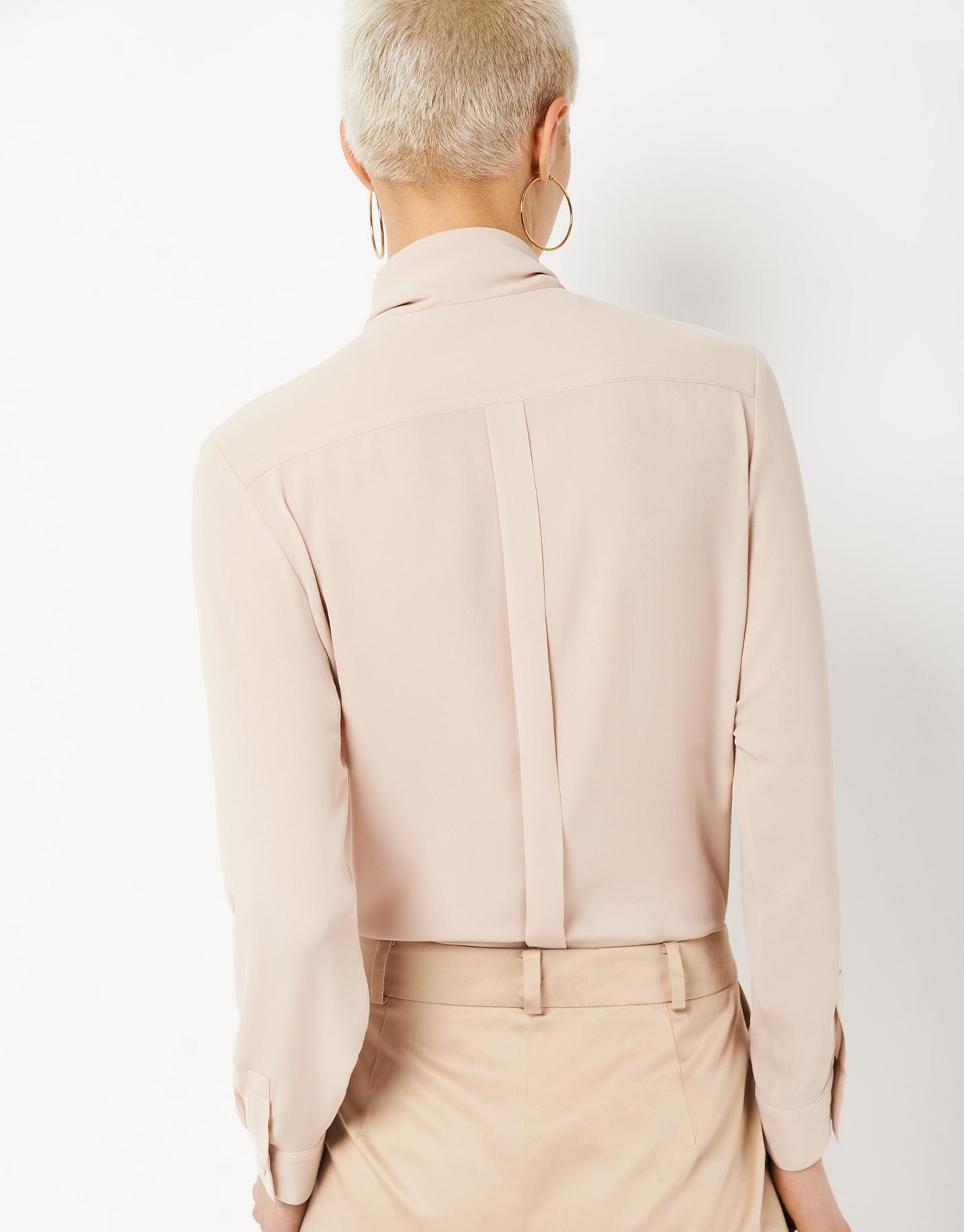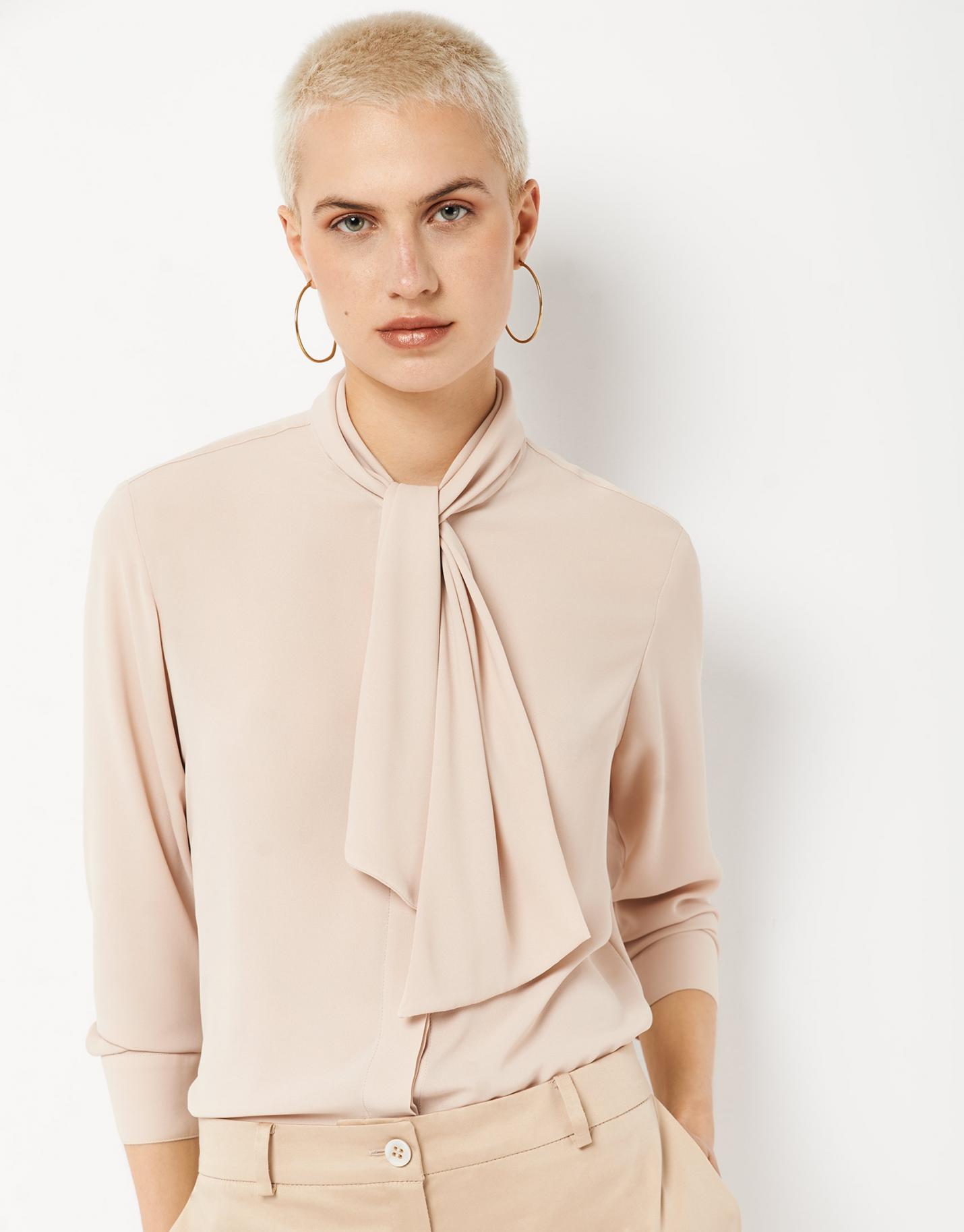 Blusa de manga larga confeccionada en un tejido fluido color vainilla con cuello jabot rematado en lazo entrecruzado. Corte recto, espalda con canesú y pliegue y manga larga rematada en puños. Cierre con botonadura oculta en frontal.