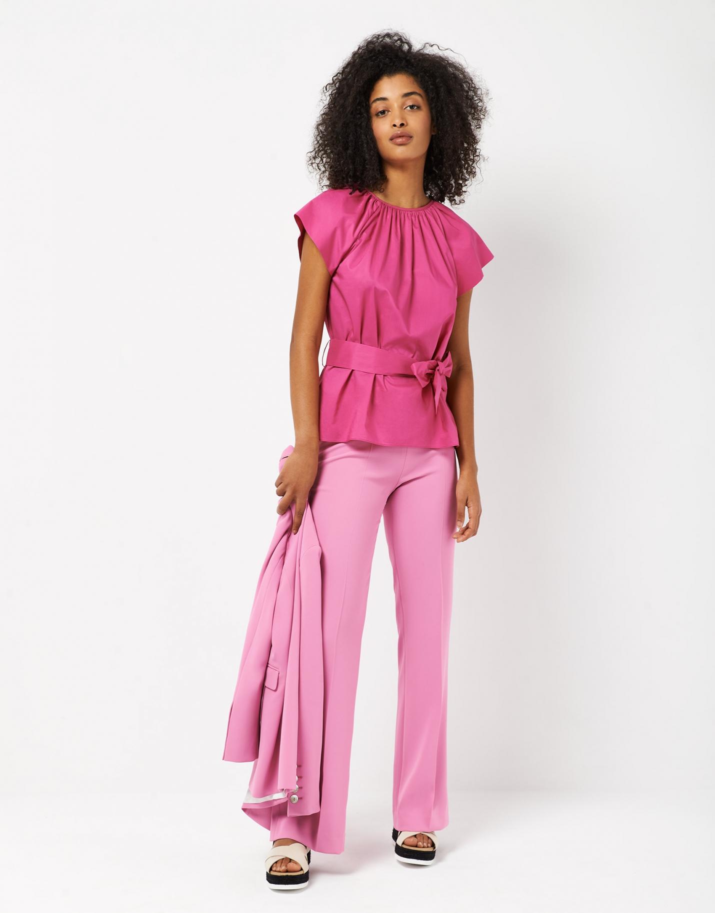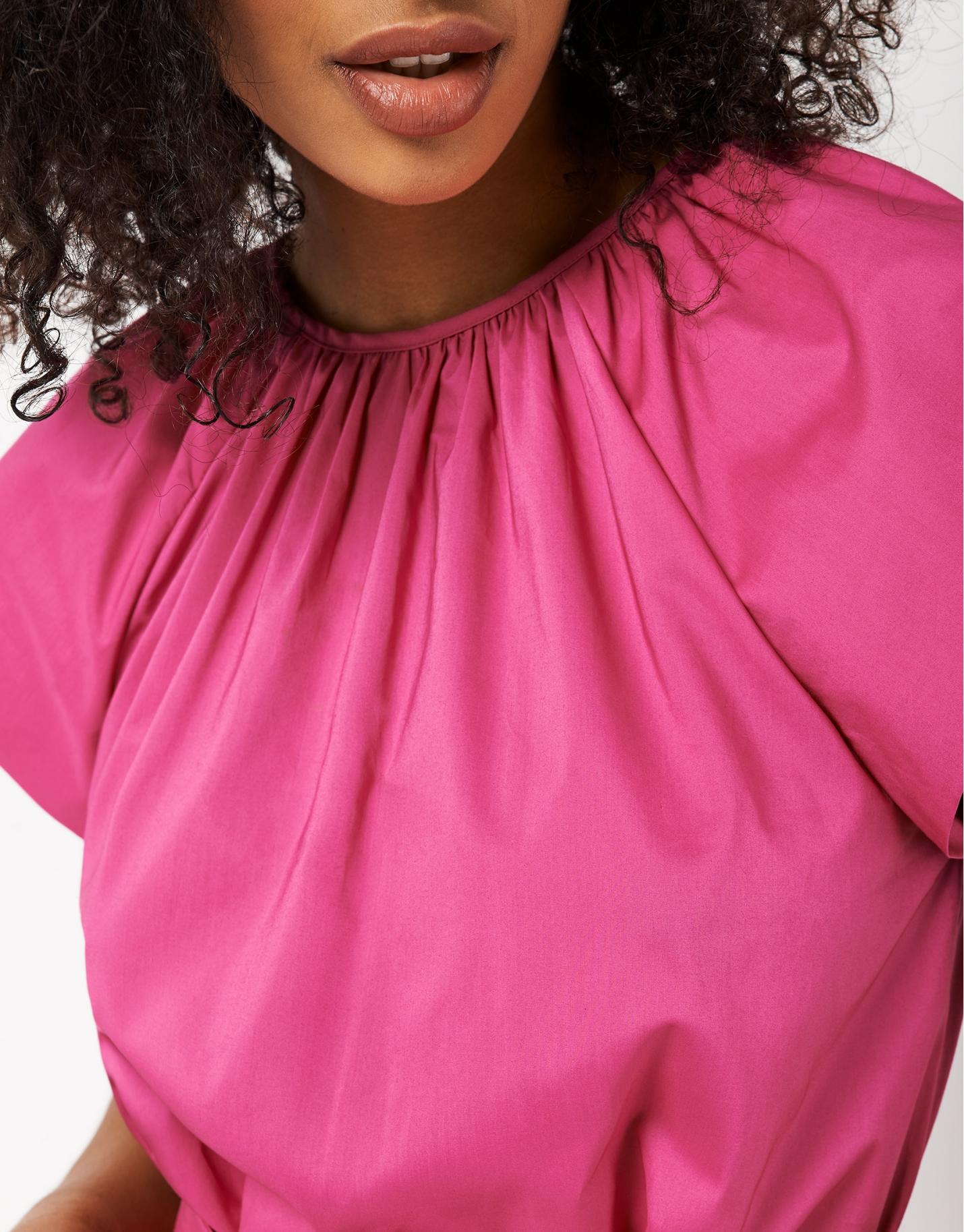 Blusa confeccionada en un tejido color rosa con escote redondo fruncido. Manga corta ranglán y cinturón del mismo tejido.