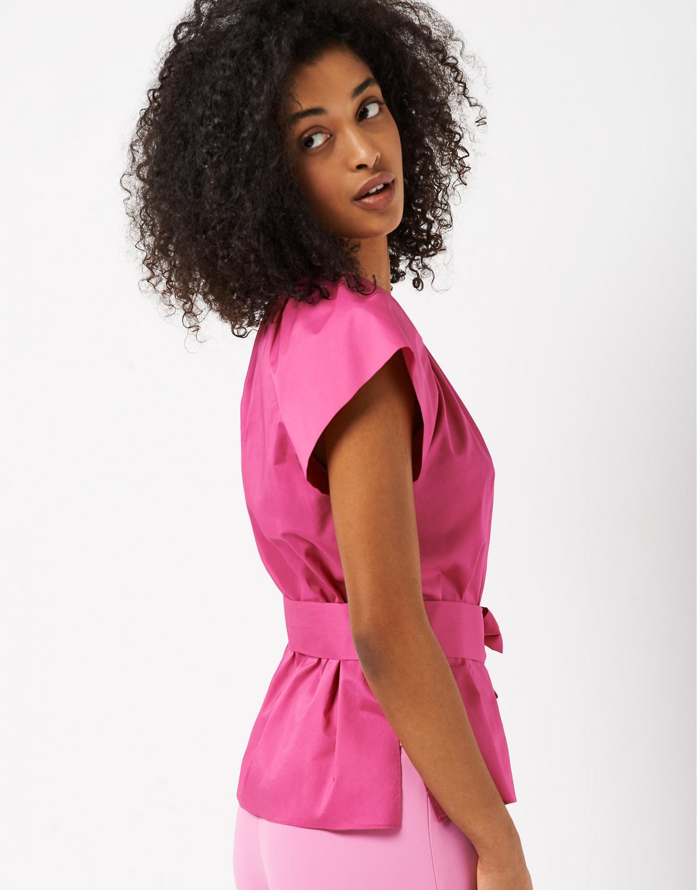 Blusa confeccionada en un tejido color rosa con escote redondo fruncido. Manga corta ranglán y cinturón del mismo te…