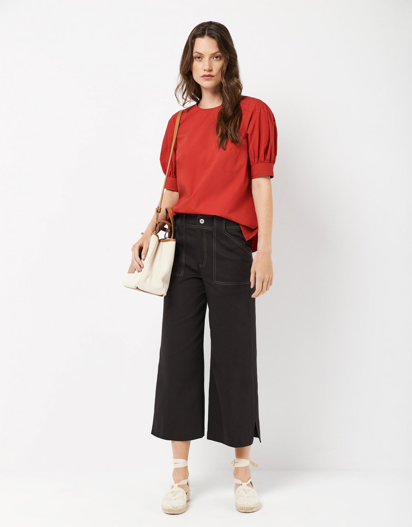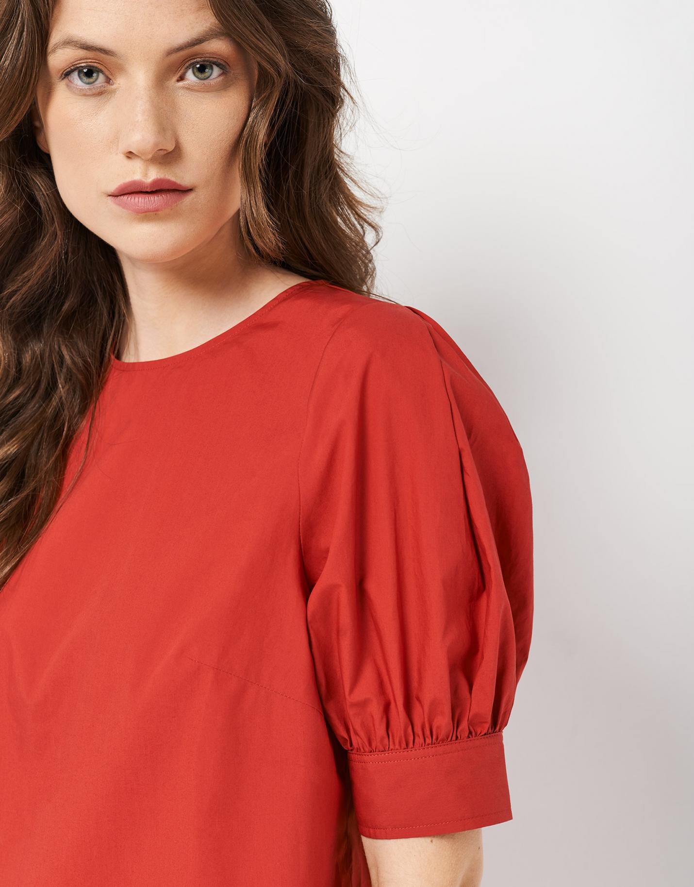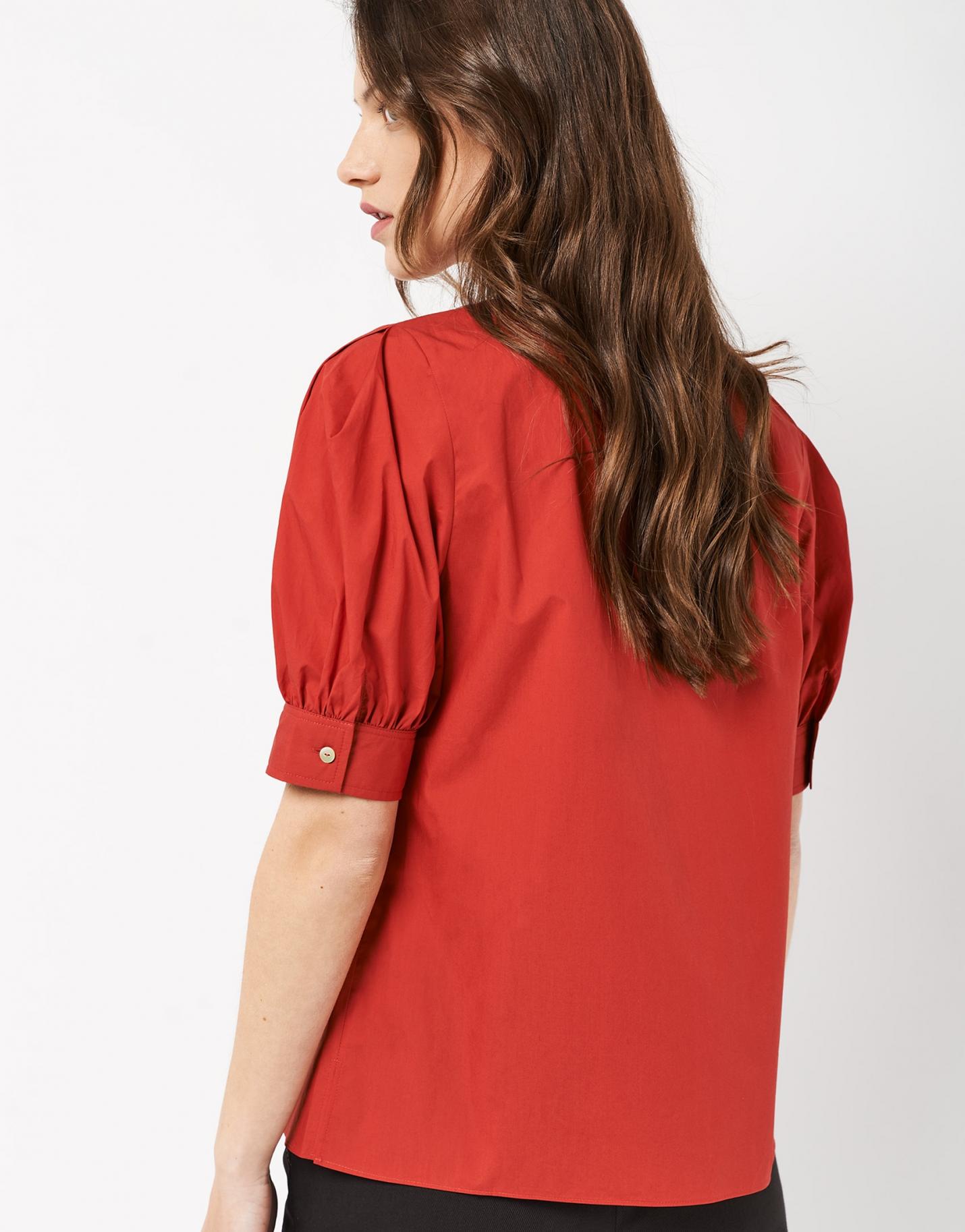 Blusa de manga francesa confeccionada en un tejido de algodón rojo. Escote redondo con cierre de lágrima y botón en espalda y manga francesa abullonada con puño.