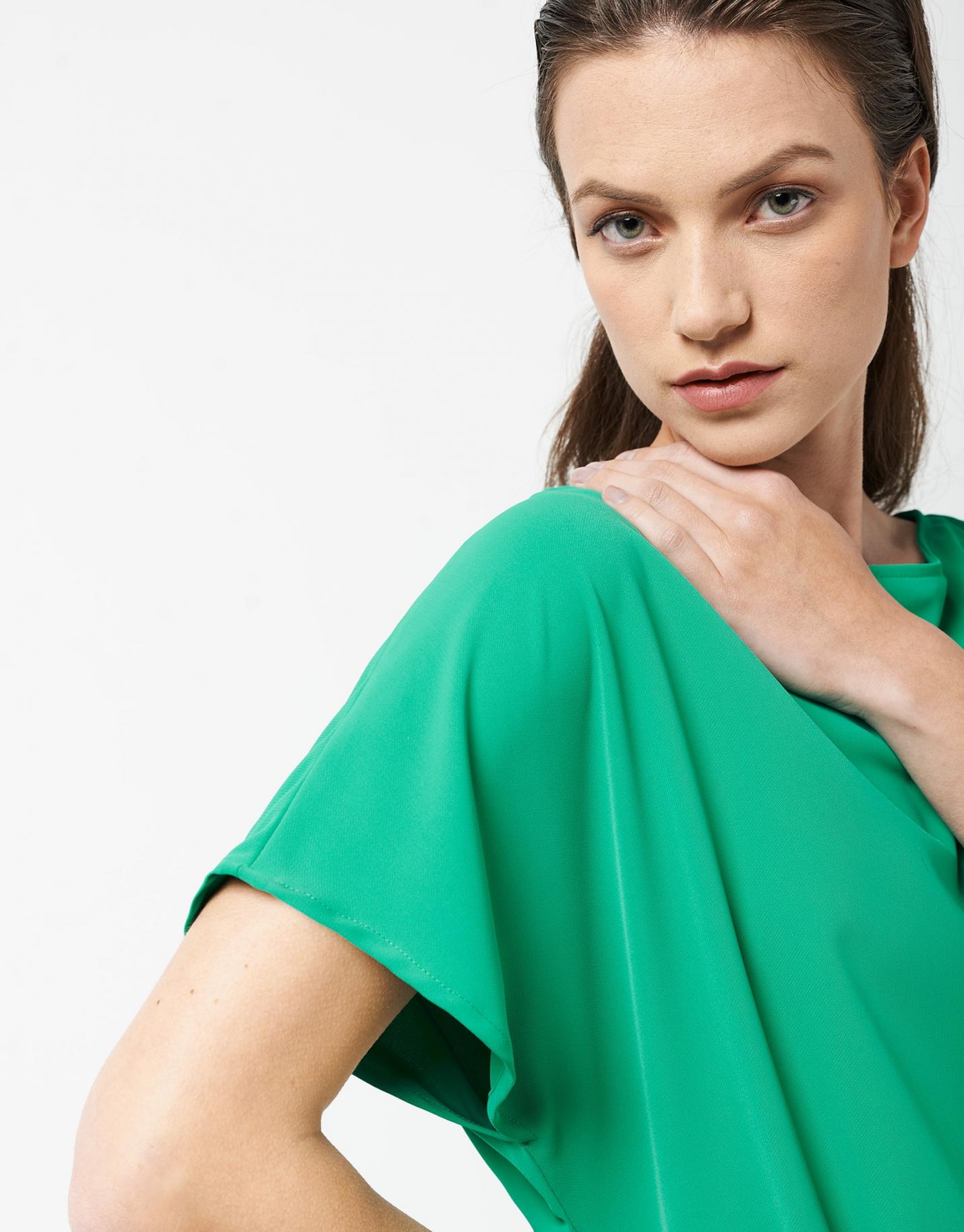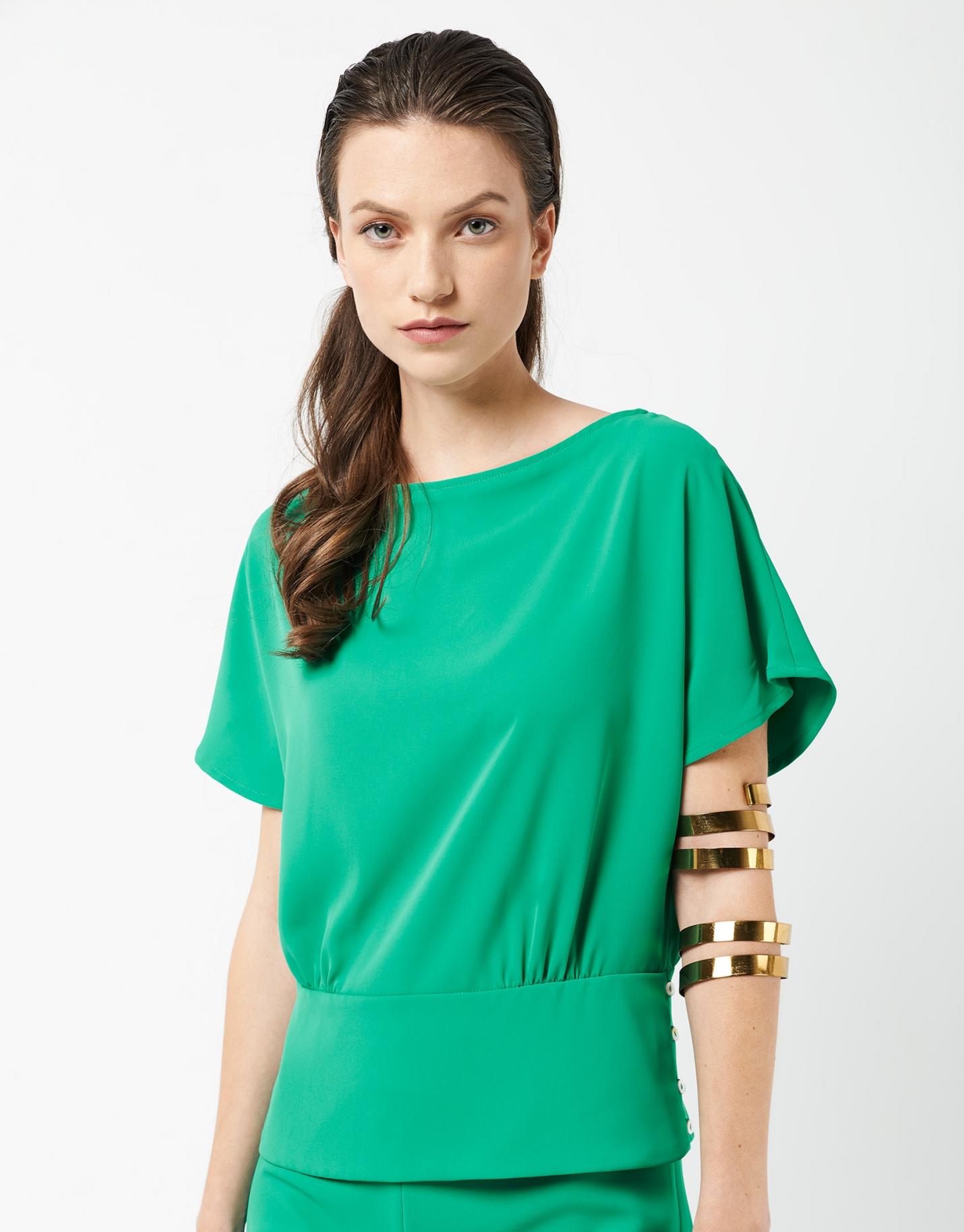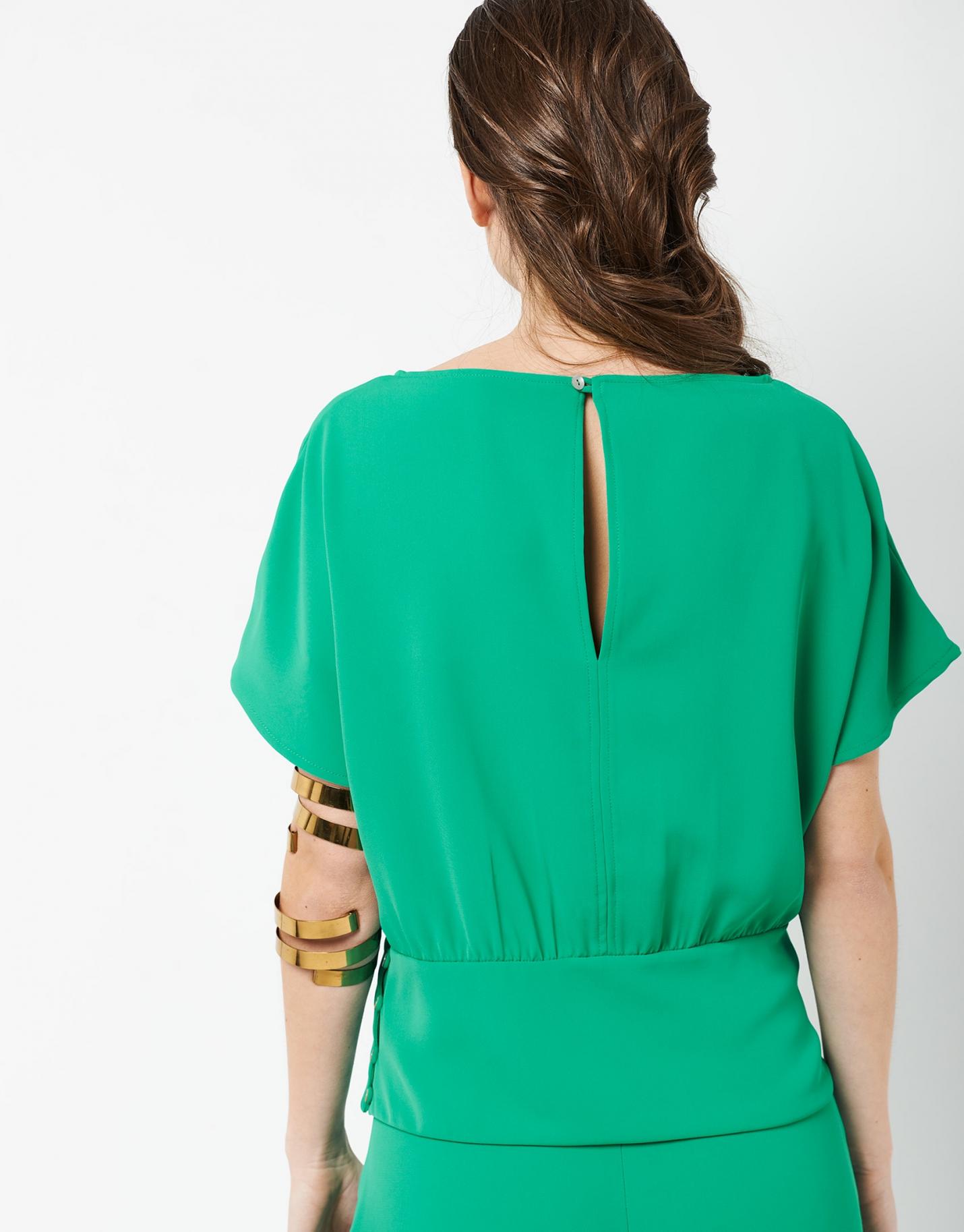 Blusa confeccionada en un tejido verde con escote barco. Cierre con lágrima y botón en espalda, manga corta murciélago y bajo con cinturilla ancha y botones es cadera izquierda.