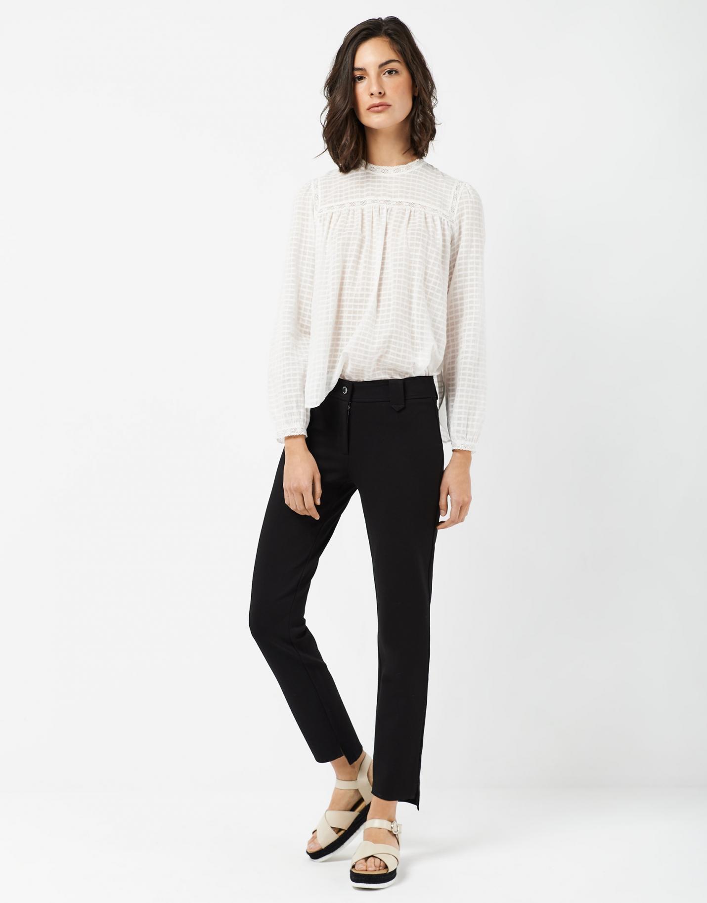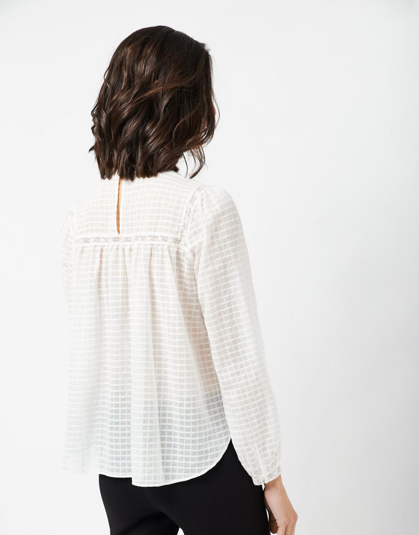 Blusa fluida confeccionada en un voile de algodón con dibujo de cuadros. Escote redondo con puntilla y cierre con lágrima de botón. Canesú en delantero con fruncido y puntilla y bajo redondeado con largo asimétrico. Manga larga rematada en puño de puntilla.