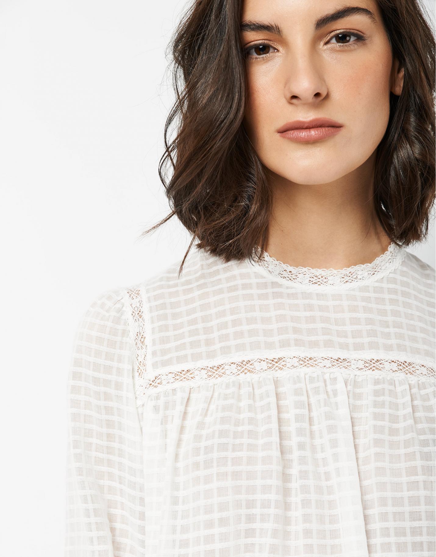 Blusa fluida confeccionada en un voile de algodón con dibujo de cuadros. Escote redondo con puntilla y cierre con lágrima de botón. Canesú en delantero con fruncido y puntilla y …
