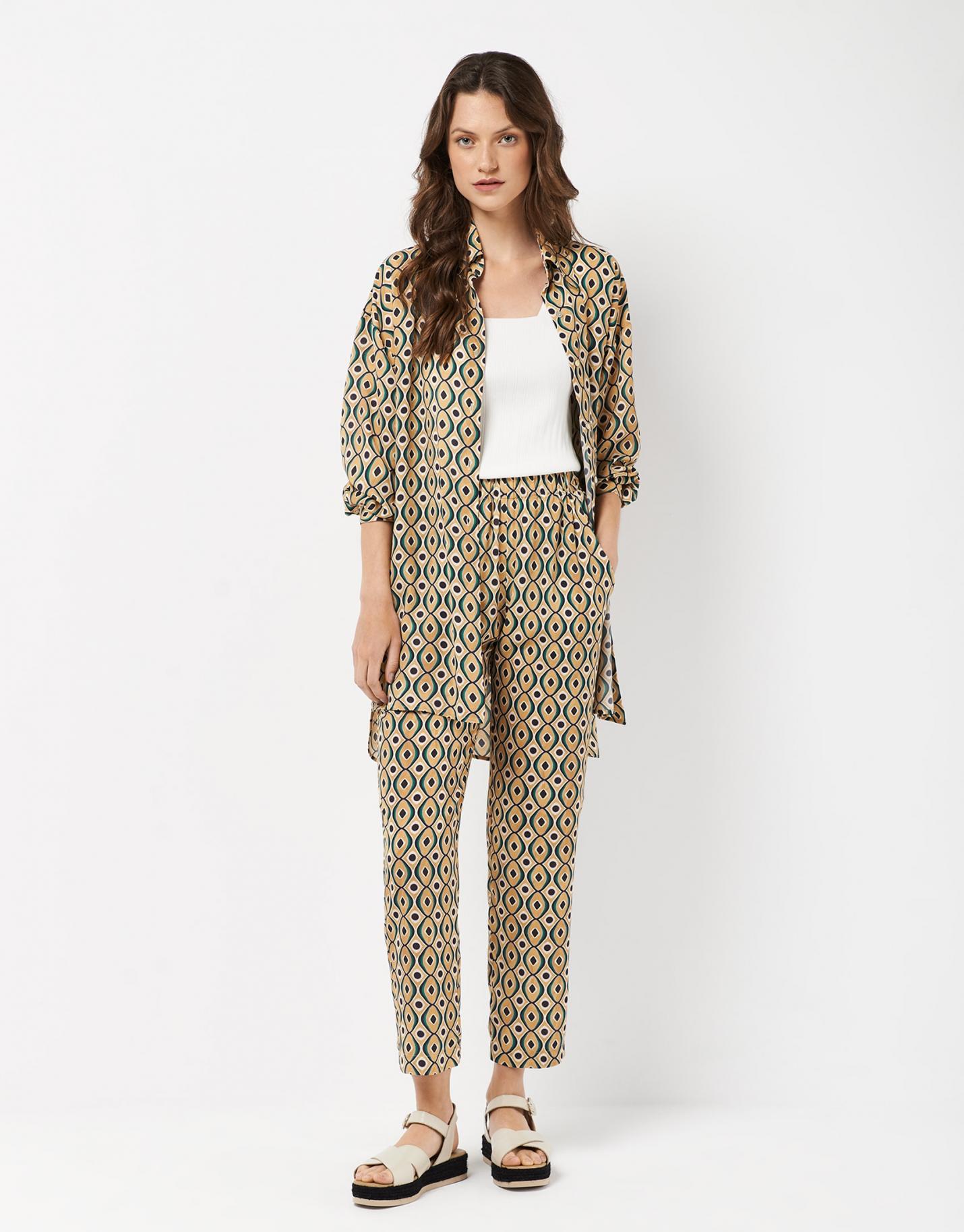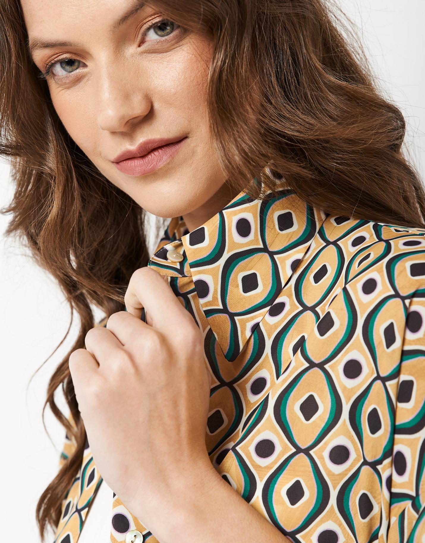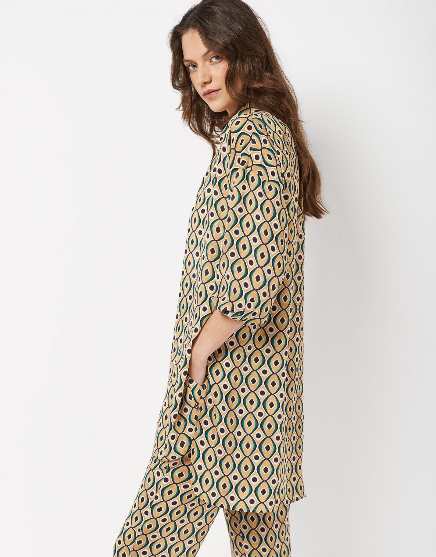 Blusón de manga larga confeccionado en un tejido fluido estampado geométrico en tonos verdes y amarillos con bajo …