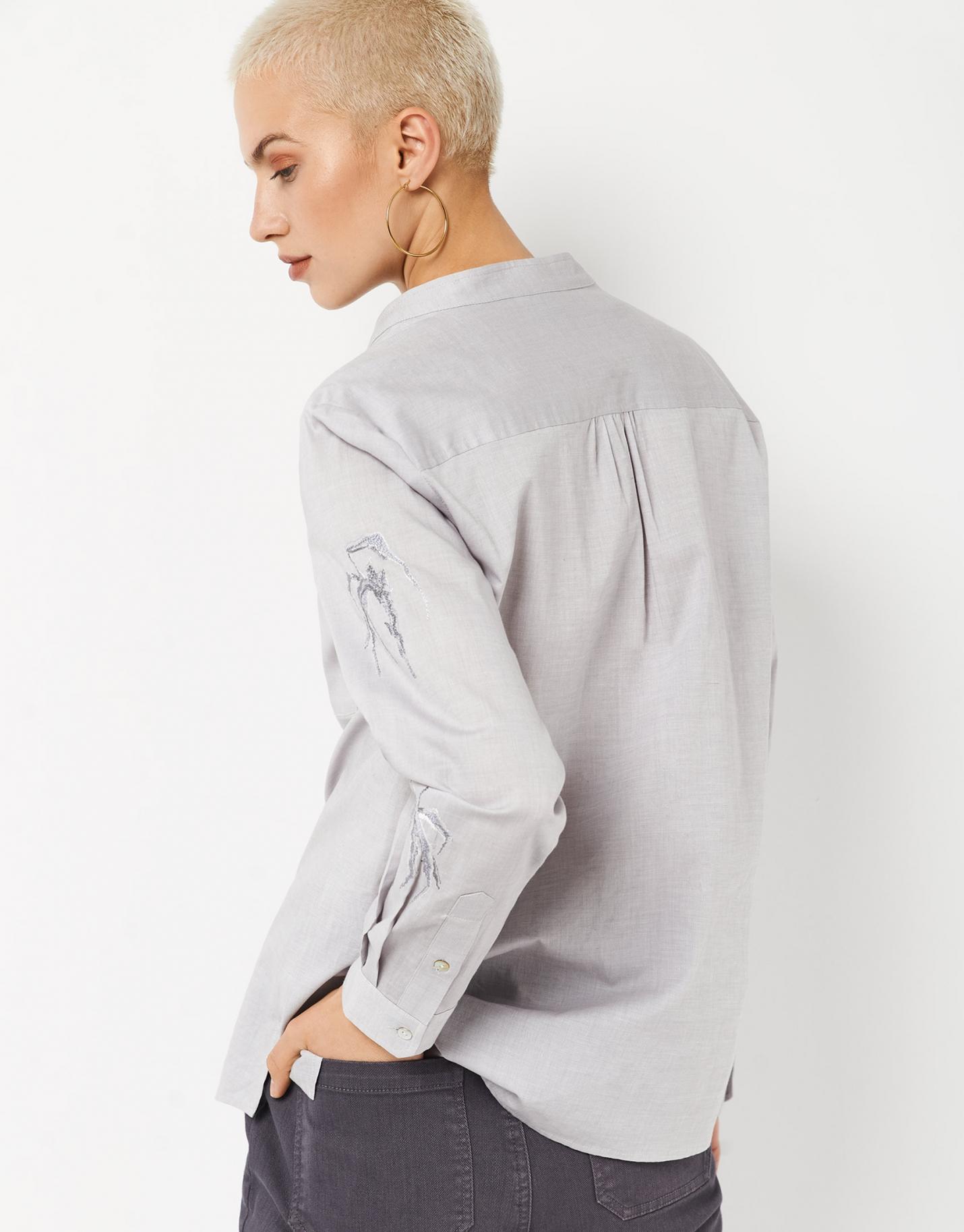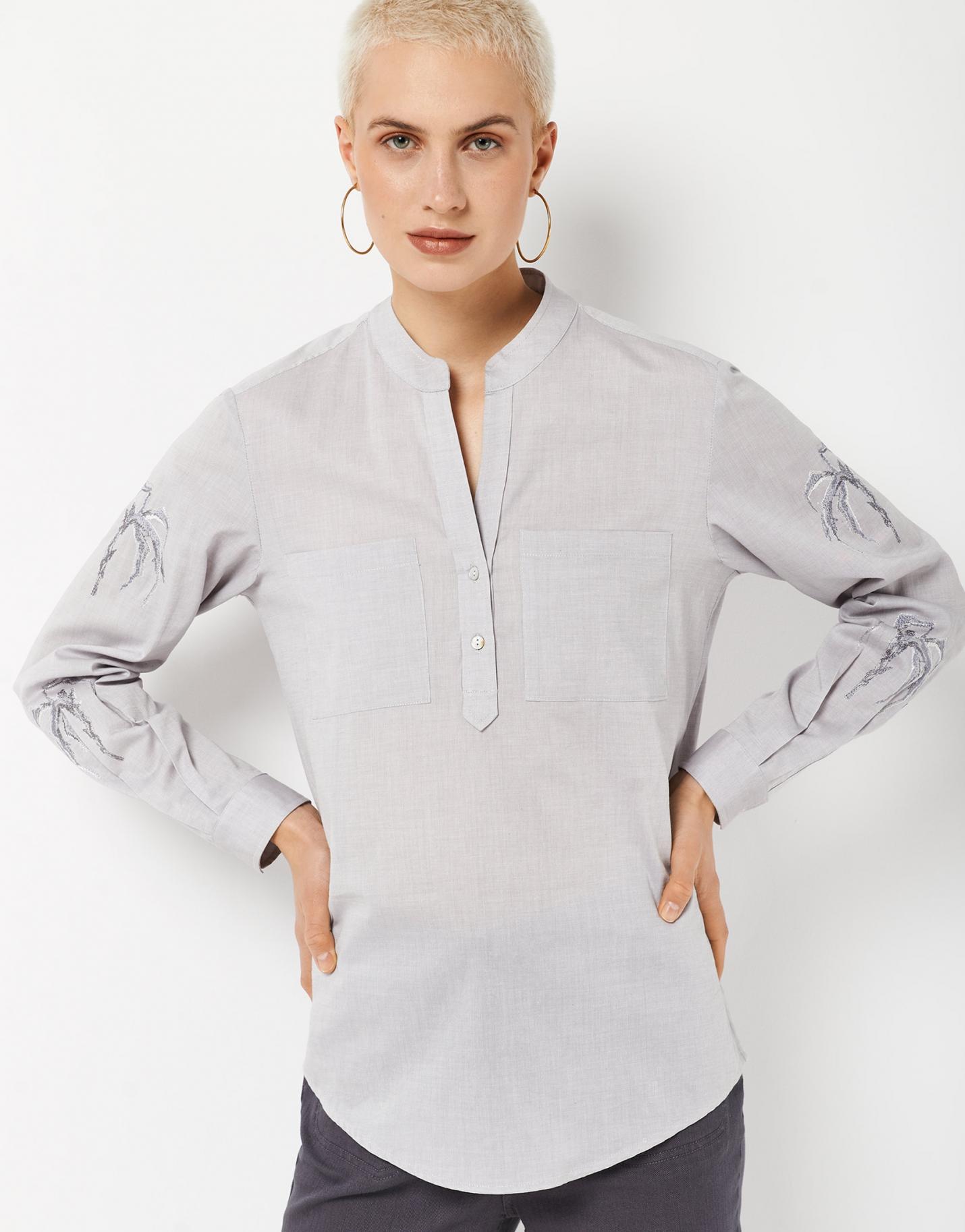Camisa de manga larga confeccionada en un algodón gris con bordado a tono de flor en mangas. Cuello mao con botonadura hasta medio cuerpo, canesú en delantero y espalda y dos bolsillos en pecho.