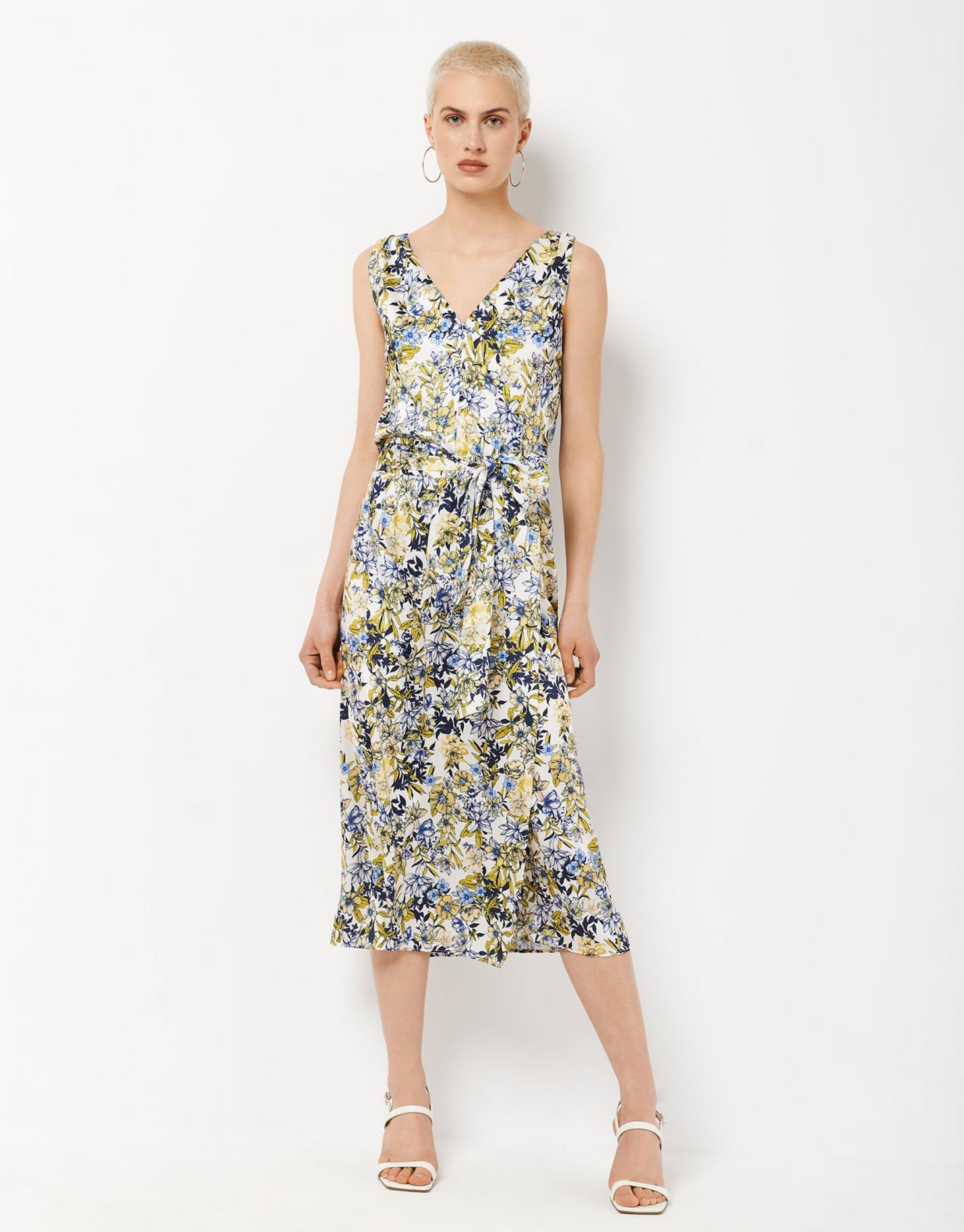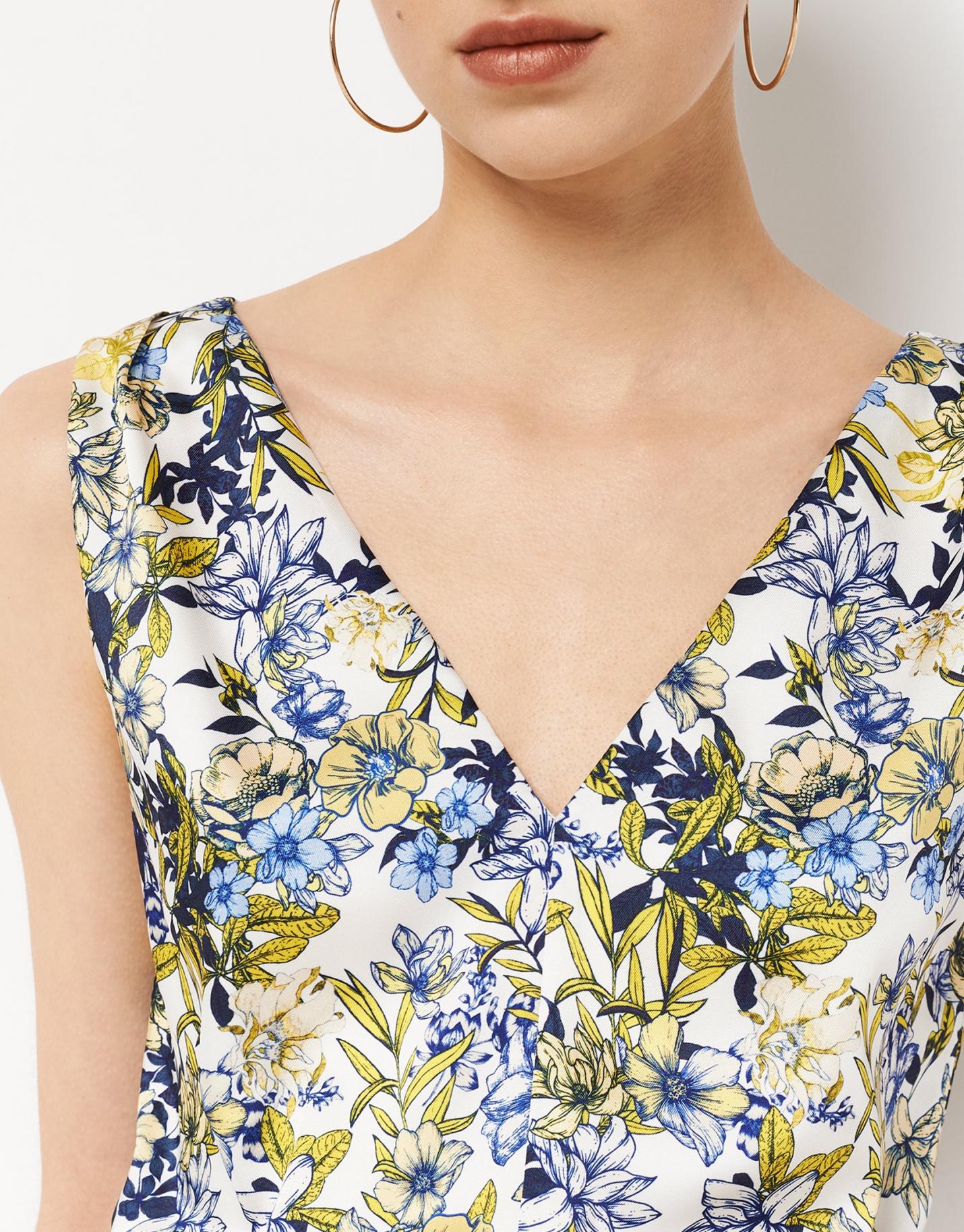 Top sin mangas confeccionado en un tejido blanco con estampado floral en amarillos y azules. Escote pico, costura en delantero y bajo con aberturas.