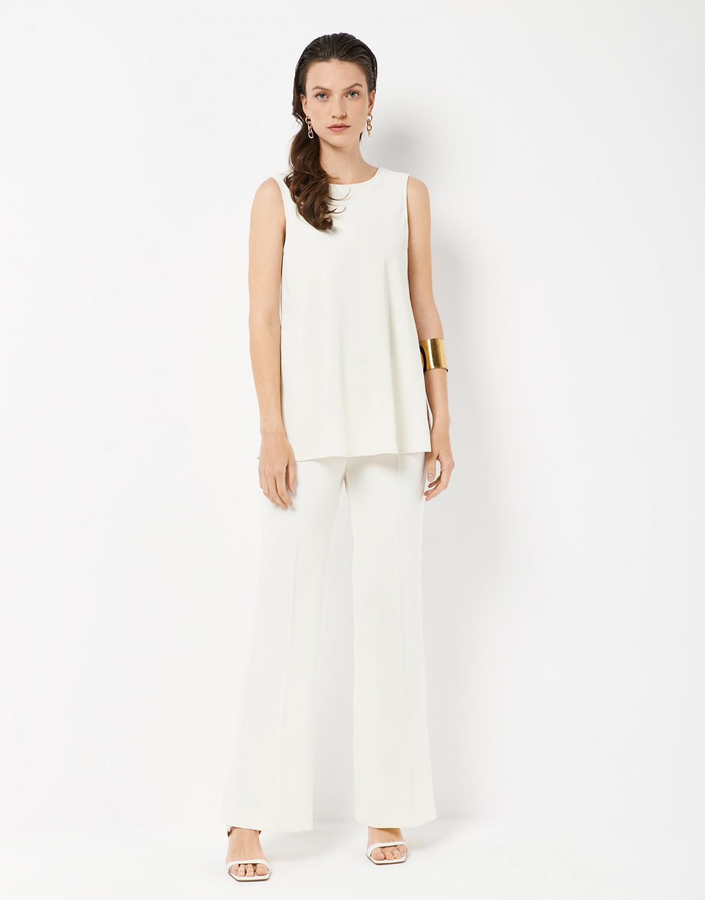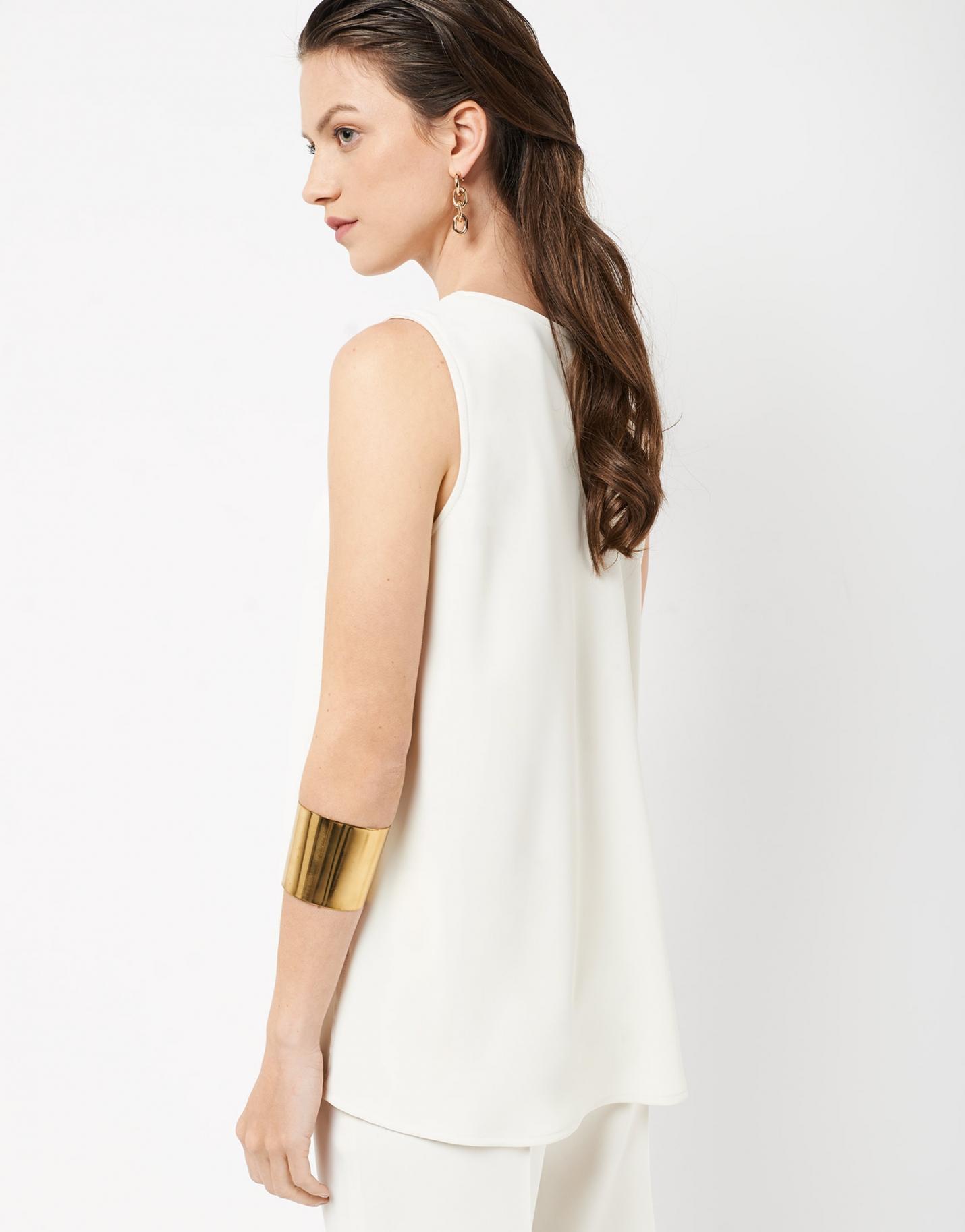 Top sin mangas de corte evasé confeccionado en un tejido liso color crudo. Escote barco con cierre de lágrima y botón en espalda y aberturas laterales en el bajo.