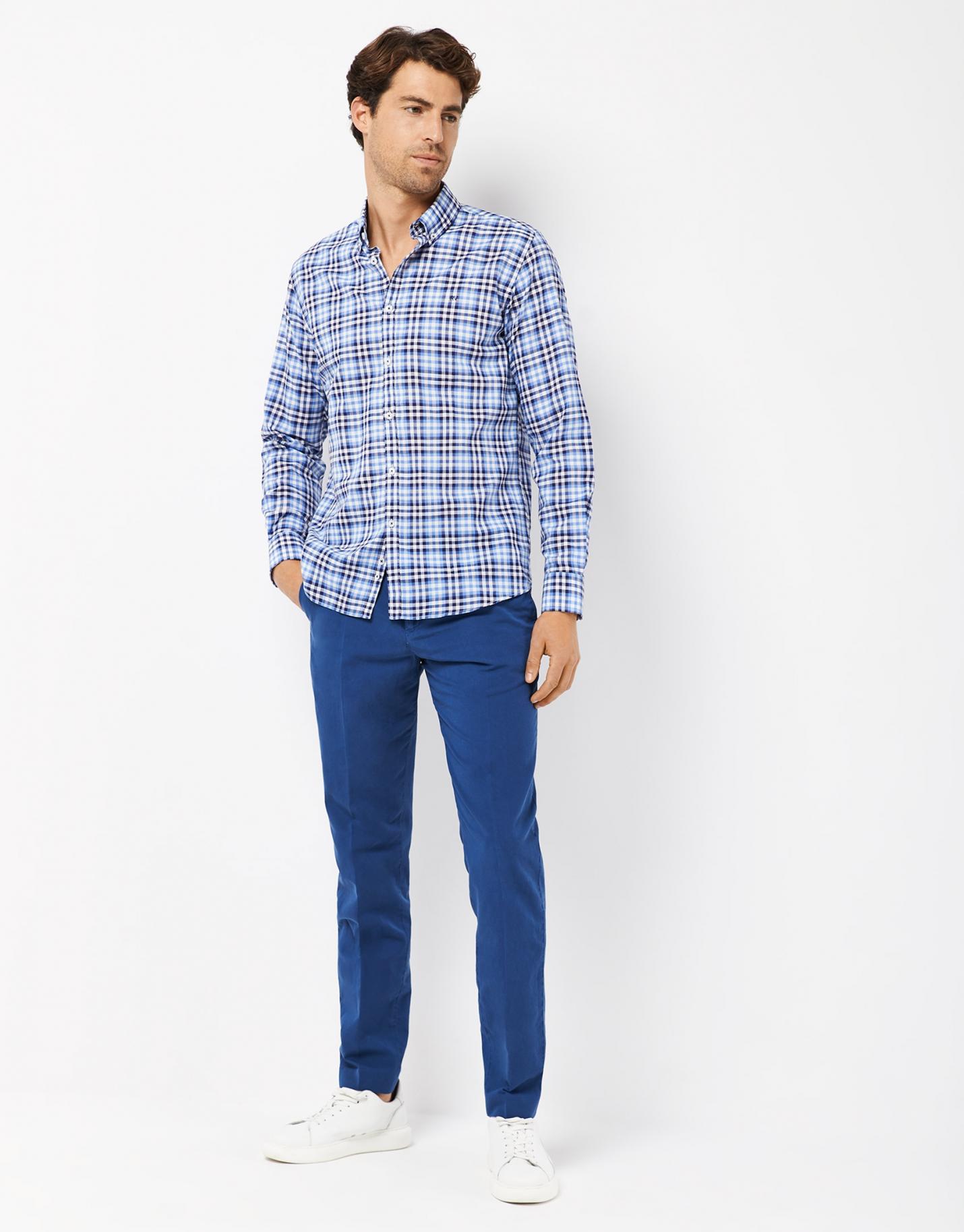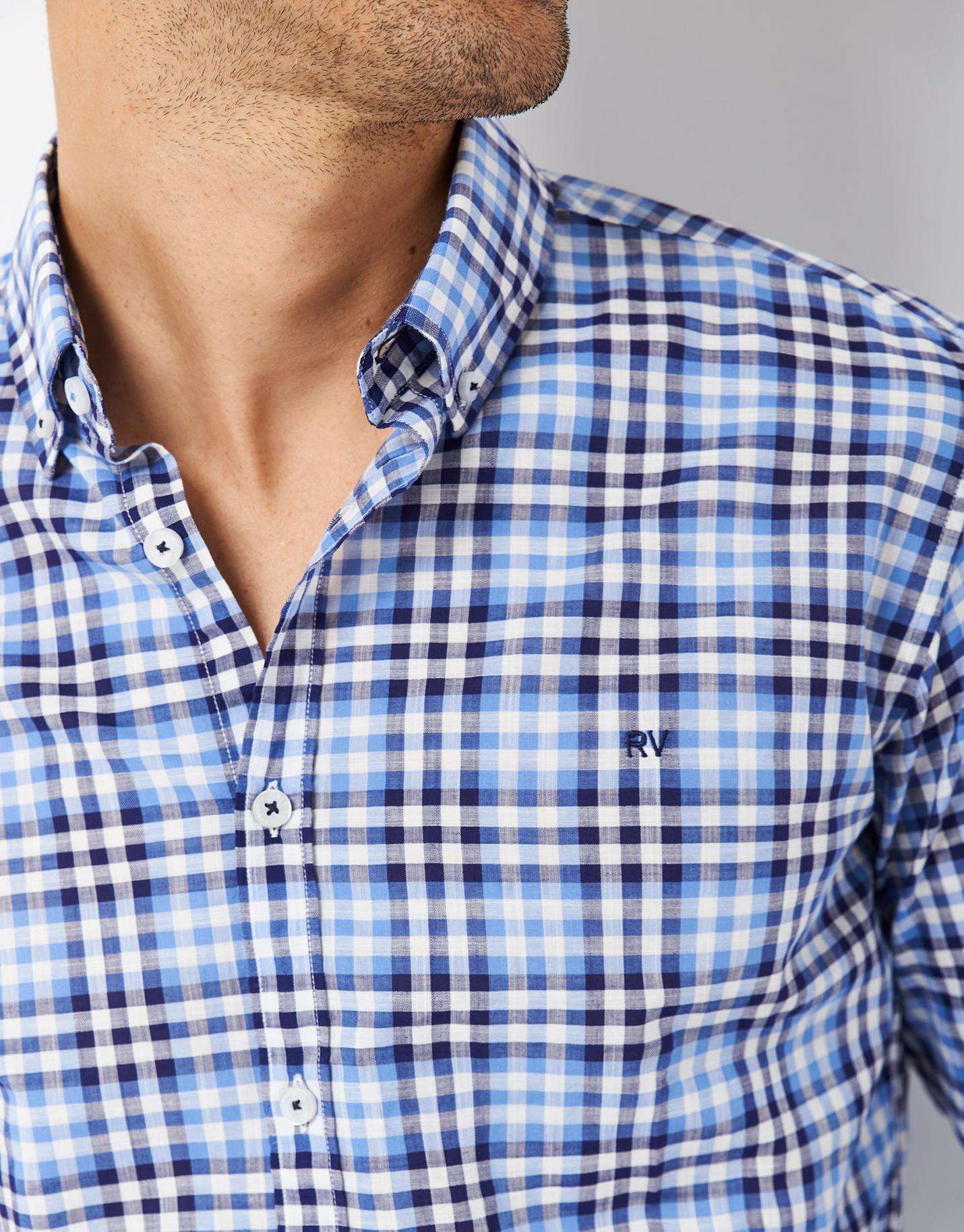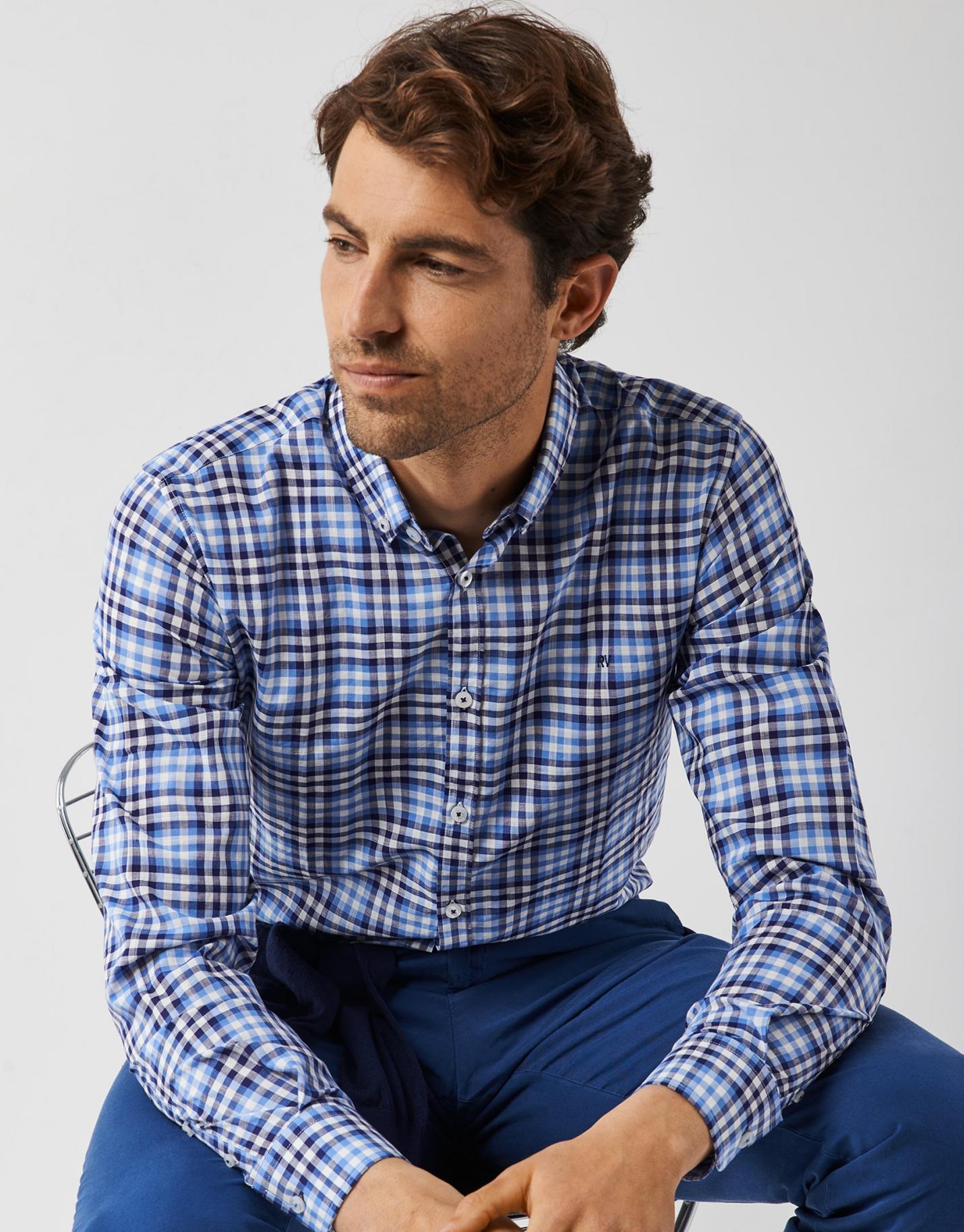 Camisa sport confeccionada en un algodón de cuadros con perfiles en tonos de azul y blanco. Corte regular fit, cuello pico con botón, cierre mediante botonadura frontal y manga larga terminada en puño abotonado. Bordado RV en pecho.