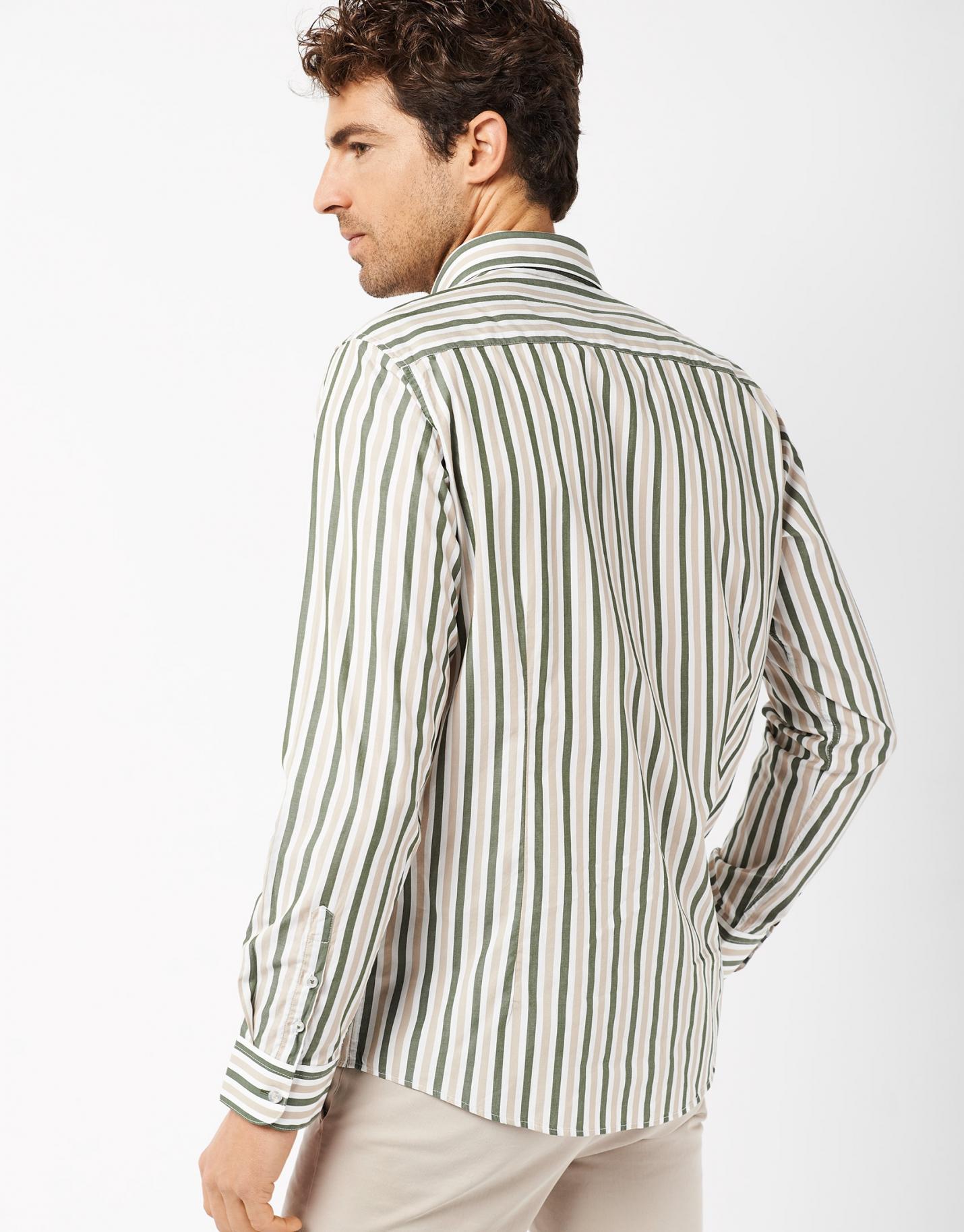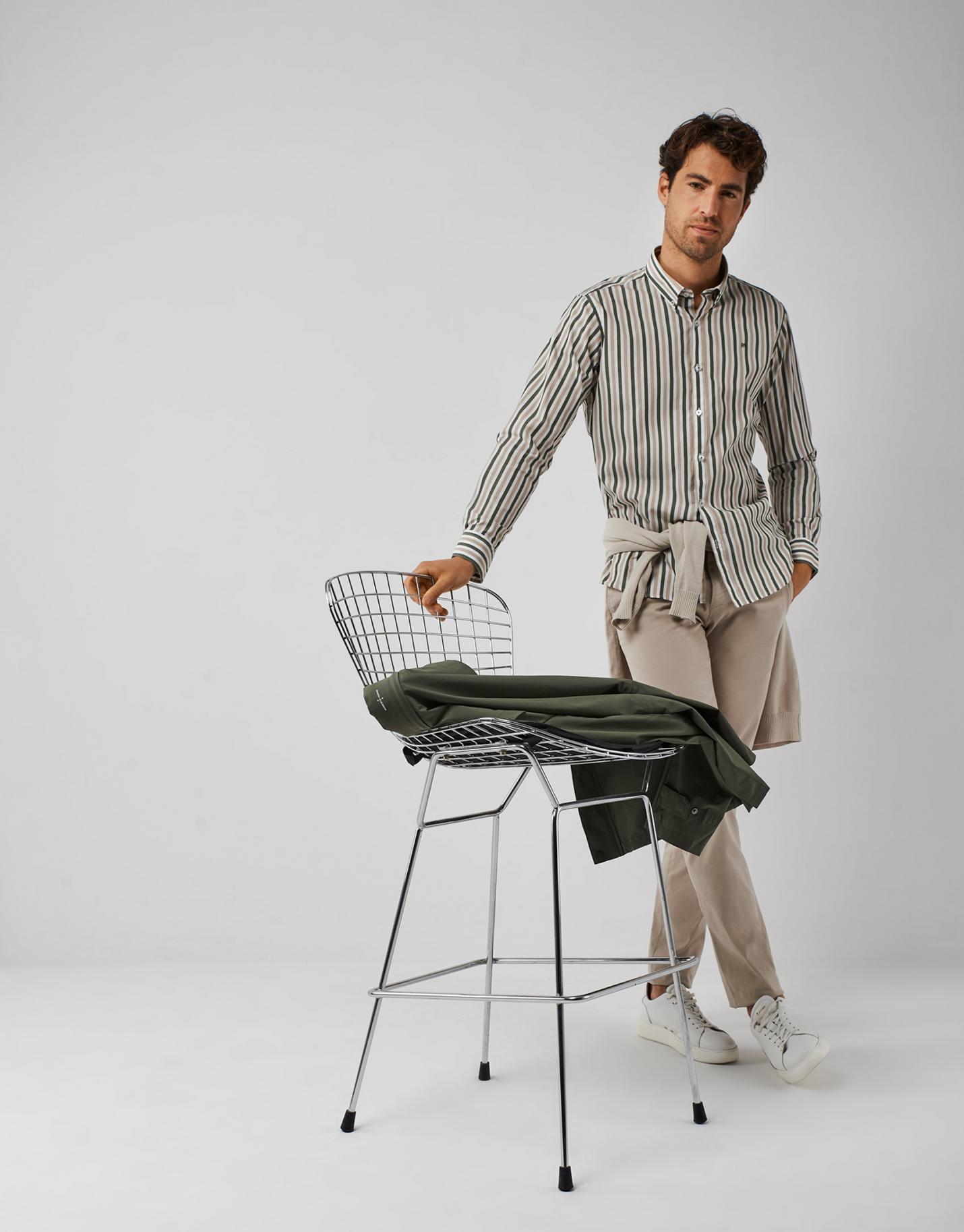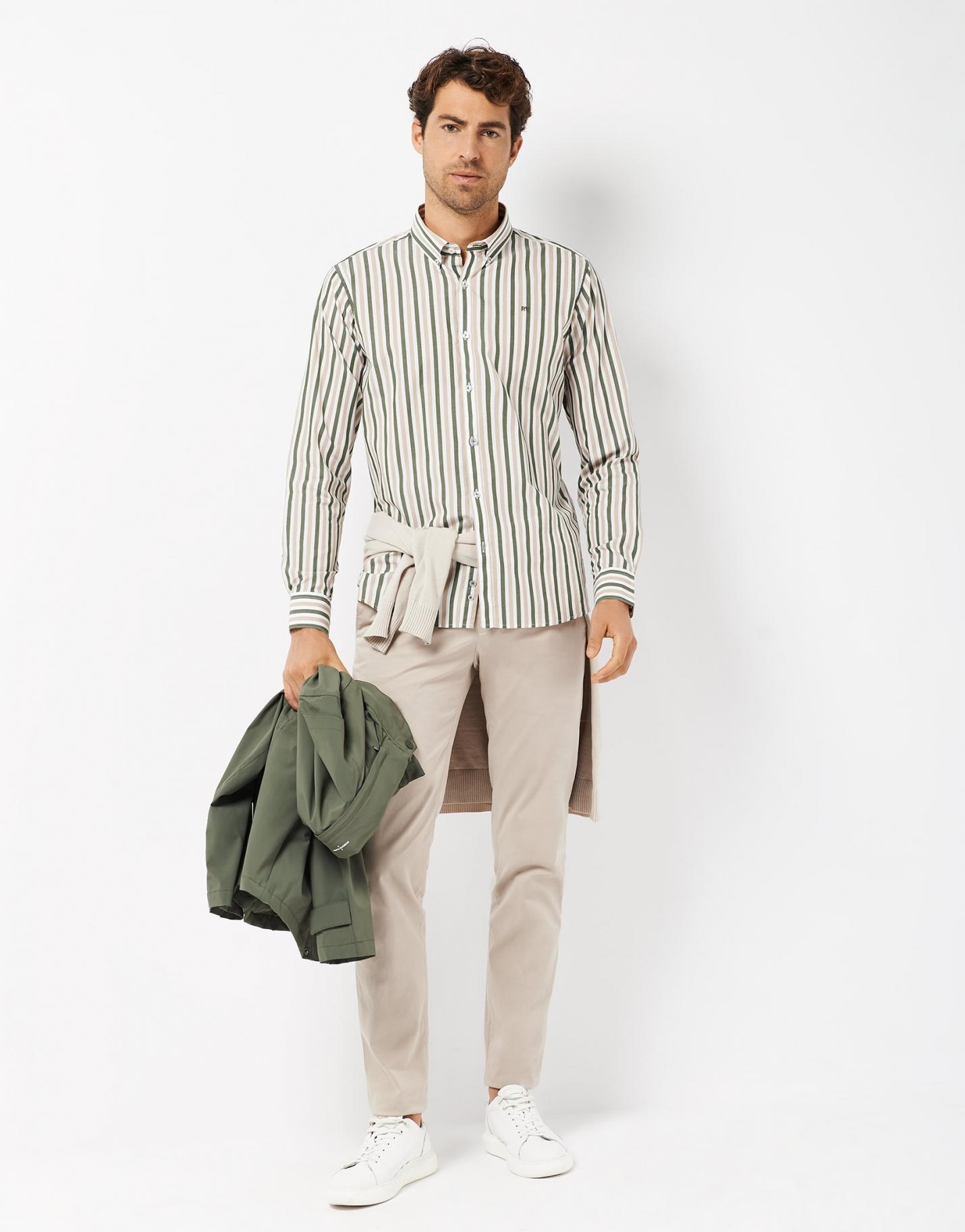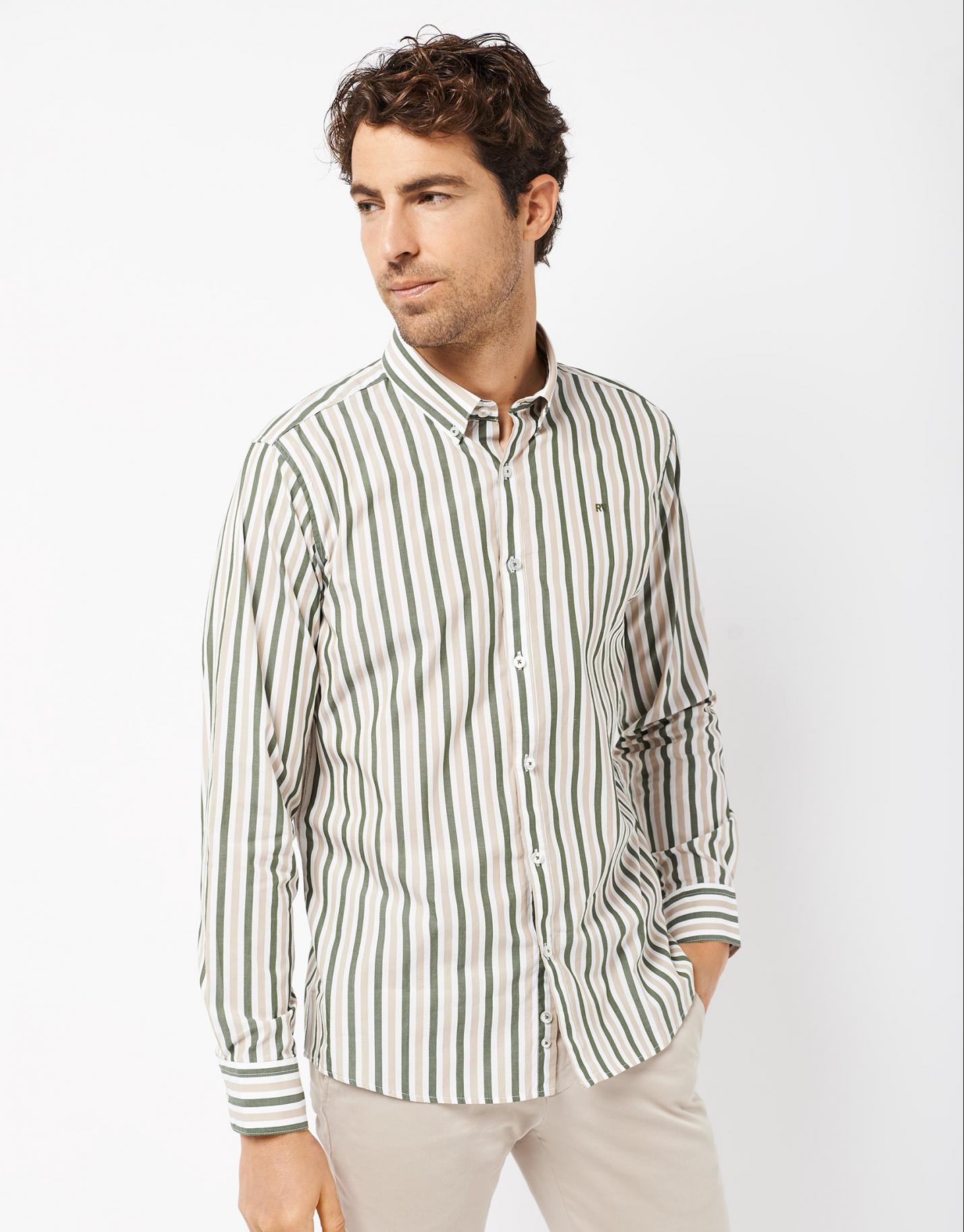 Camisa sport confeccionada en un algodón a rayas anchas en caqui, cámel y blanco. Corte regular fit, cuello pico con botón, cierre mediante botonadura frontal y manga larga terminada …