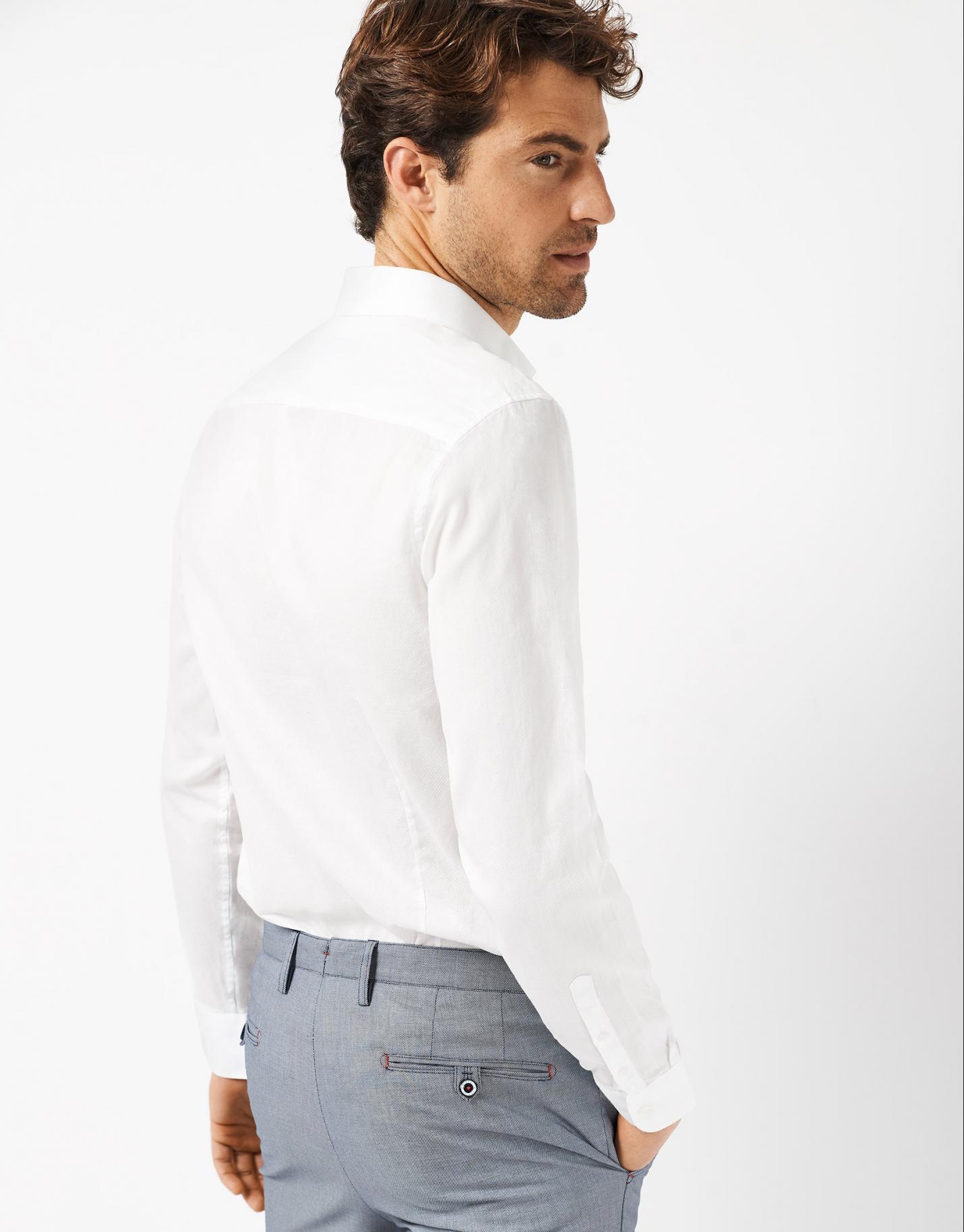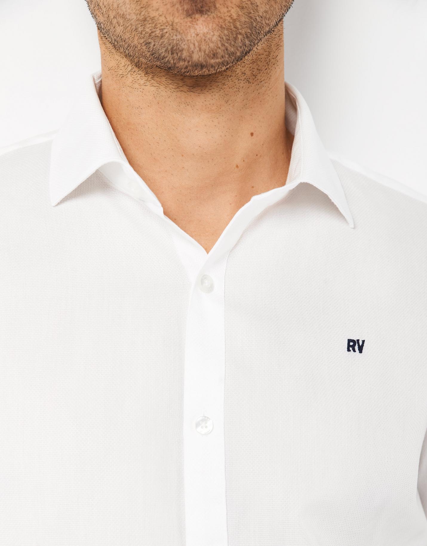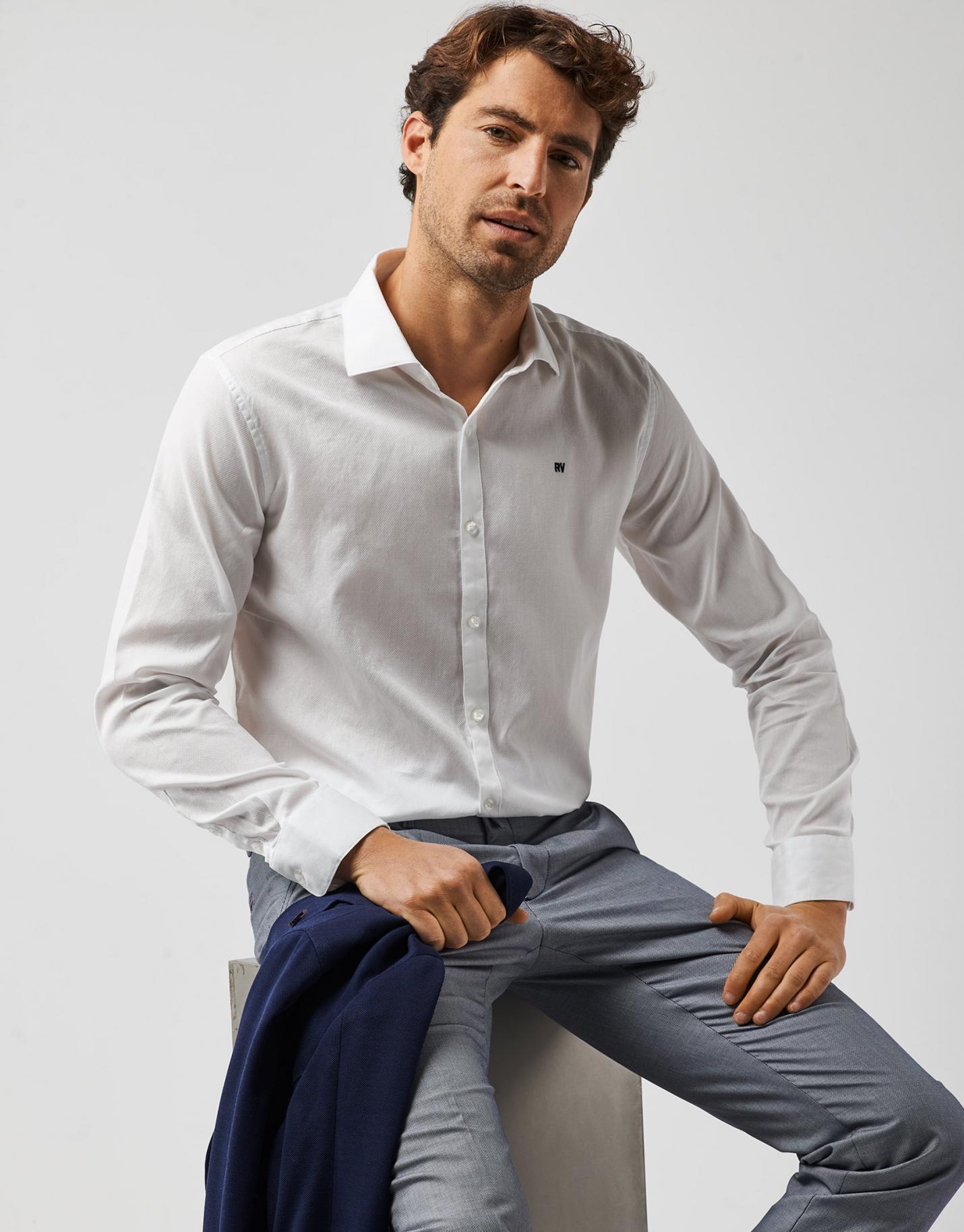 Camisa sport confeccionada en un falso liso de algodón en color blanco óptico. Corte slim, cuello italiano, manga larga y bordado RV en pecho.