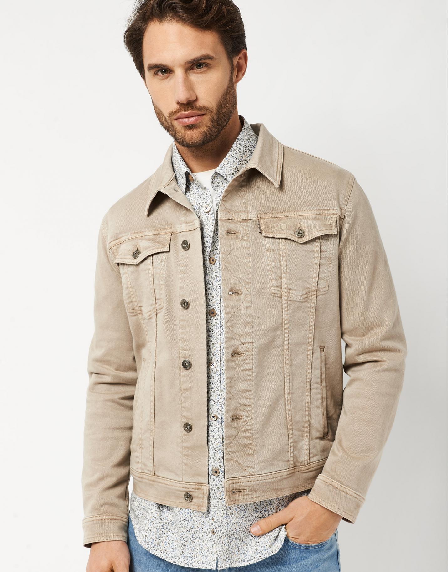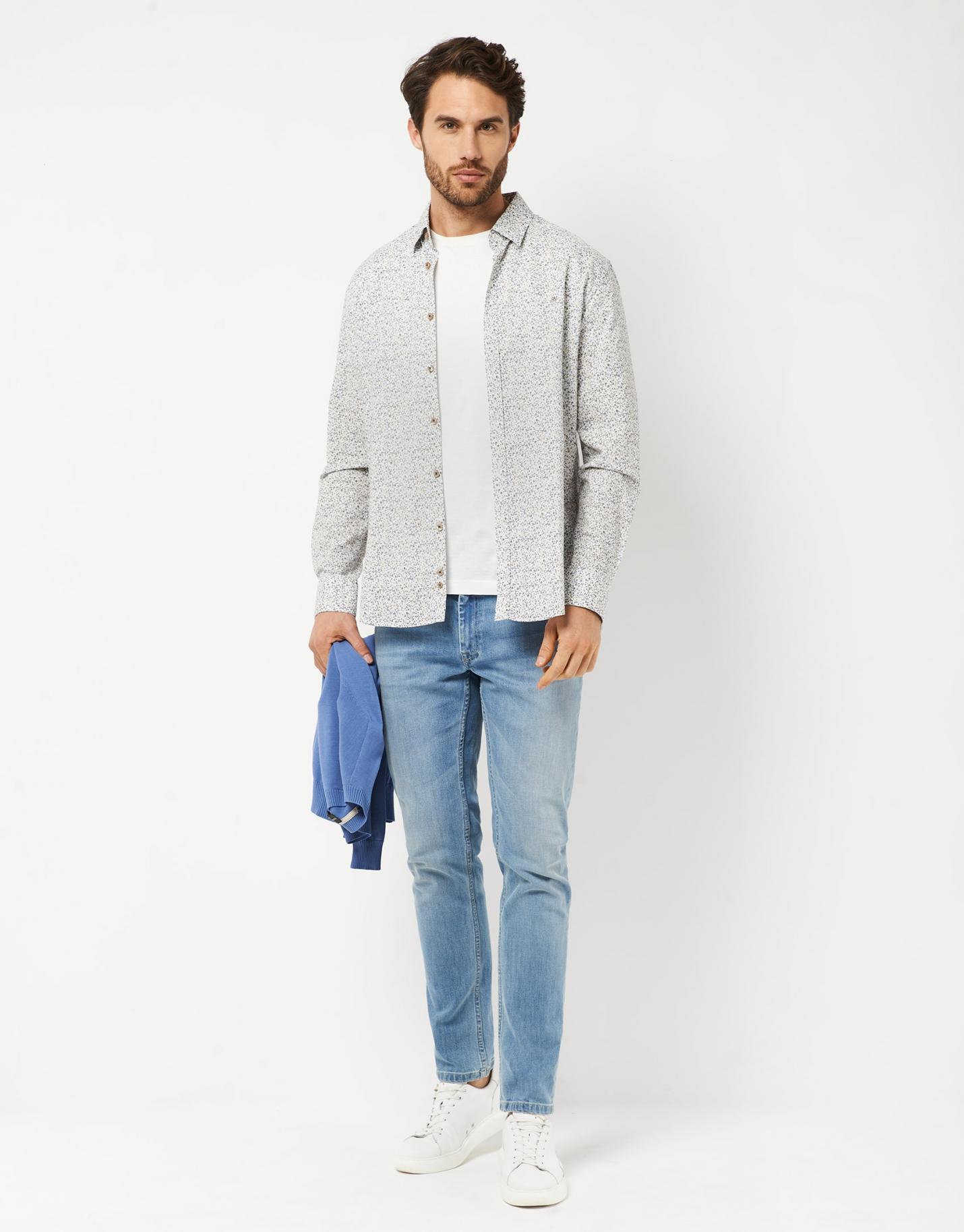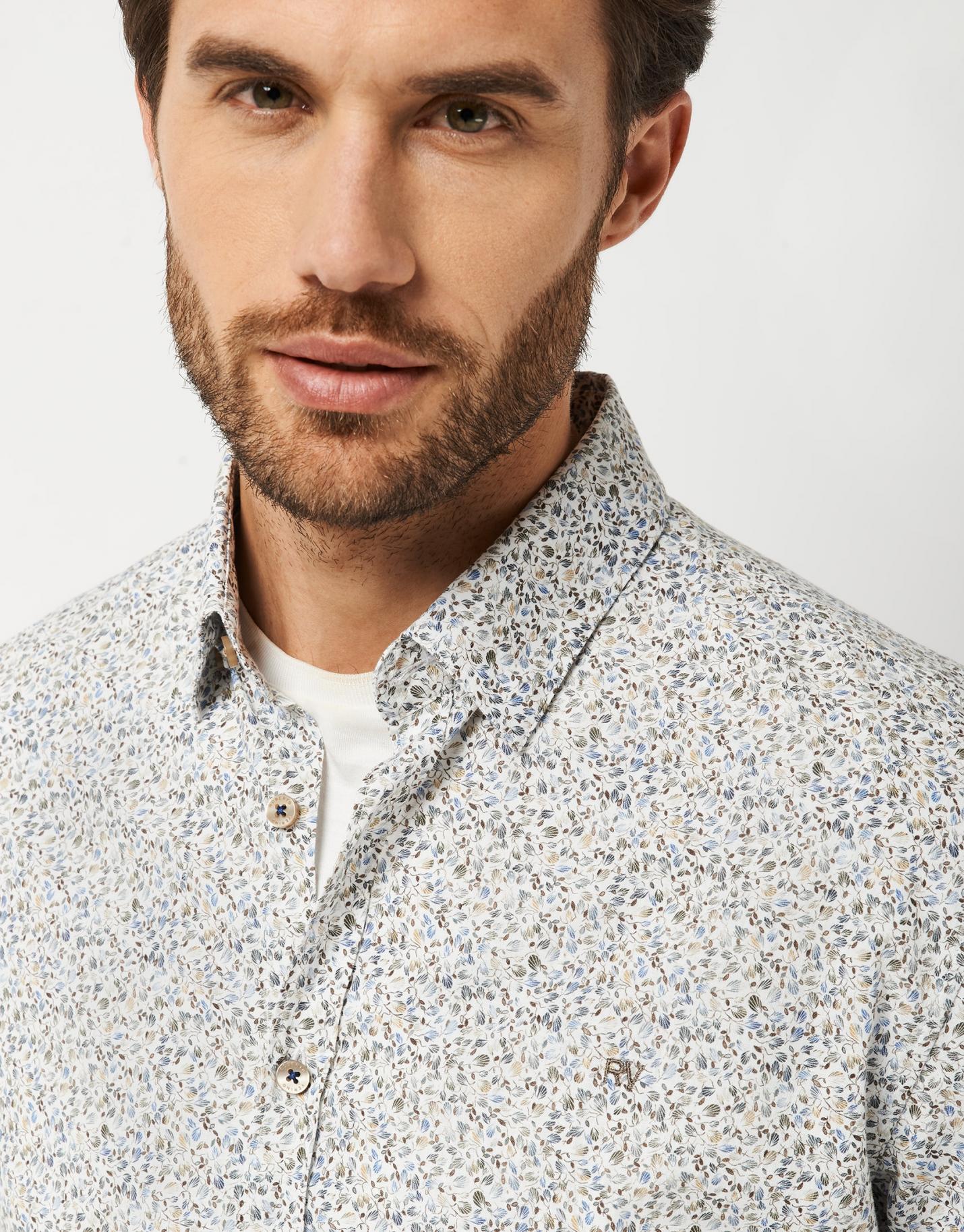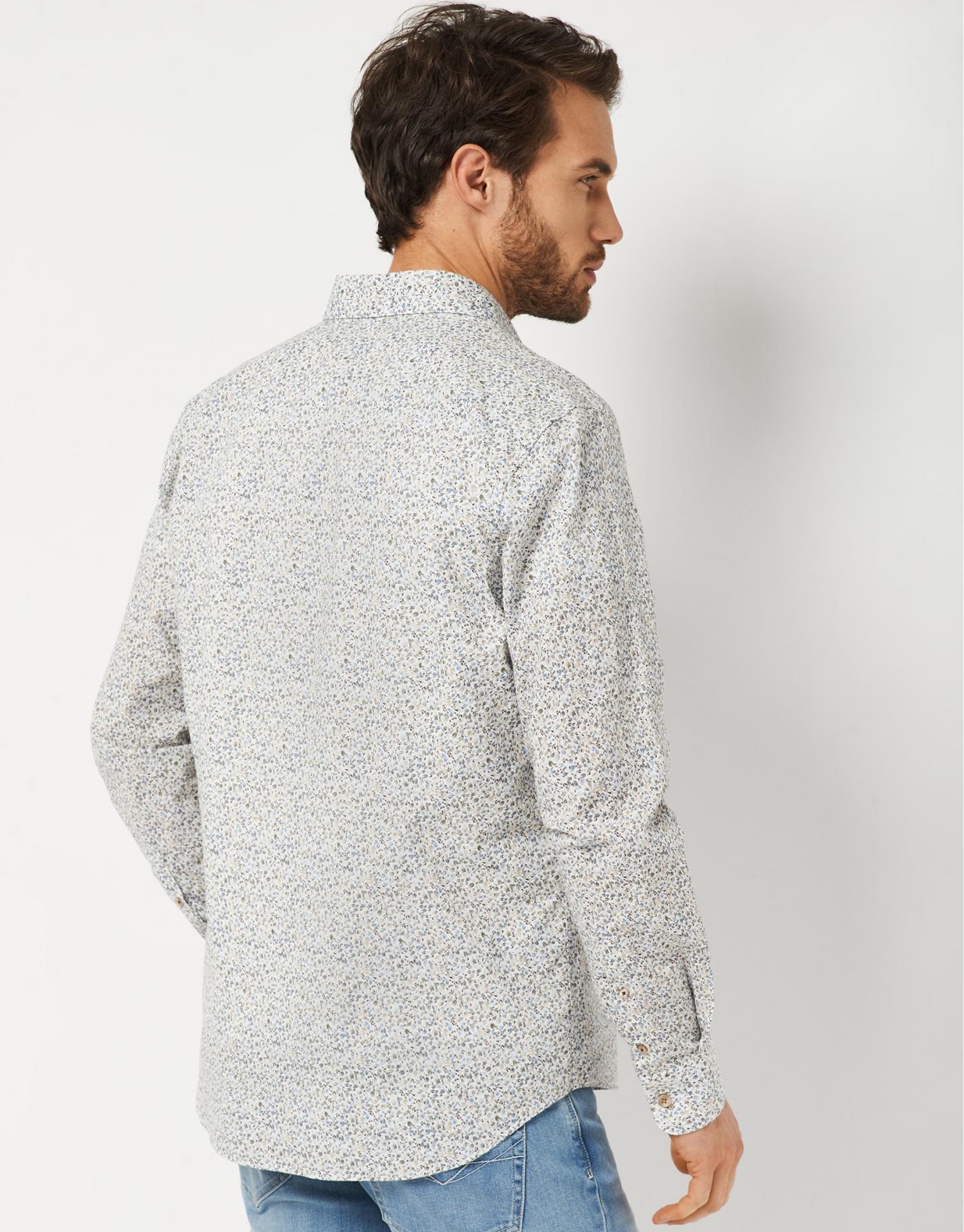 Camisa sport de corte slim fit confeccionada en un algodón con estampado de hojas en tonos tostados y azules. Cuello button down, cierre mediante botonadura frontal y manga larga terminada en puño abotonado.