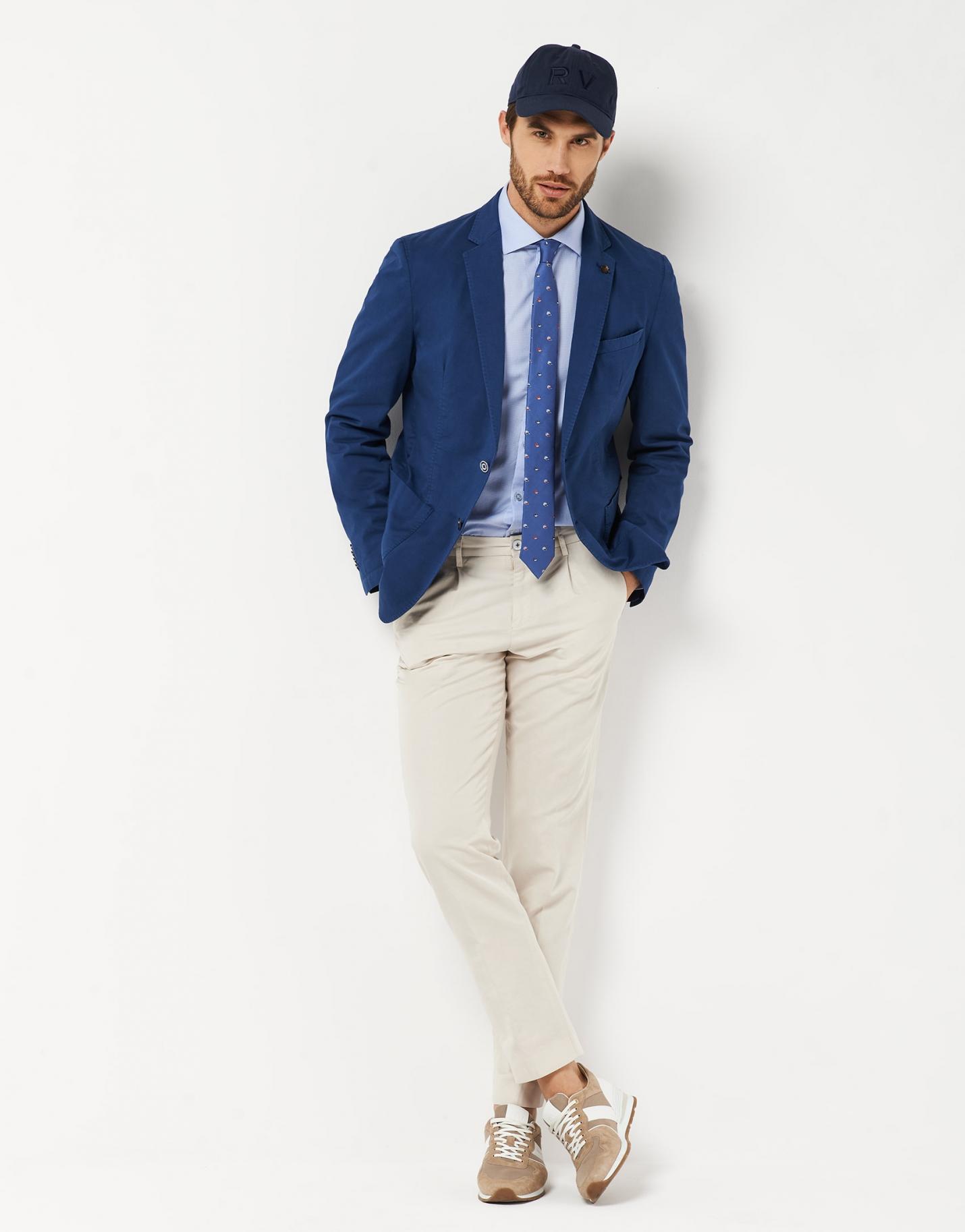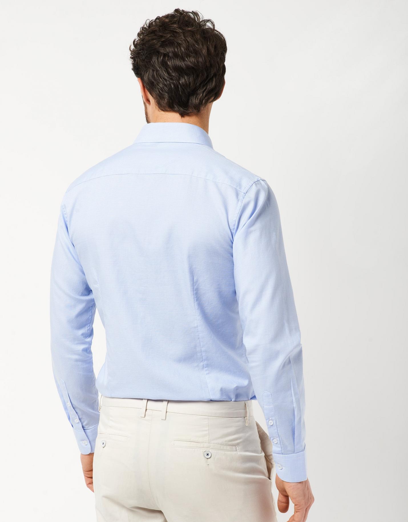 Camisa sport confeccionada en un algodón con dibujo de pata de gallo en color celeste. Corte slim, cuello italiano, manga larga y bordado RV en pecho.
