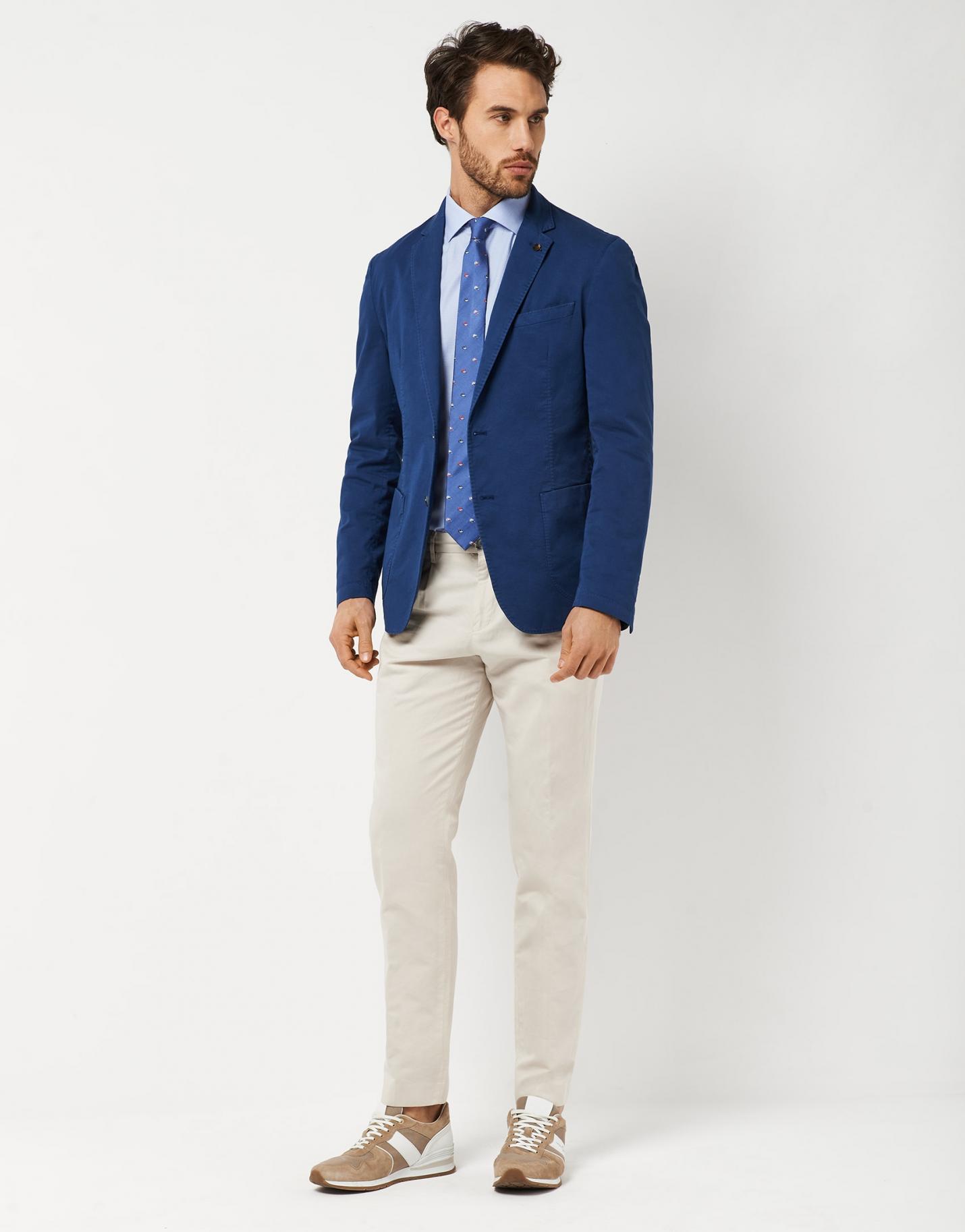 Camisa sport confeccionada en un algodón con dibujo de pata de gallo en color celeste. Corte slim, cuello italiano, …