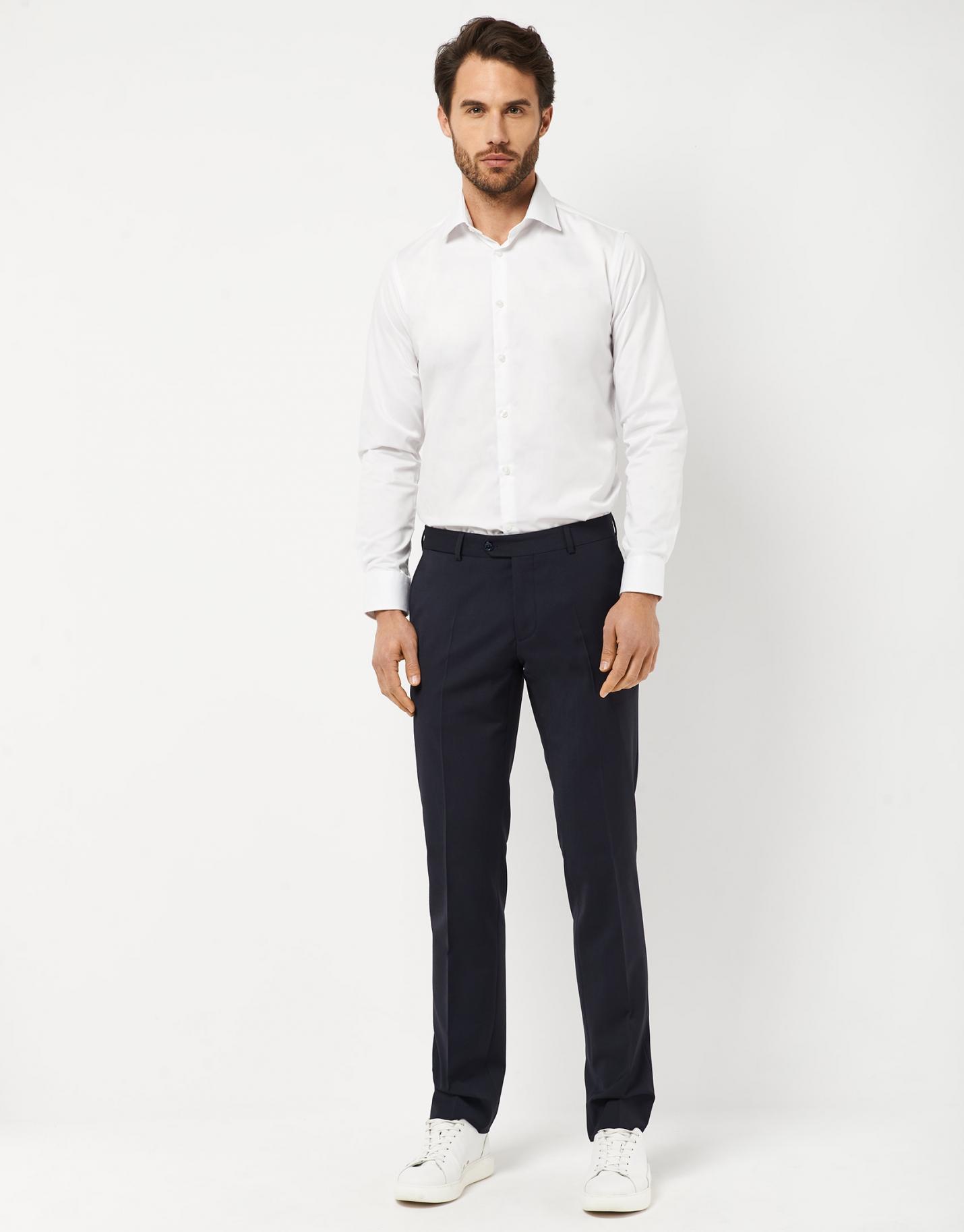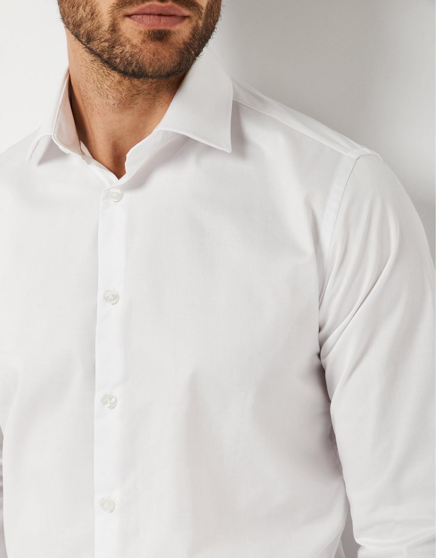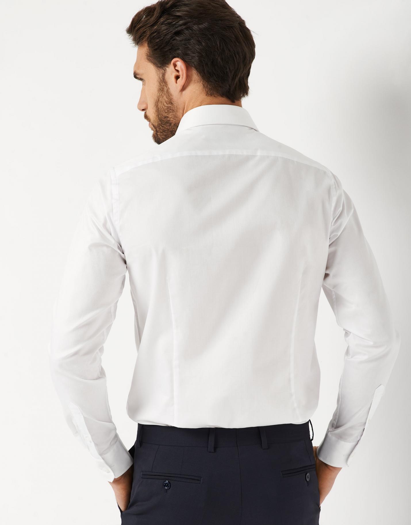 Camisa de vestir regular fit confeccionada en una sarga de algodón easy care color blanco. Cuello italiano, cierre mediante botonadura frontal y manga larga terminada en puño abotonado.