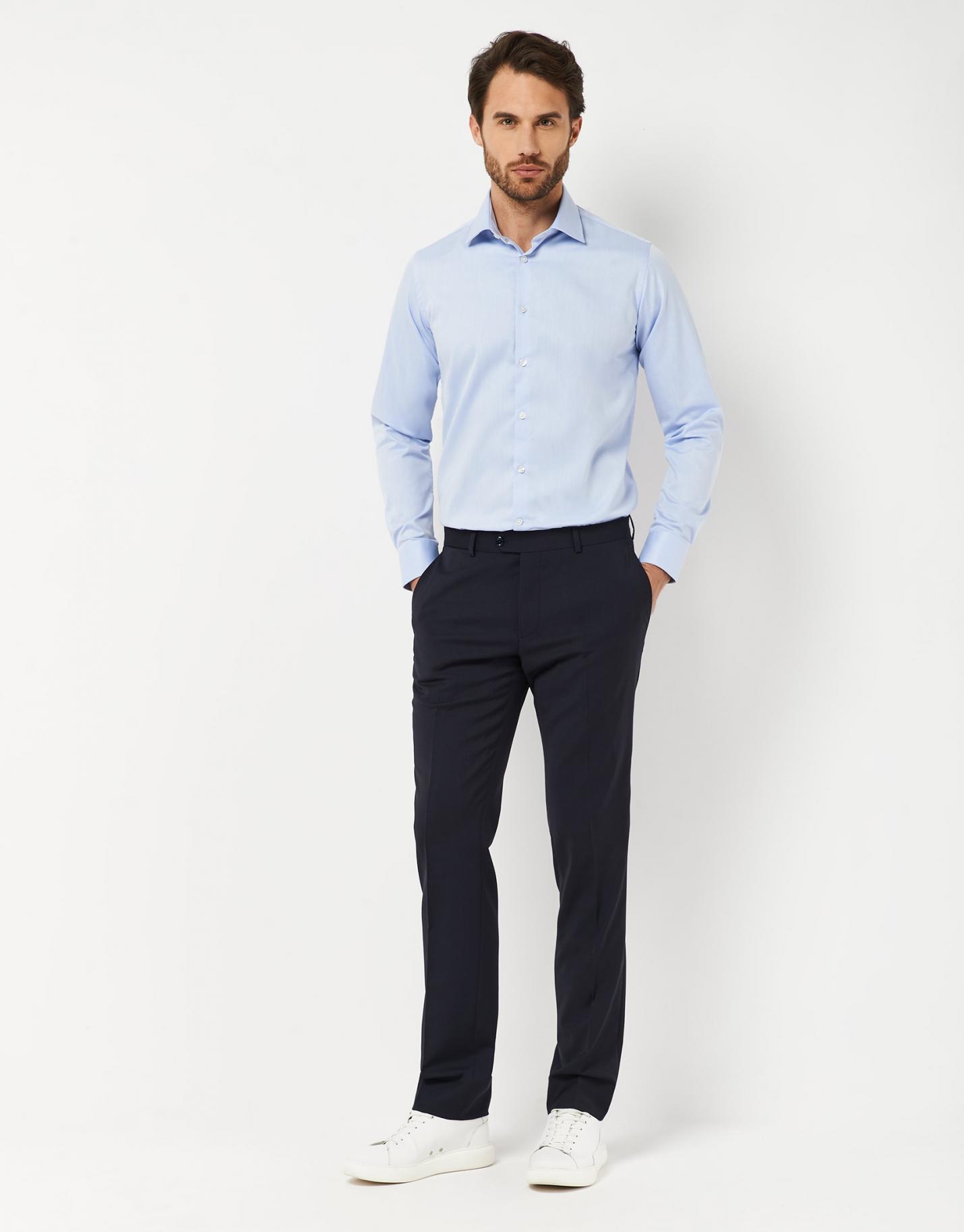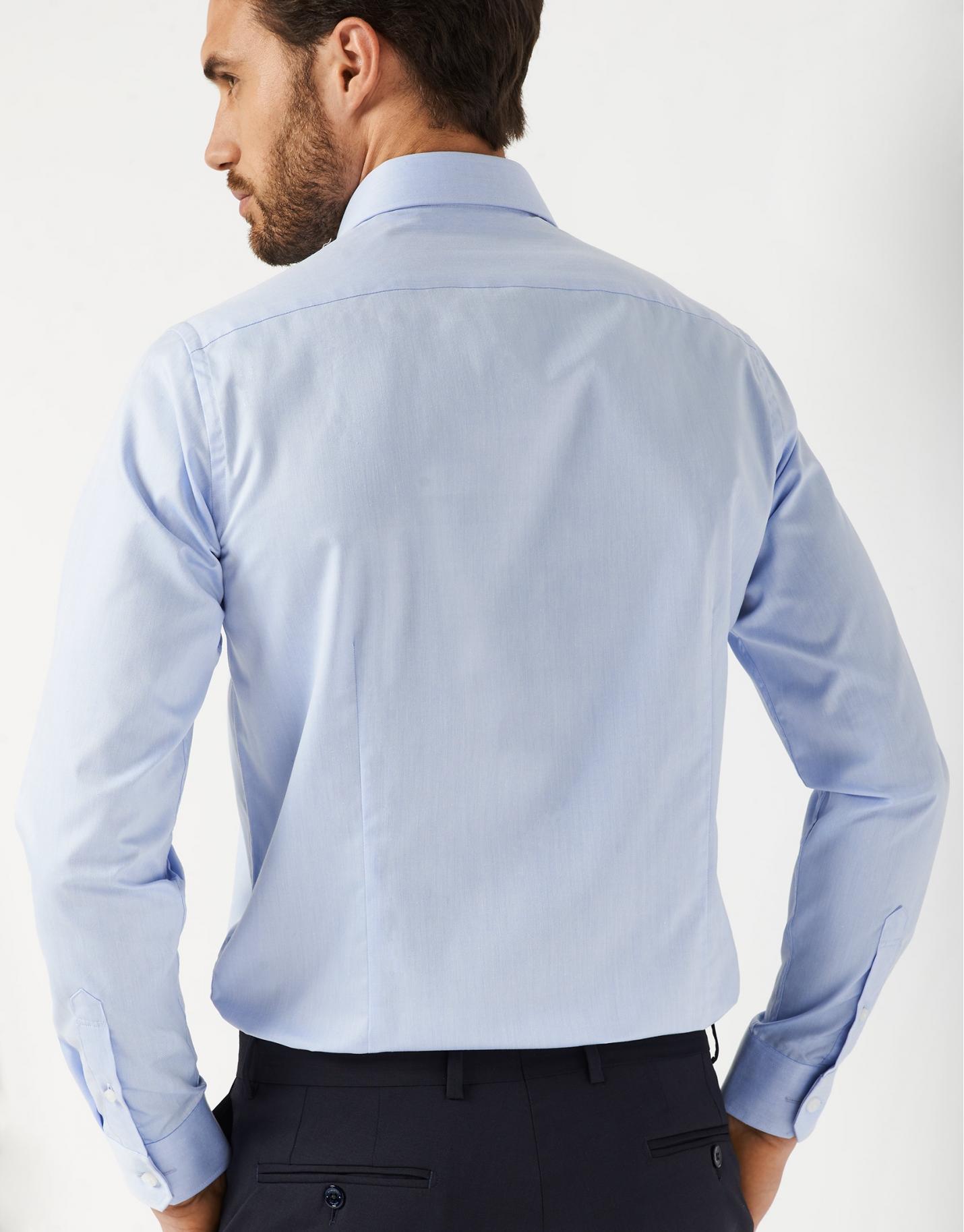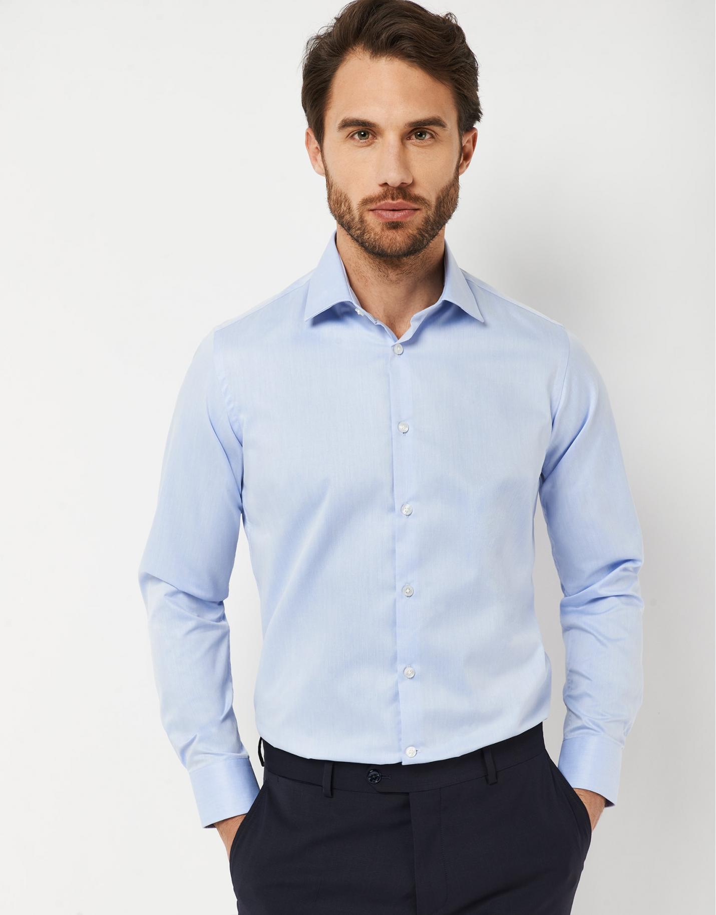 Camisa de vestir regular fit confeccionada en una sarga de algodón easy care color celeste. Cuello italiano, cierre mediante botonadura frontal y manga larga terminada en puño abotonado.