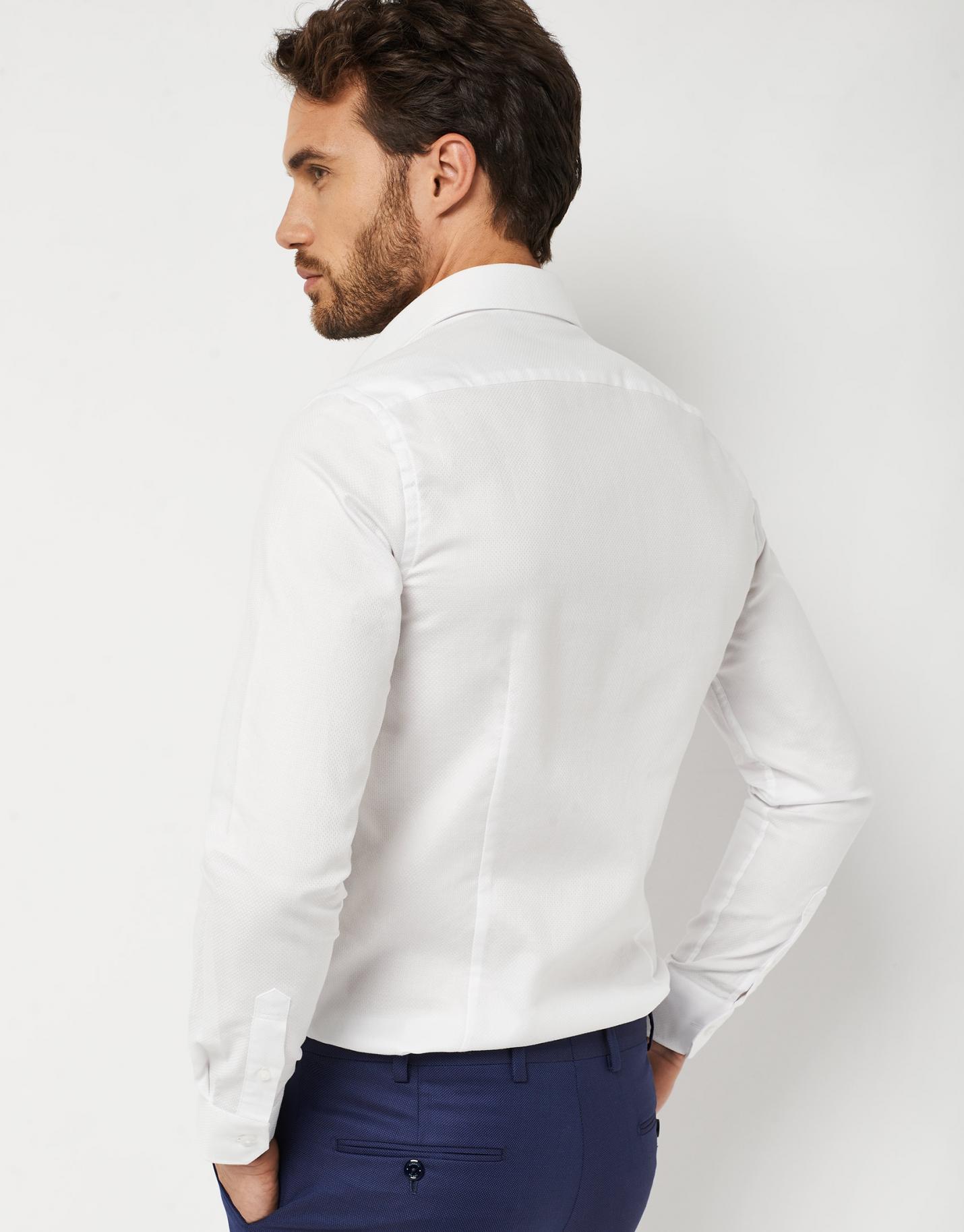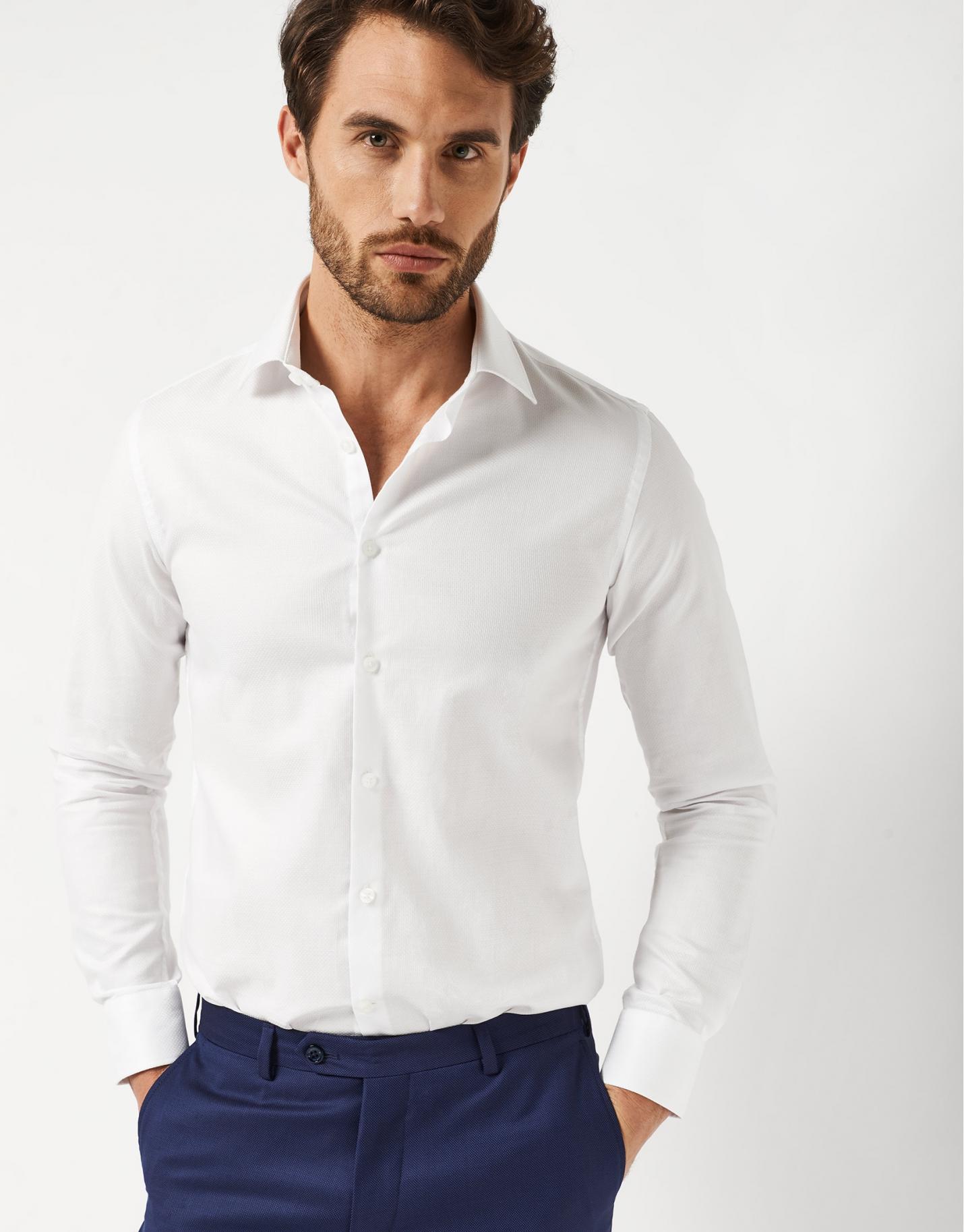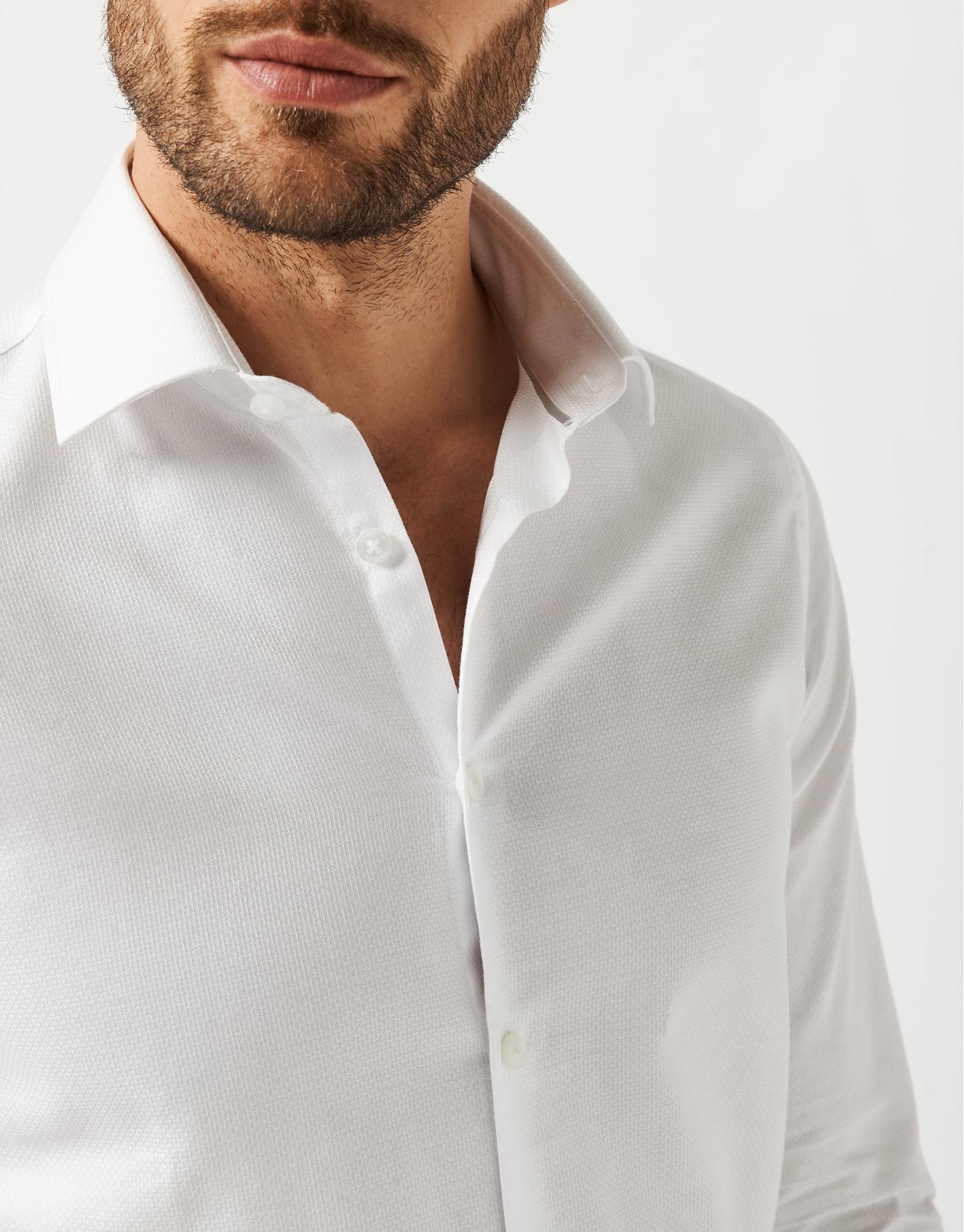Camisa de vestir slim fit confeccionada en algodón easy care de acabado super silky con micro dibujo color blanco. Cuello italiano, cierre mediante botonadura frontal y manga larga terminada en puño abotonado.