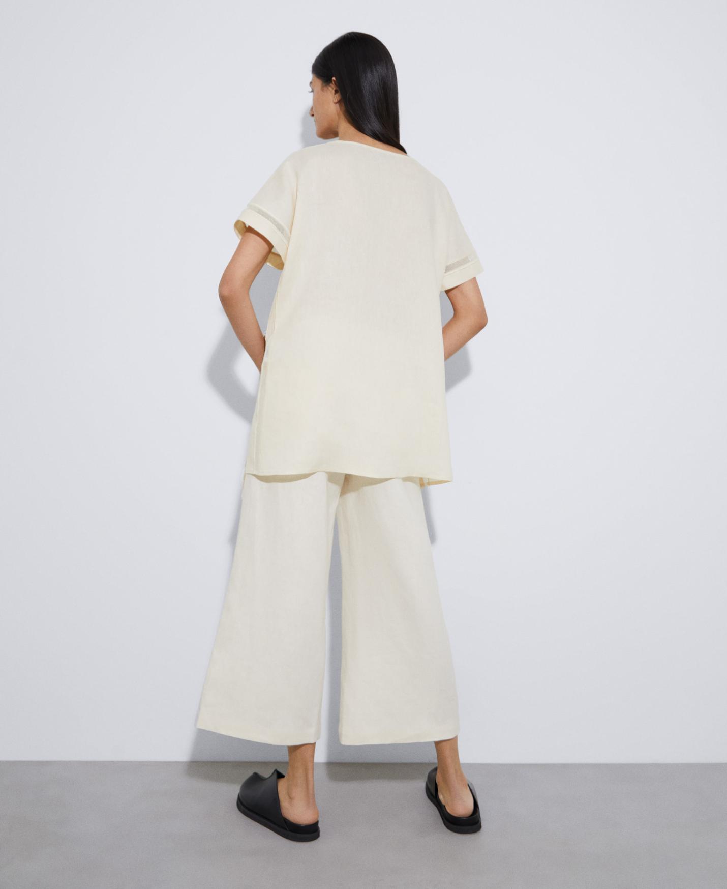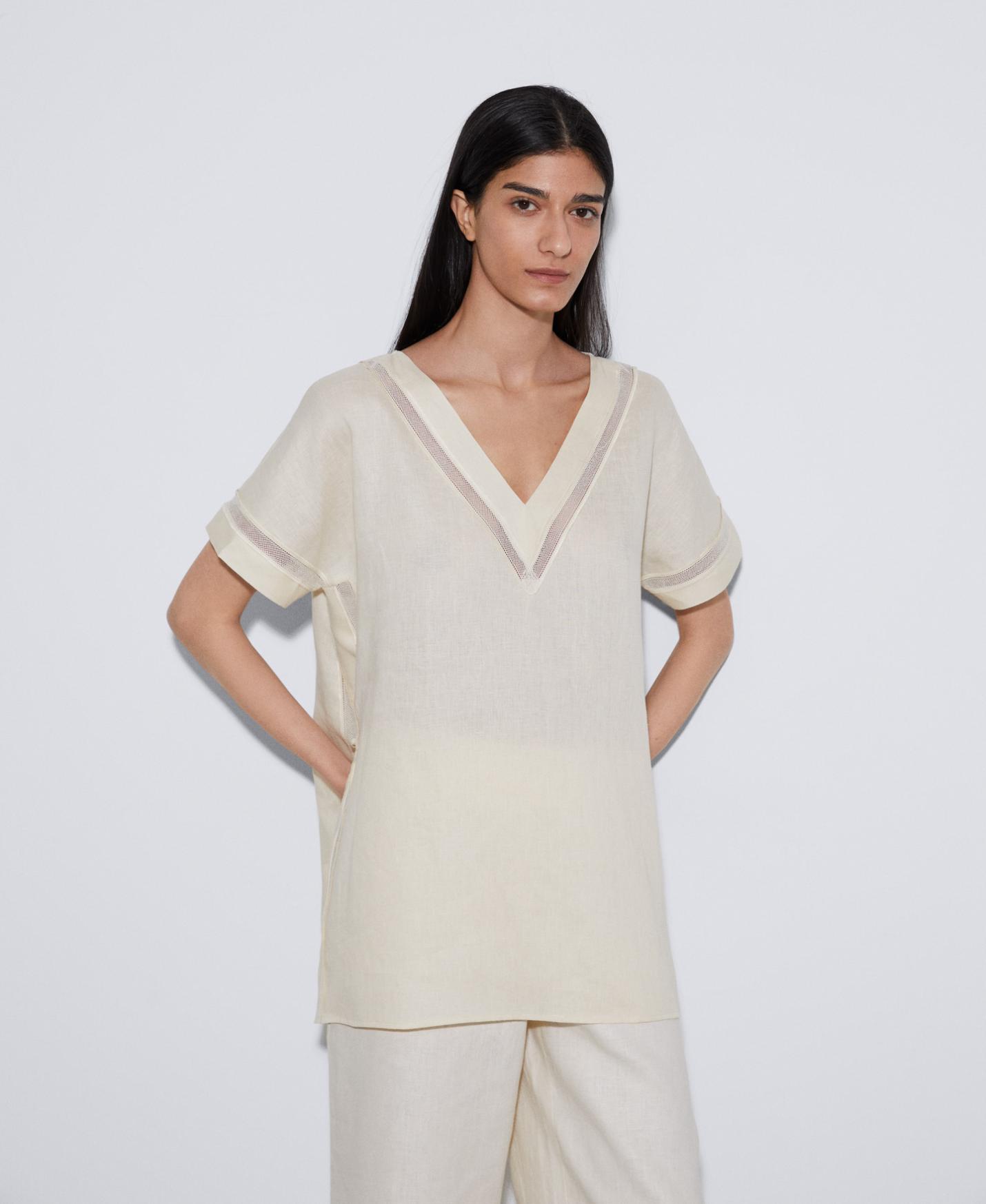 Blusa de manga corta en lino responsable europeo. Cuello pico. Incrustaciones y borlas.