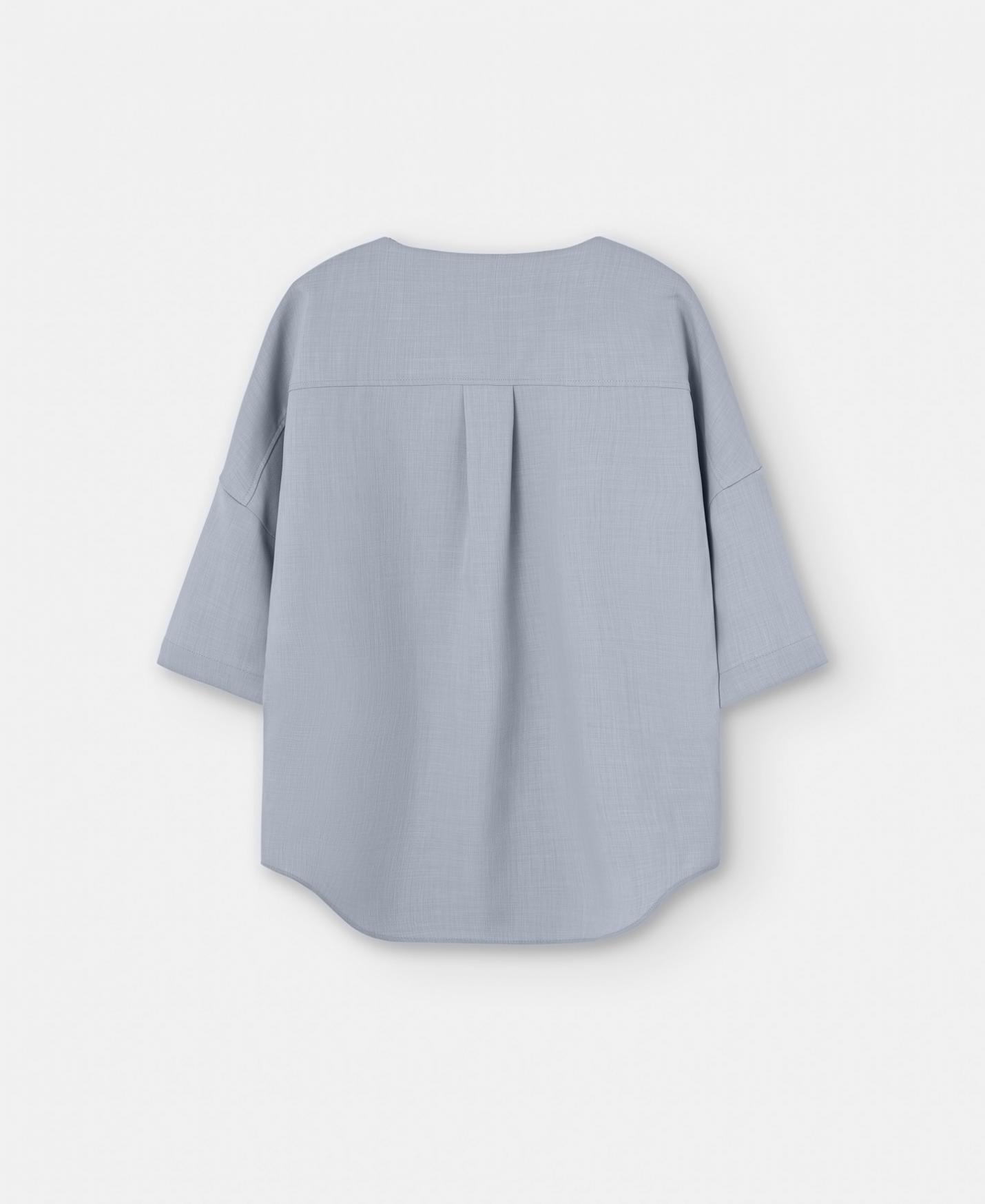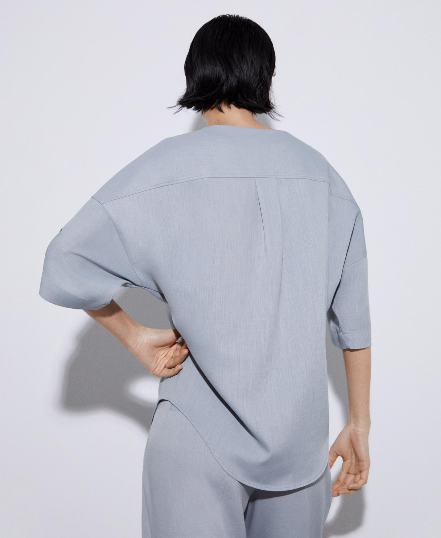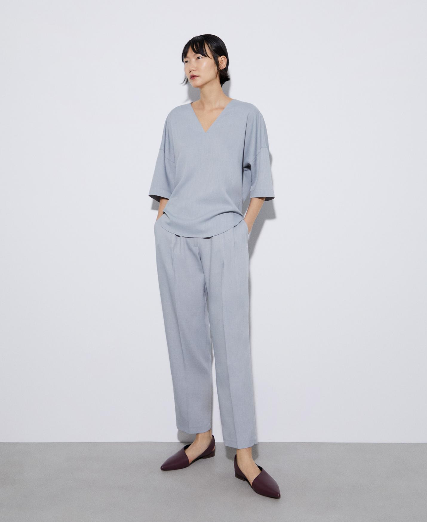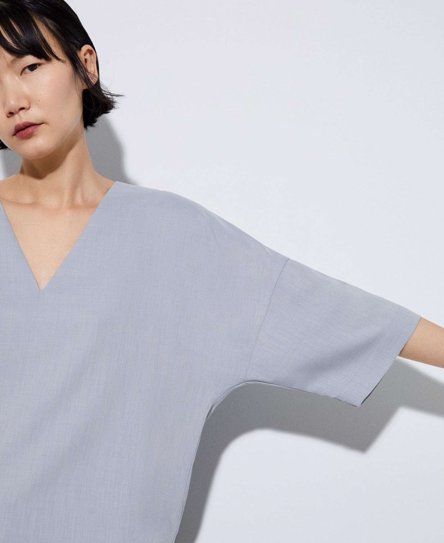 Blusa escote pico en poliéster reciclado. Bajo redondeado. Corte fluido.