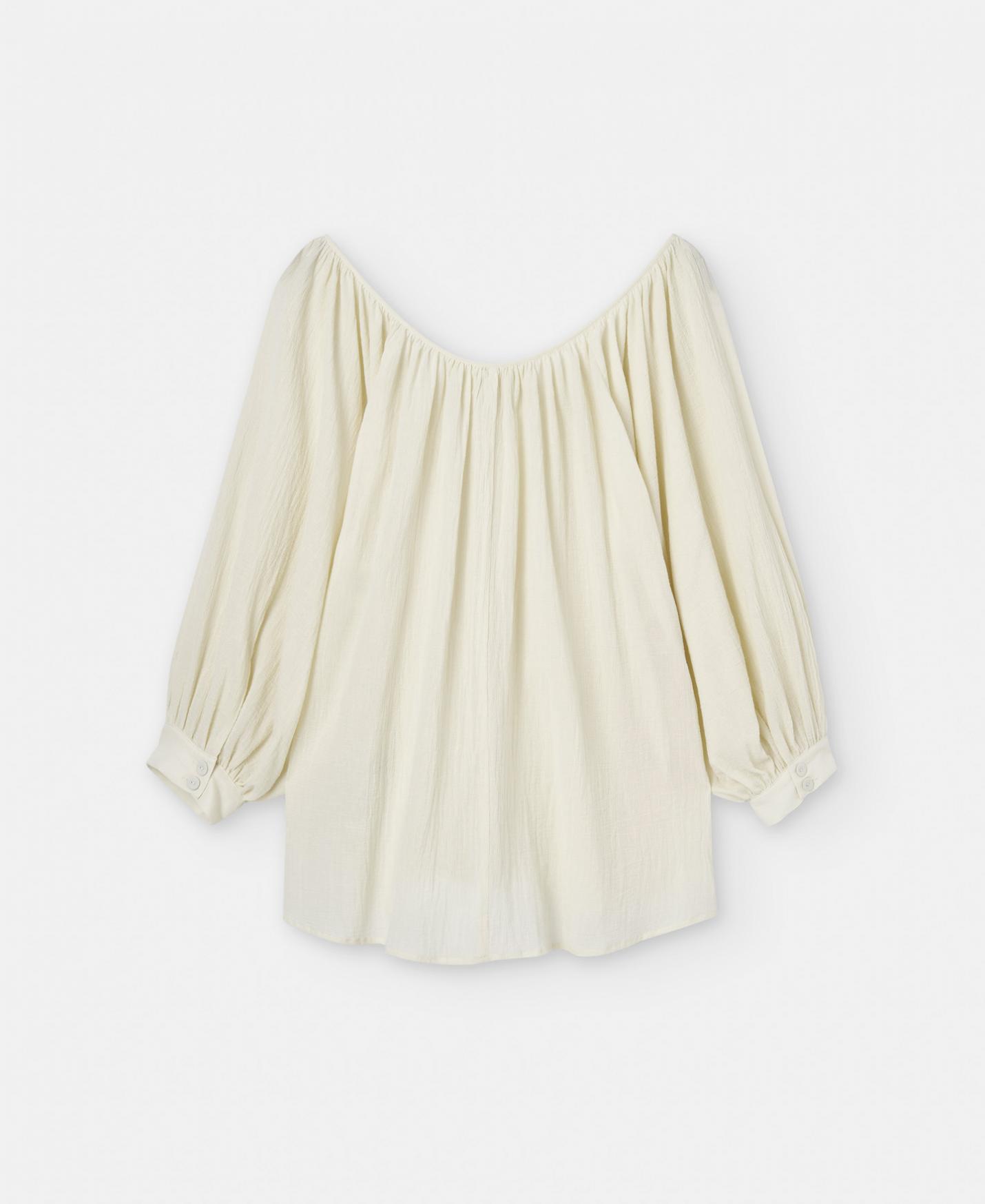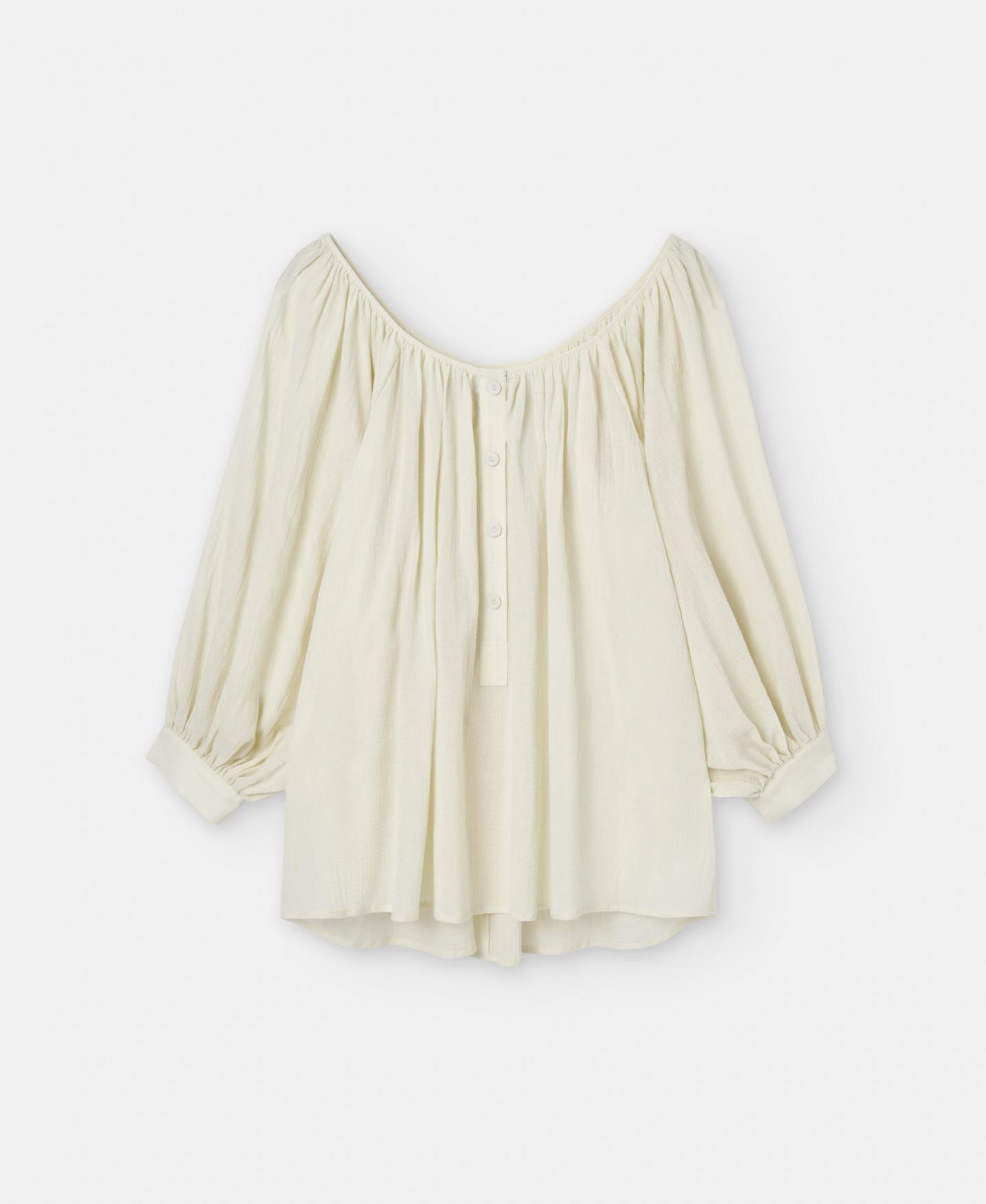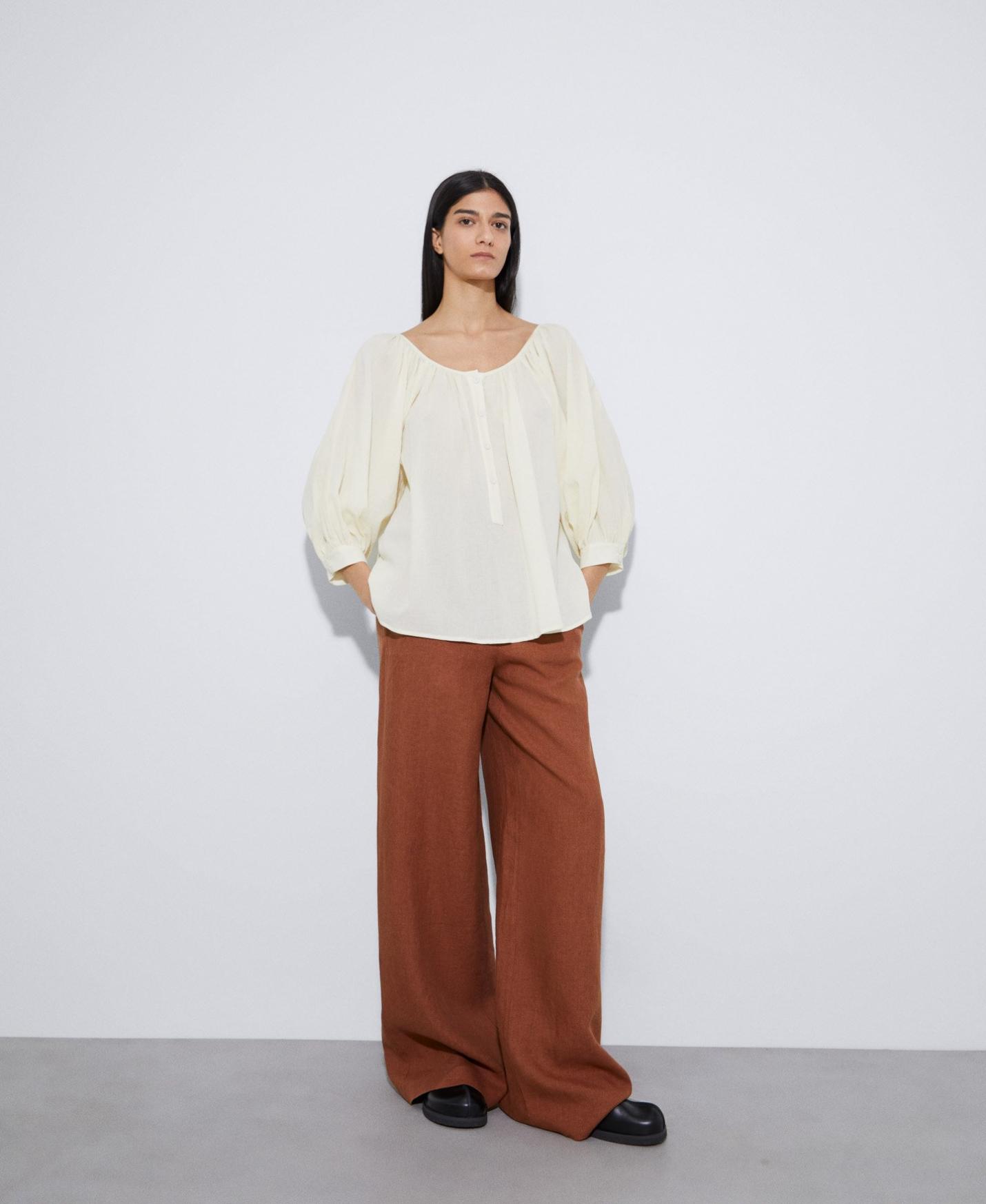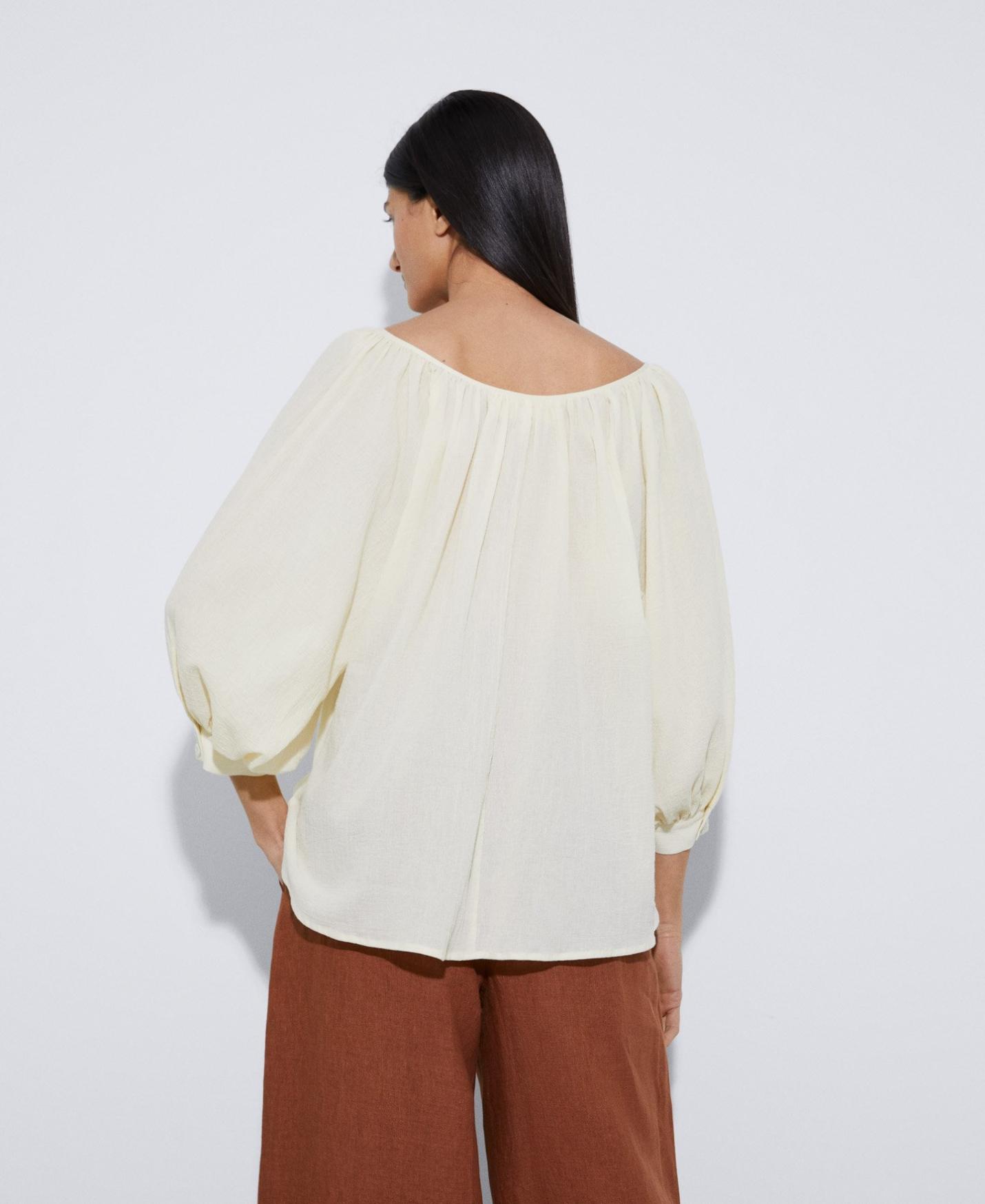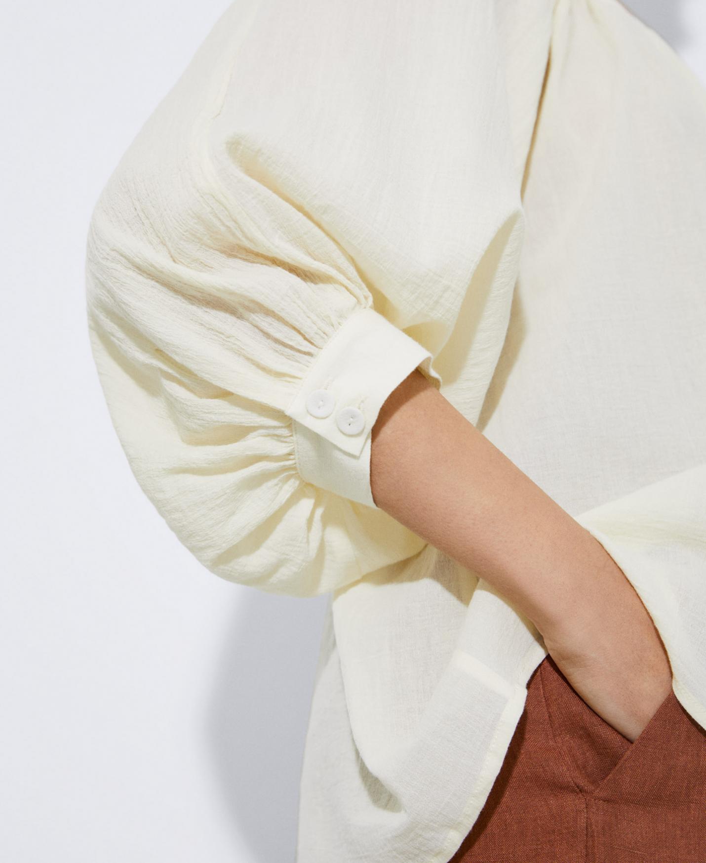 Blusa fruncida en algodón. Con escote caja rematado con un vivo, tapeta frontal con botones forrados y mangas amplias volumétricas cerradas con puño.