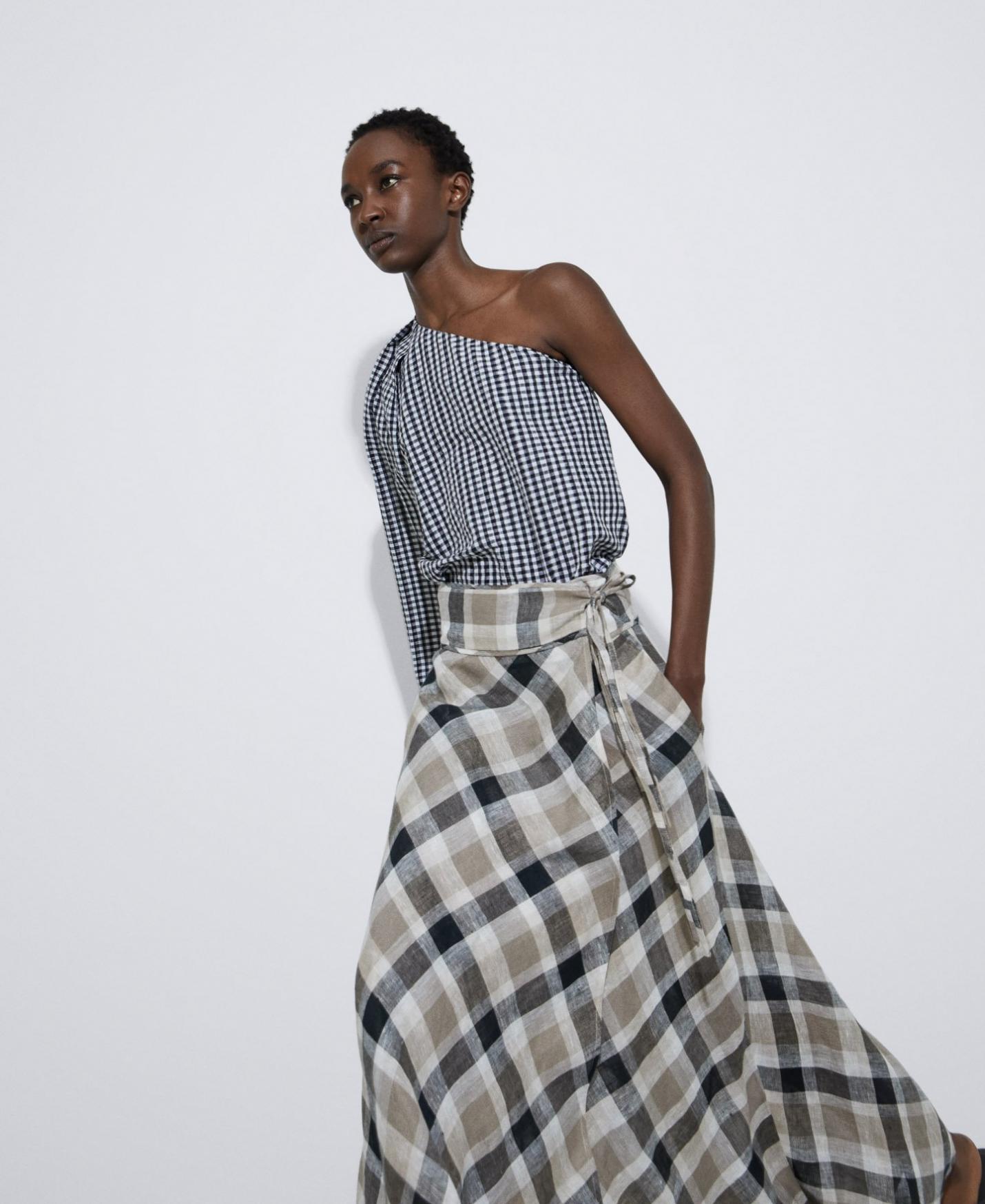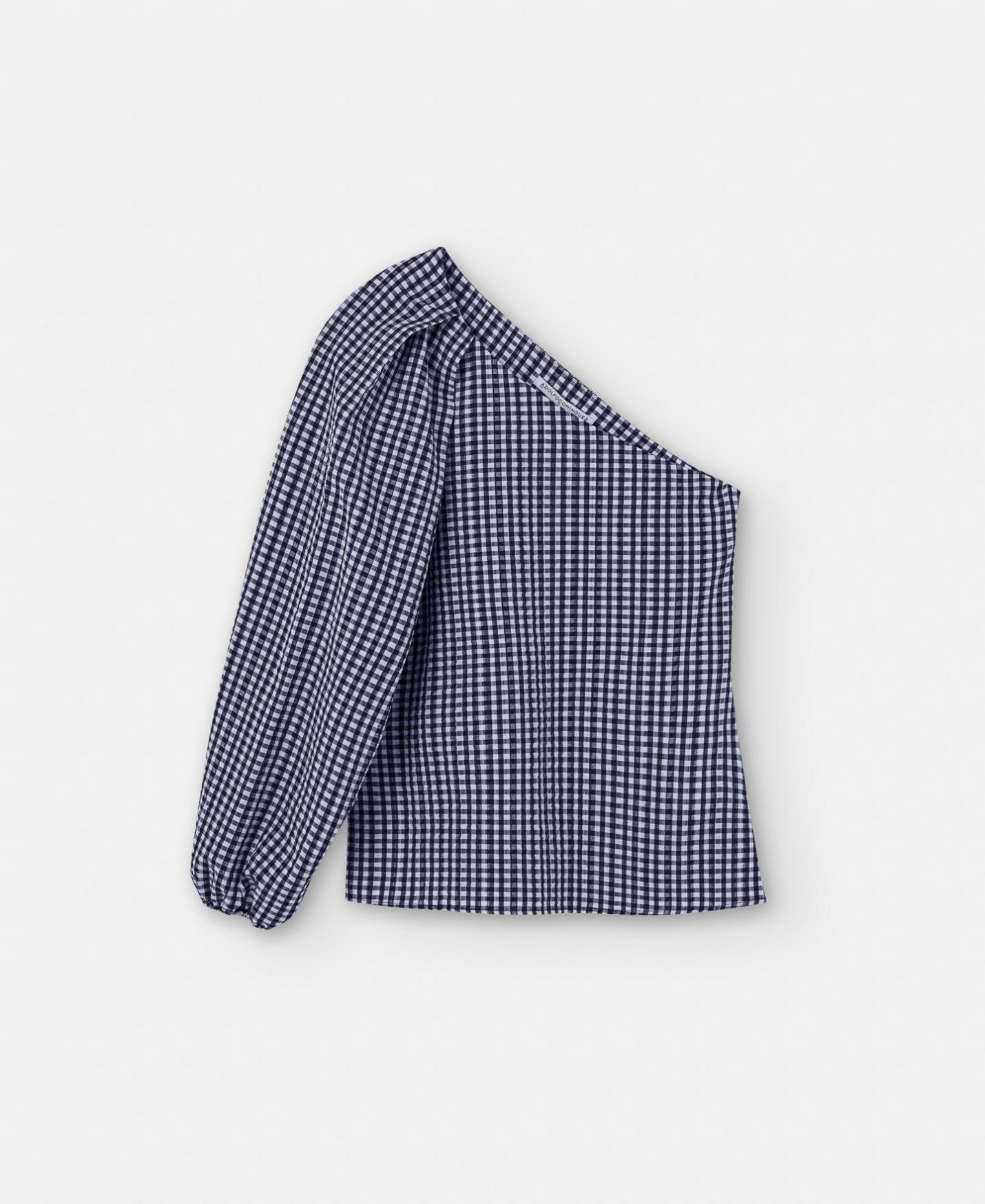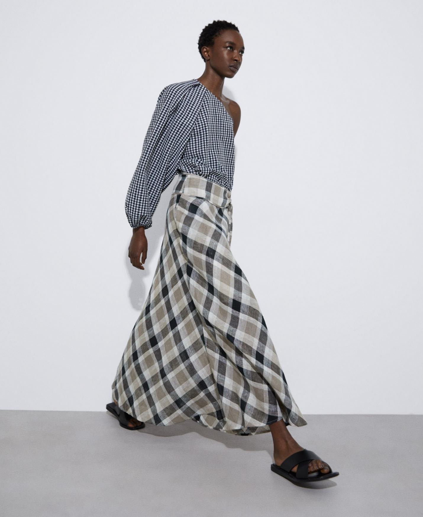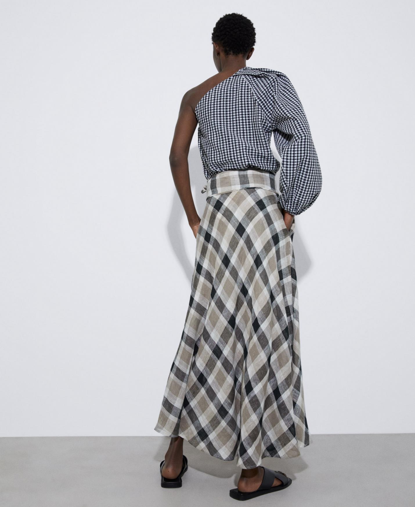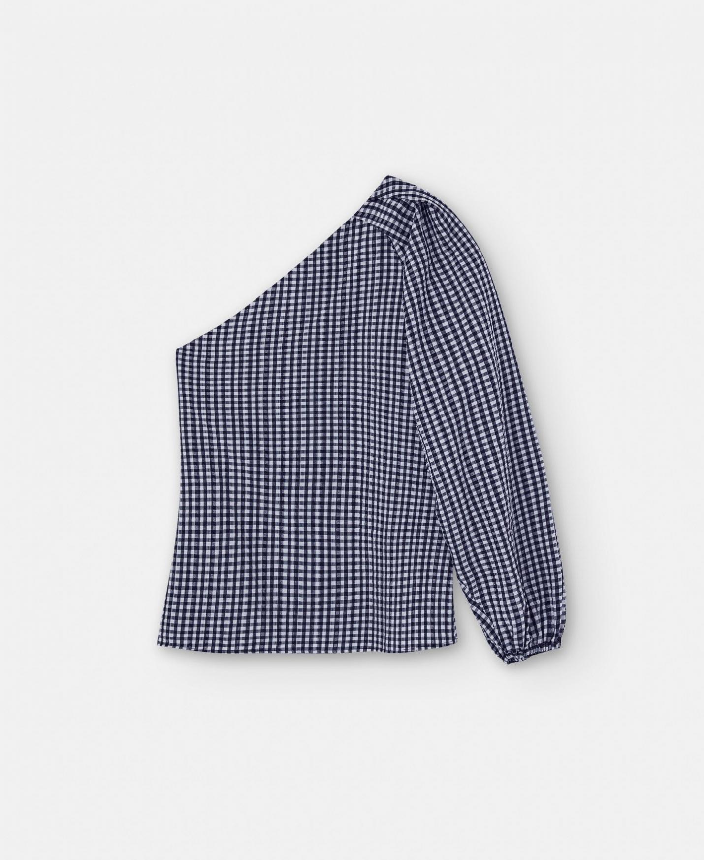 Camisa de cuadros con corte asimétrico. Tiene manga abullonada con pliegues en hombro.