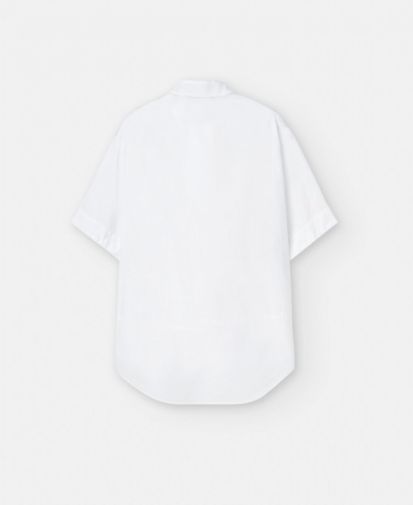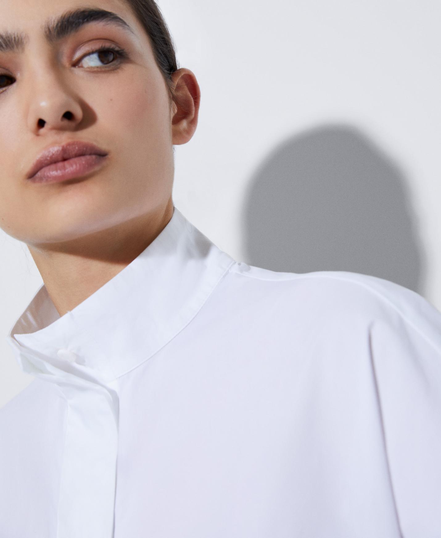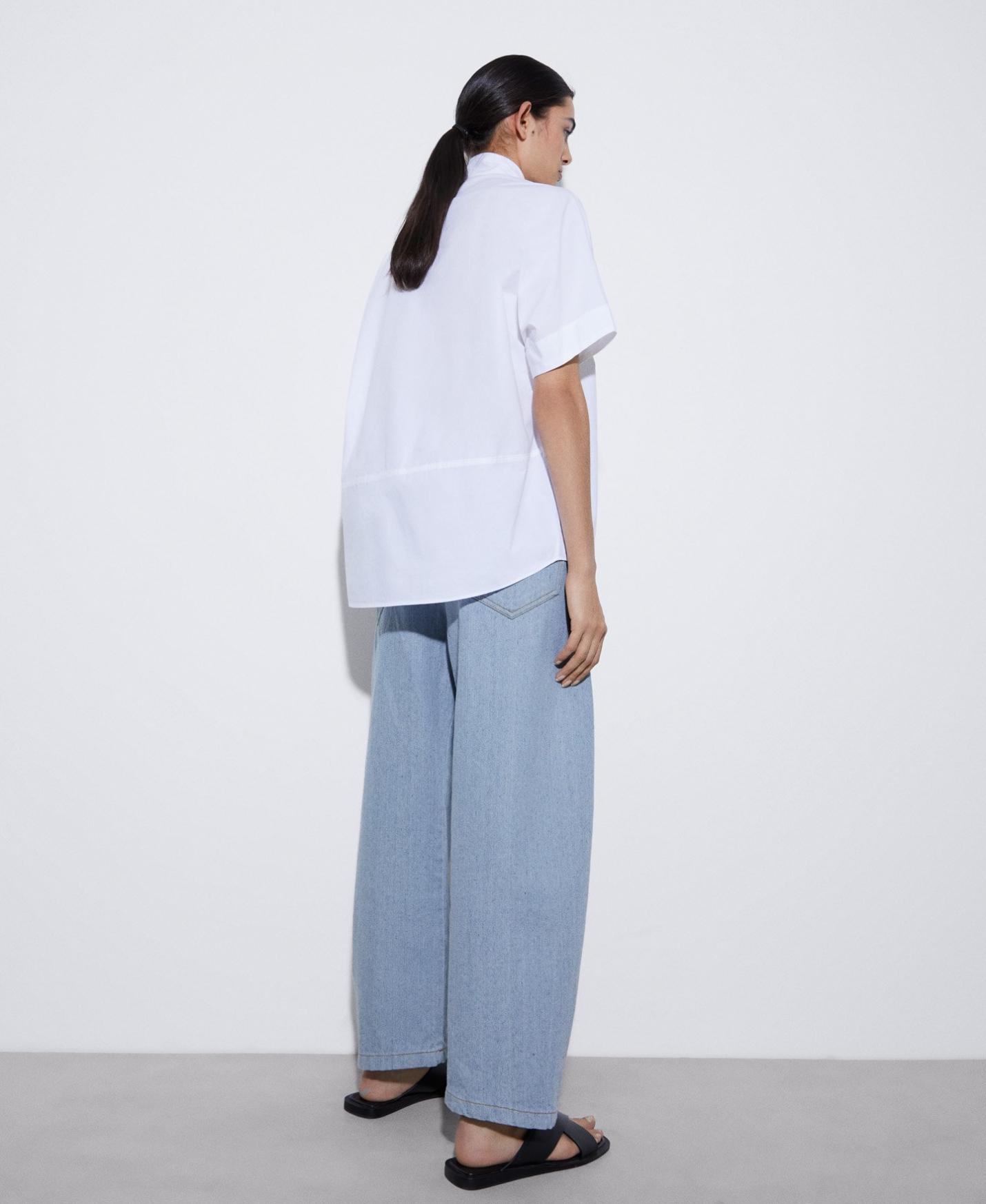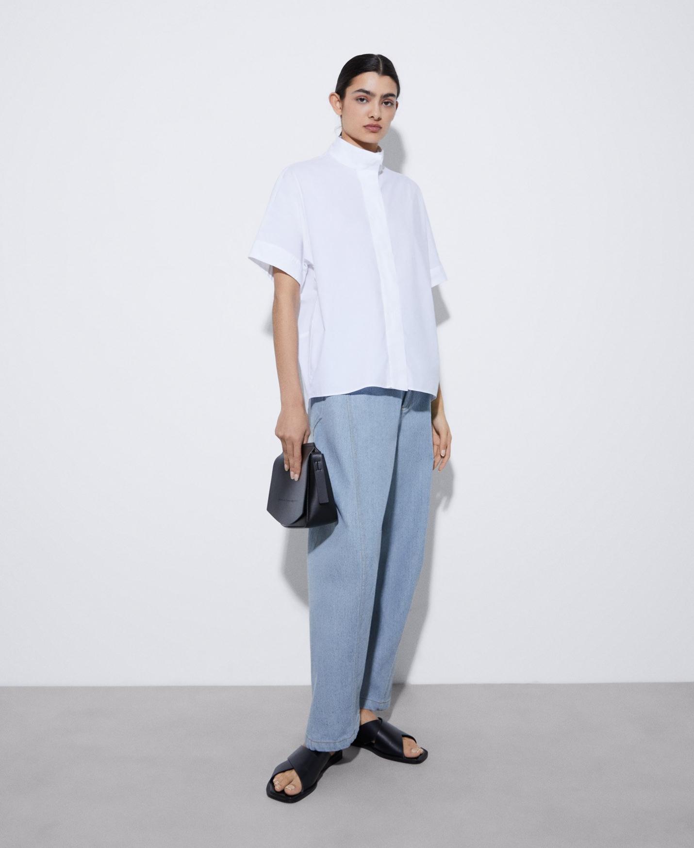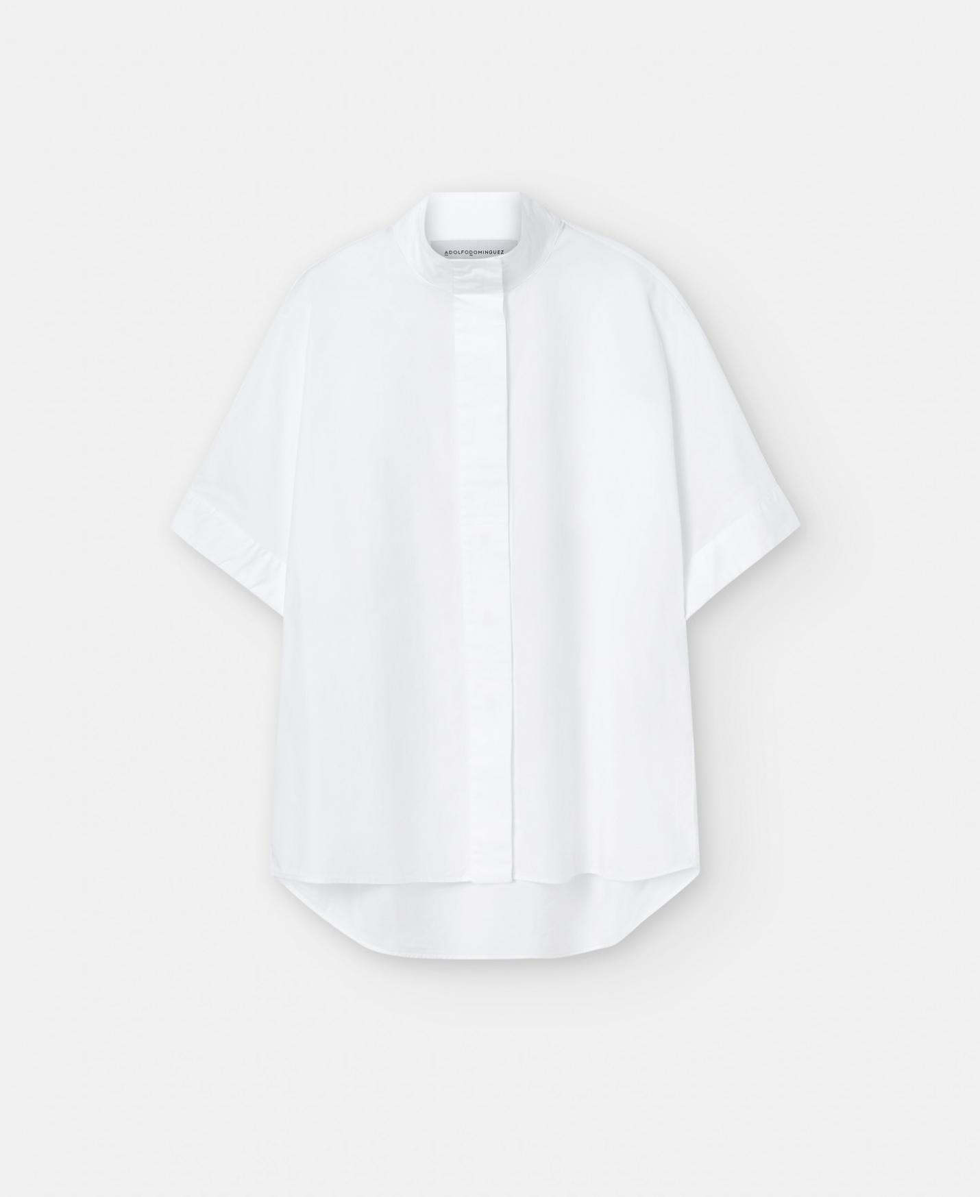 Camisa seersucker en algodón responsable. Manga corta con vuelta, línea redondeada, cuello chimenea. botonadura central con tapeta asimétrica. Efecto tridimensional.