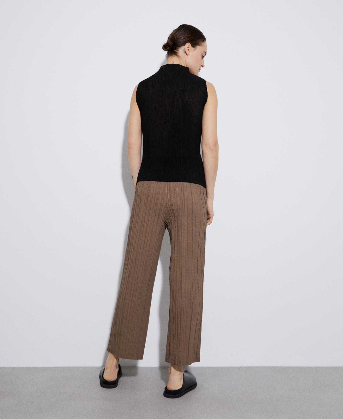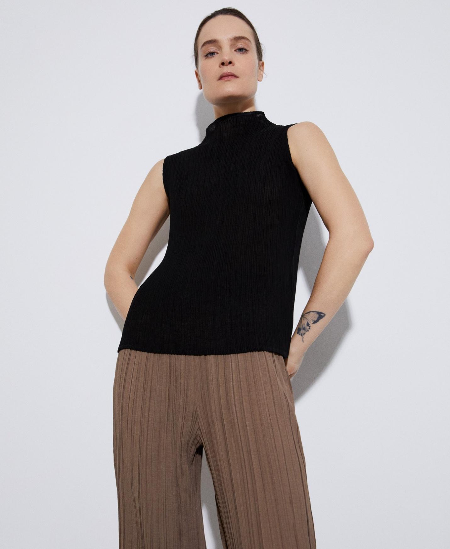 Top cuello perkins en tejido de crinkle continuo, sin costuras. Tiene manga sisa escotada en frontal y espalda.