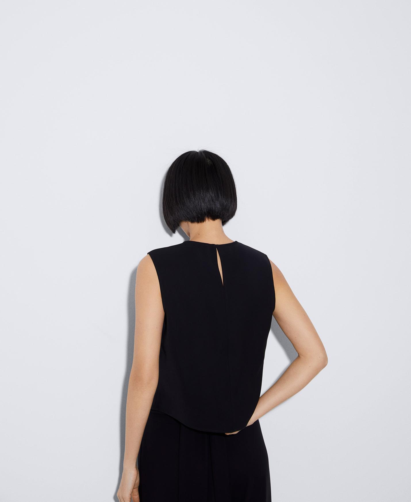 DescripciónRef.217011182121 Top recto en poliéster reciclado. Tiene escote caja, con pestaña y botón oculto en espalda. poliéster reciclado corte recto botón oculto espalda …
