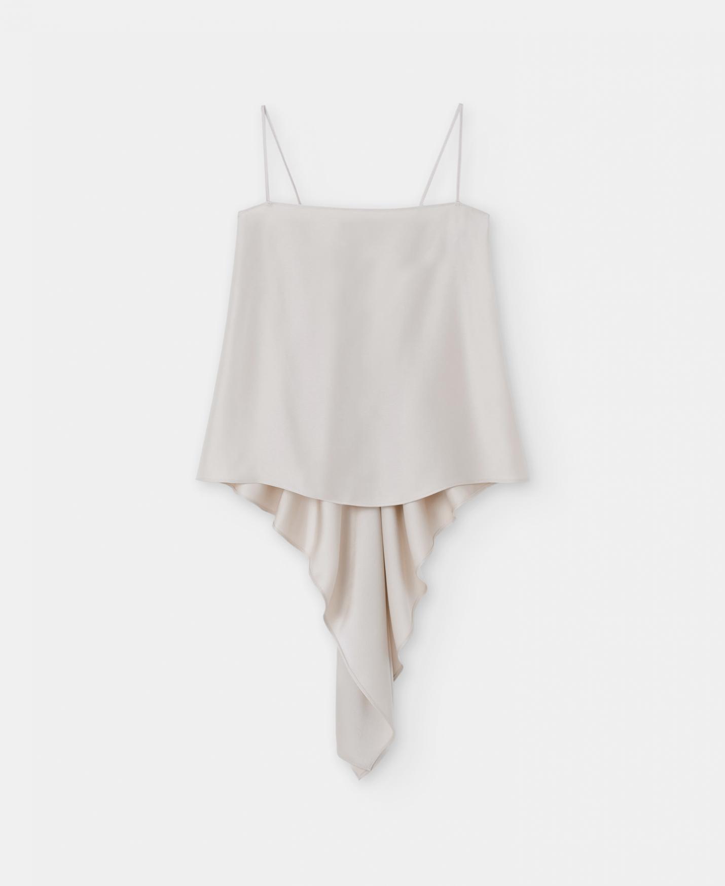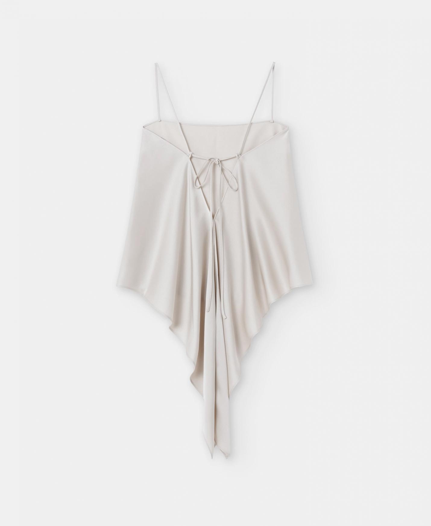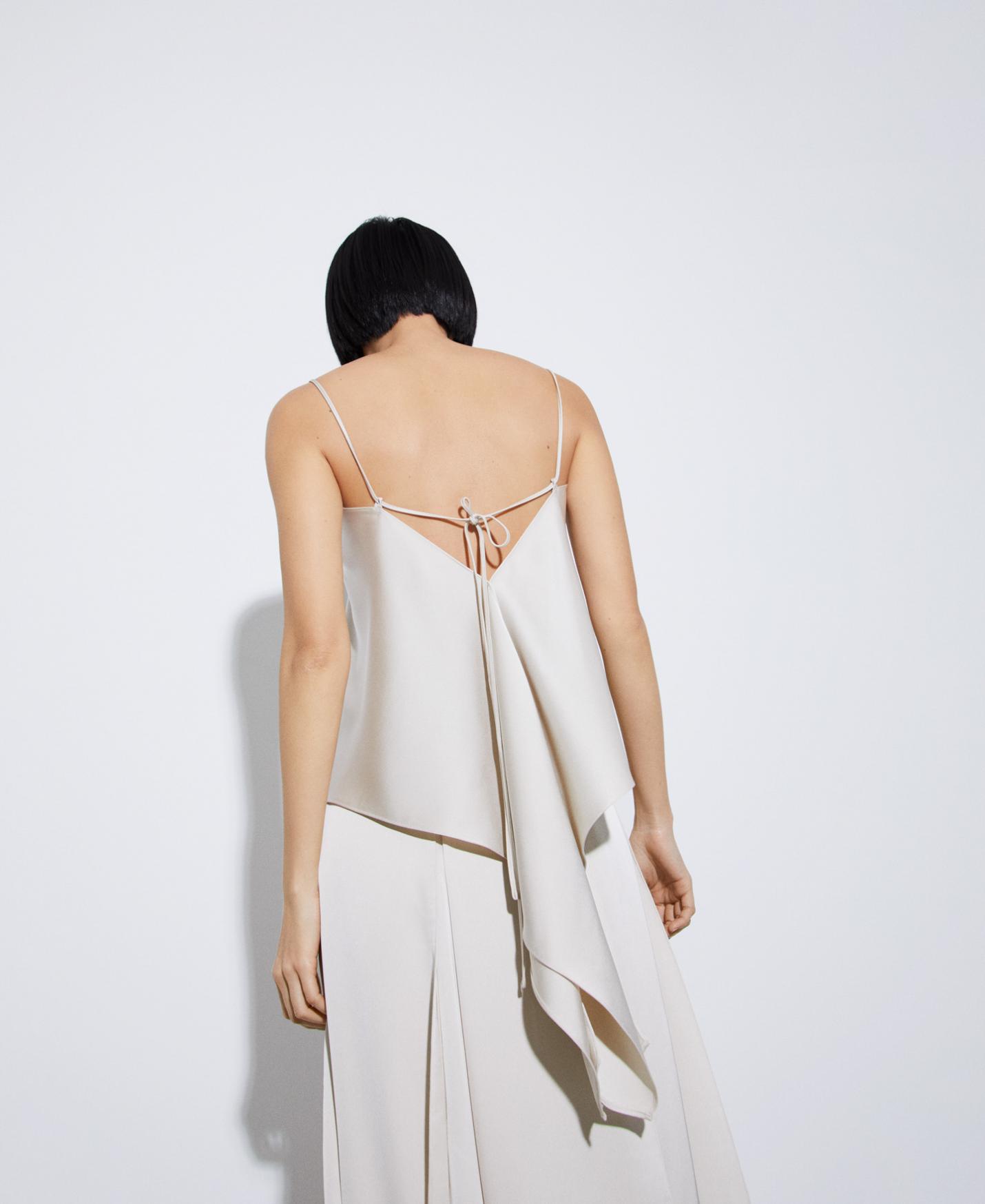 Top tirante fino espalda al aire en poliéster. Caída irregular y corte fluido.