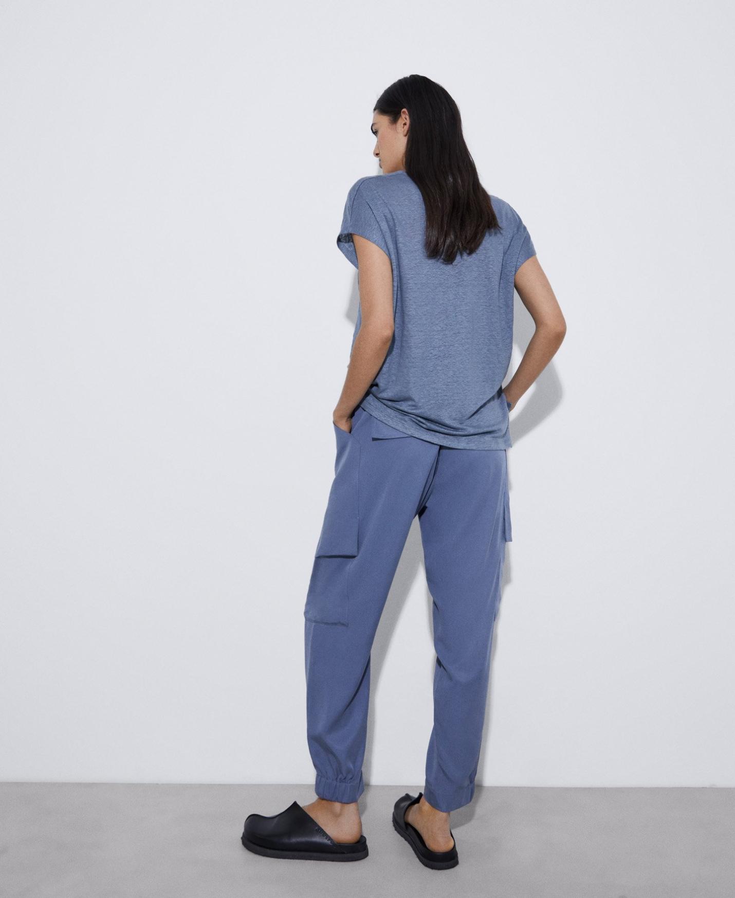 Camiseta escote pico en 100% lino. Tapeta ancha. Sisas caídas. Logo estampado a tono.