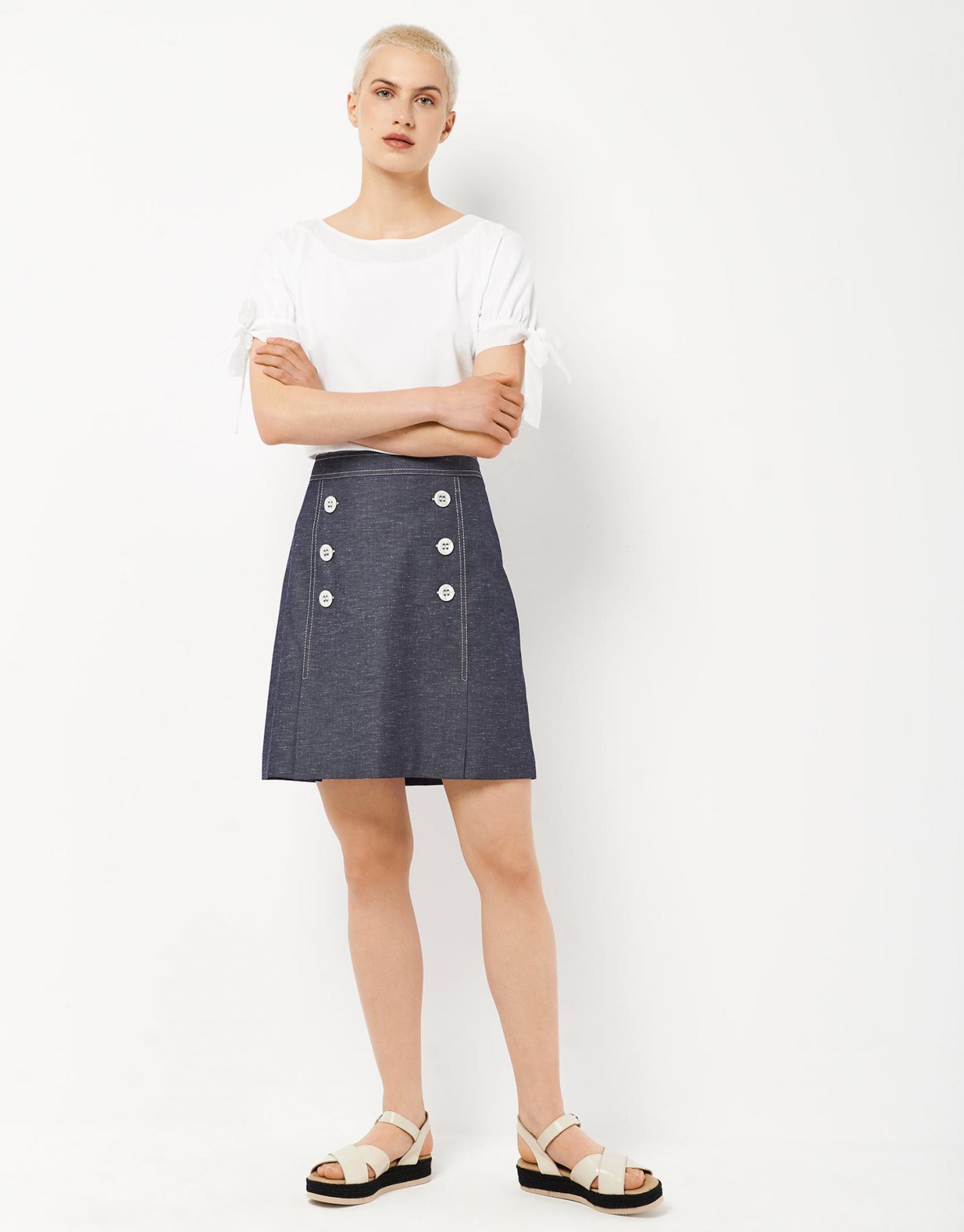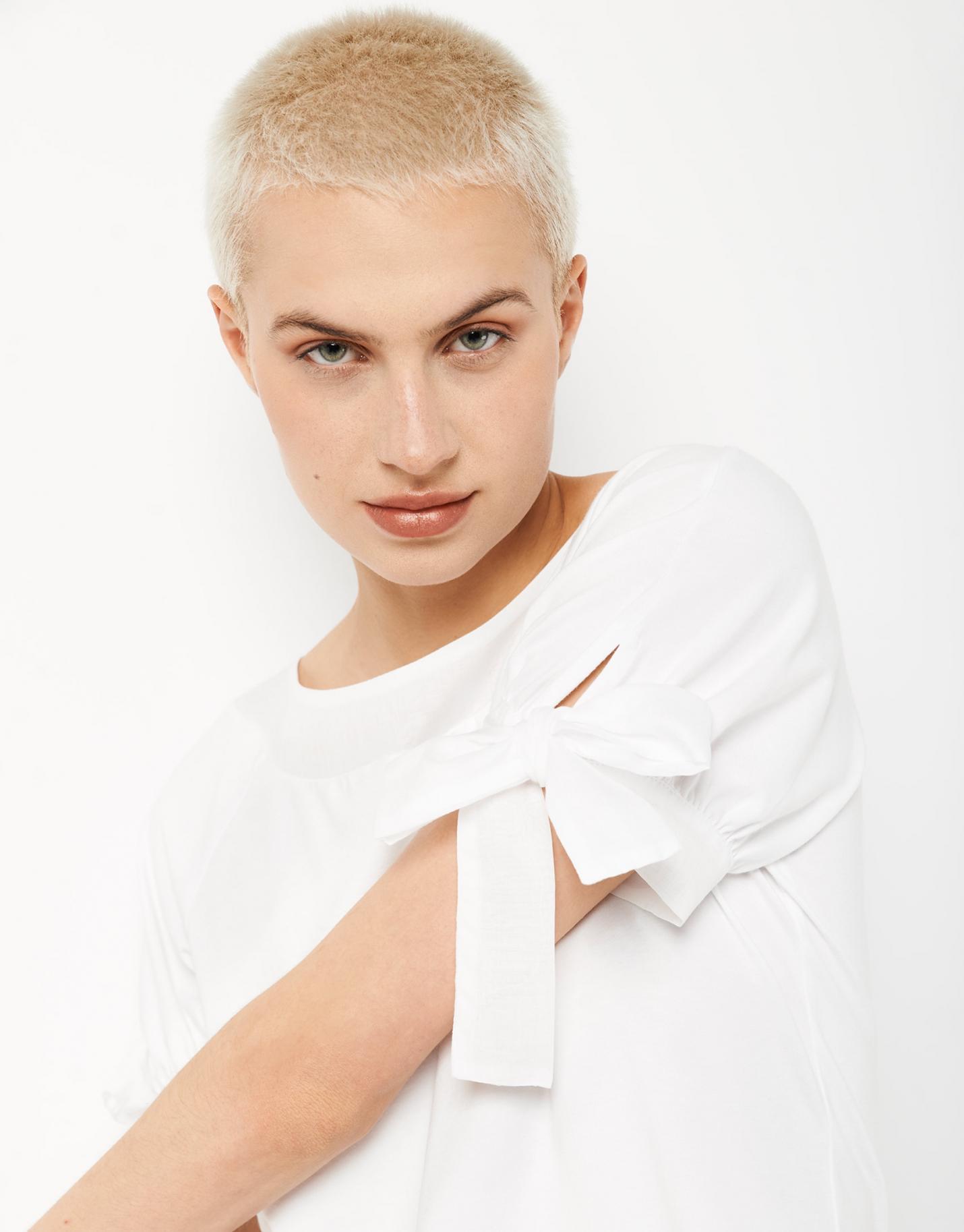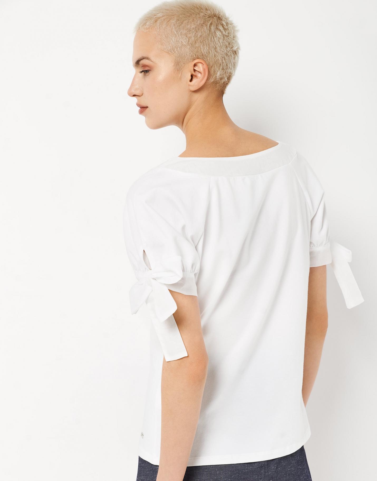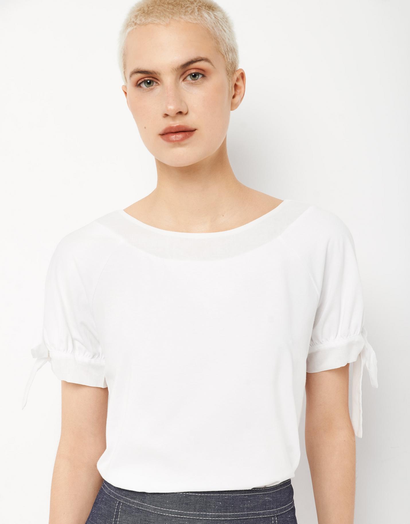 Camiseta de manga corta confeccionada en un algodón color blanco. Escote barco, corte recto y manga ranglán corta rematada en puño con lazada.
