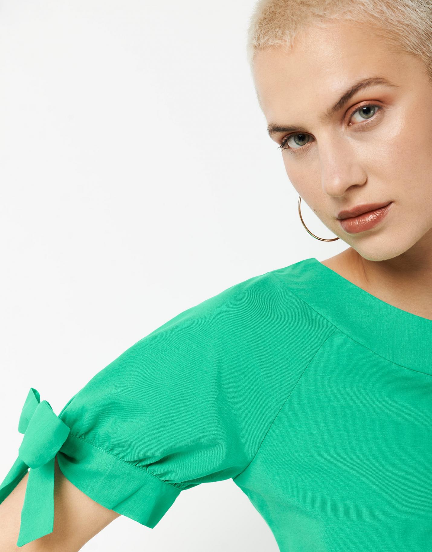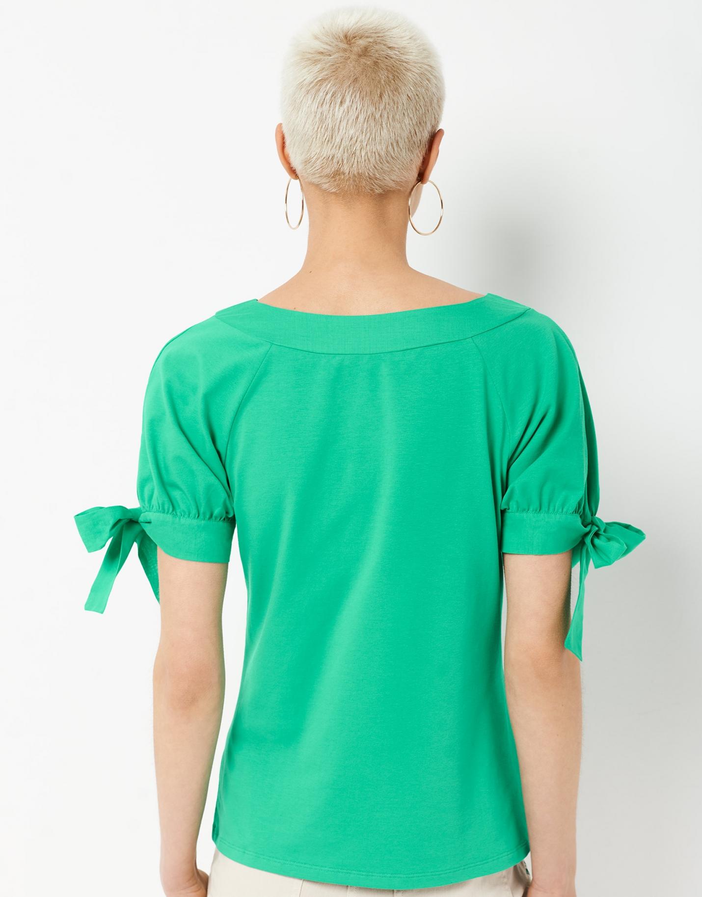 Camiseta de manga corta confeccionada en un algodón color verde. Escote barco, corte recto y manga ranglán corta rematada en puño con lazada.
