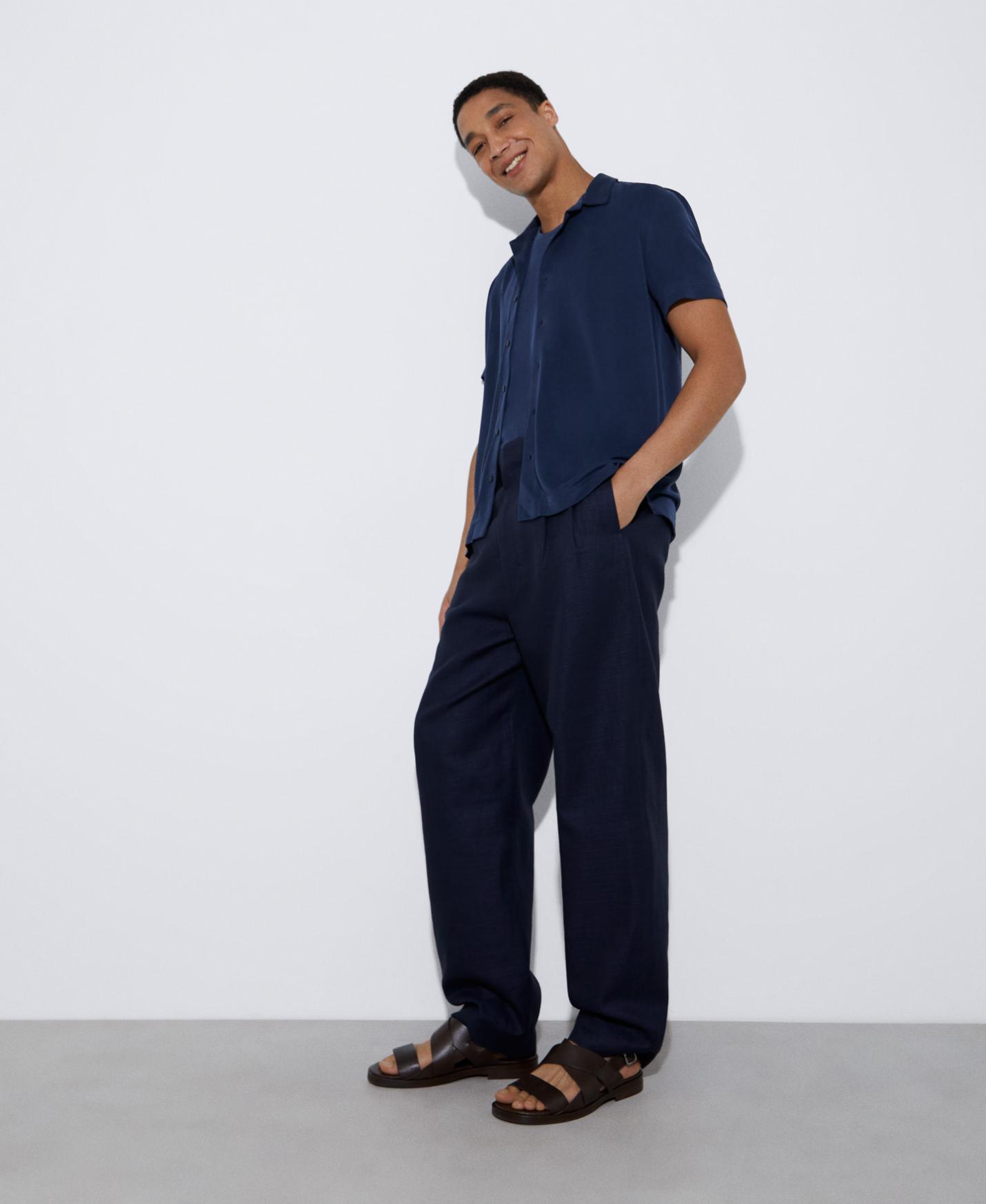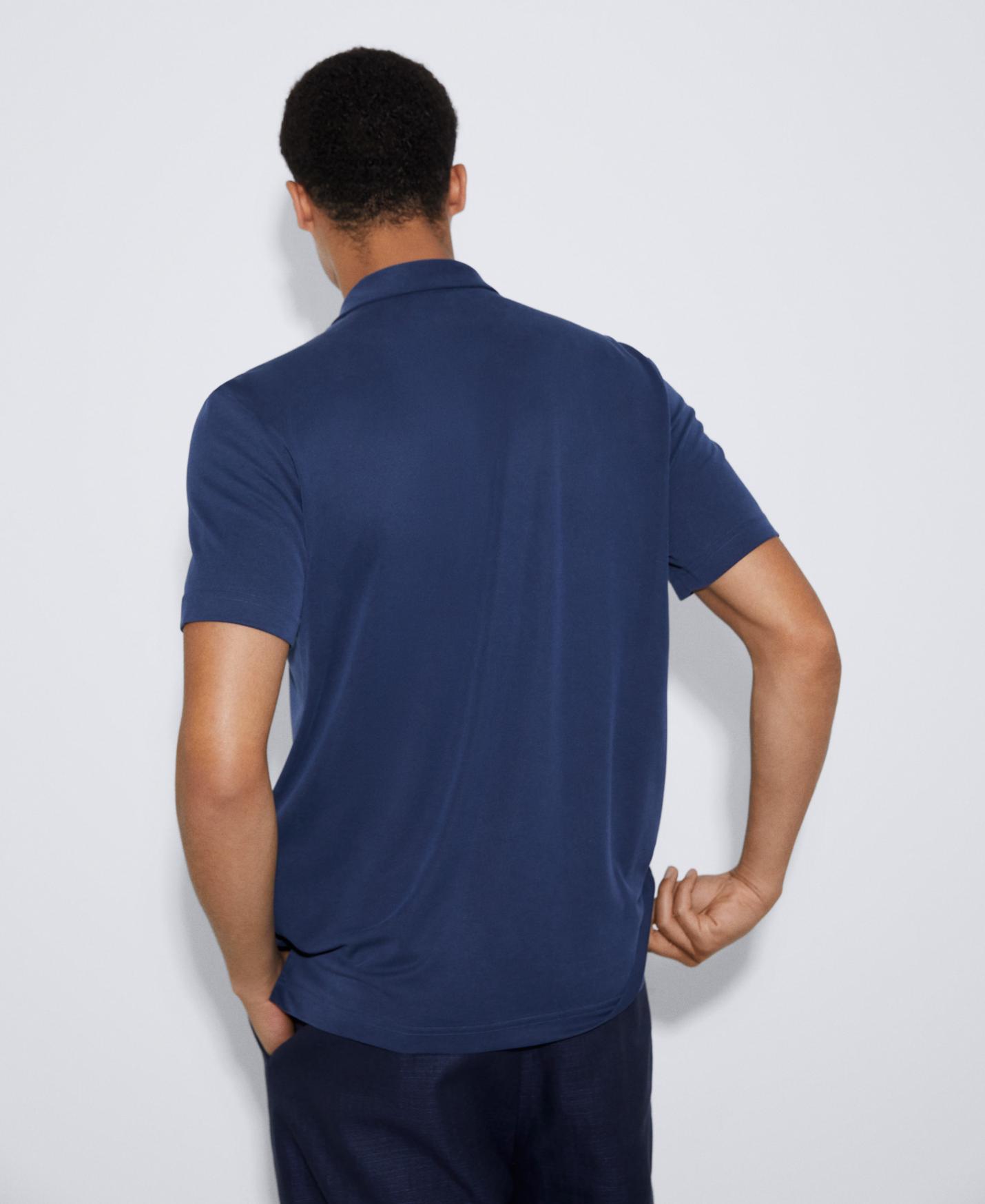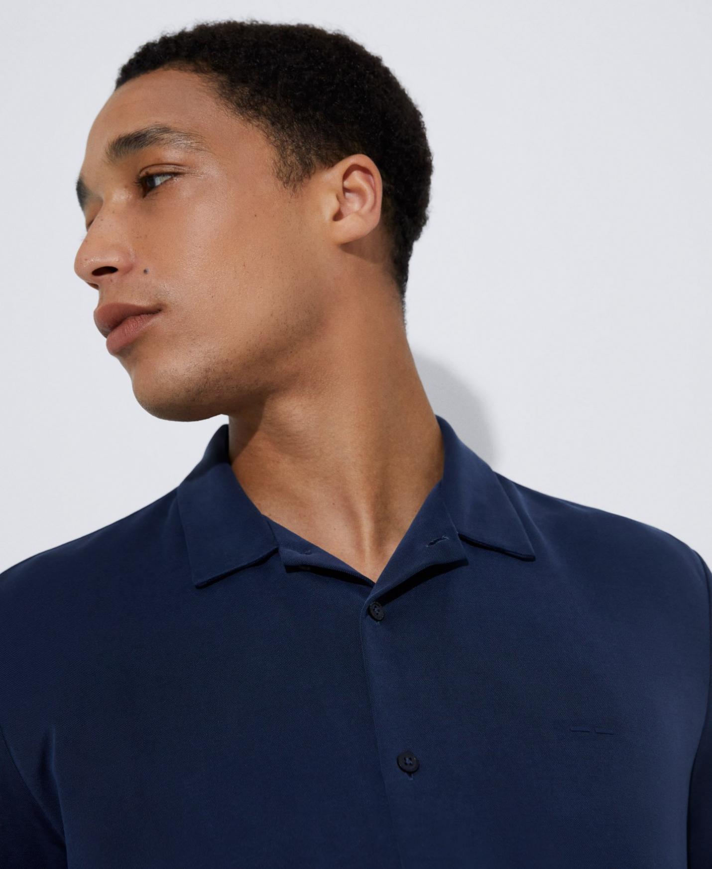 Polo en viscosa responsable de LENZING™. Cuello solapa. botonadura central. Manga corta. Remates en rib.
